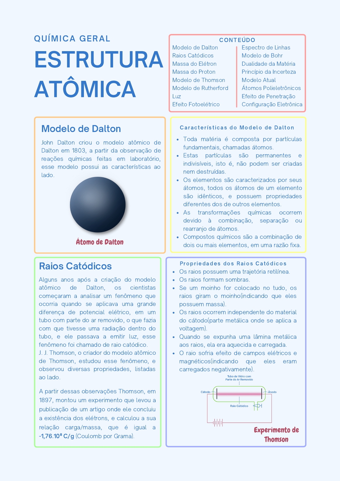 John Dalton criou o modelo atômico de Dalton em 1803, a partir da observação de reações químicas feitas em laboratório, esse modelo possui as características ao lado. Modelo de Dalton ESTRUTURA ATÔMICA QUÍMICA GERAL CONTEÚDO Modelo de Dalton Raios Catódicos Massa do Elétron Massa do Proton Modelo de Thomson Modelo de Rutherford Luz Efeito Fotoelétrico Raios Catódicos Alguns anos após a criação do modelo atômico de Dalton, os cientistas começaram a analisar um fenômeno que ocorria quando se aplicava uma grande diferença de potencial elétrico, em um tubo com parte do ar removido, o que fazia com que tivesse uma radiação dentro do tubo, e ele passava a emitir luz, esse fenômeno foi chamado de raio catódico. J. J. Thomson, o criador do modelo atômico de Thomson, estudou esse fenômeno, e observou diversas propriedades, listadas ao lado. Espectro de Linhas Modelo de Bohr Dualidade da Matéria Princípio da Incerteza Modelo Atual Átomos Polieletrônicos Efeito de Penetração Configuração Eletrônica Toda matéria é composta por partículas fundamentais, chamadas átomos. Estas partículas são permanentes e indivisíveis, isto é, não podem ser criadas nem destruídas. Os elementos são caracterizados por seus átomos, todos os átomos de um elemento são idênticos, e possuem propriedades diferentes dos de outros elementos. As transformações químicas ocorrem devido à combinação, separação ou rearranjo de átomos. Compostos químicos são a combinação de dois ou mais elementos, em uma razão fixa.Átomo de Dalton Caracter ís t icas do Modelo de Dal ton Os raios possuem uma trajetória retilínea. Os raios formam sombras. Se um moinho for colocado no tudo, os raios giram o moinho(indicando que eles possuem massa). Os raios ocorrem independente do material do cátodo(parte metálica onde se aplica a voltagem). Quando se expunha uma lâmina metálica aos raios, ela era aquecida e carregada. O raio sofria efeito de campos elétricos e magnéticos(indicando que eles eram carregados negativamente). Propr iedades dos Ra ios Catódicos A partir dessas observações Thomson, em 1897, montou um experimento que levou a publicação de um artigo onde ele concluiu a existência dos elétrons, e calculou a sua relação carga/massa, que é igual a -1,76.10⁸ C/g (Coulomb por Grama). Experimento de Thomson Exper imento de Mul l ikenMassa do Elétron Após a descoberta da relação carga/massa feita por Thomson, vários cientistas tentaram descobrir os valores individuais de carga e de massa dos elétrons, mas foi somente em 1909 que o cientista Robert Mulliken elaborou um experimento que veio a ser conhecido como Experimento de Mulliken, onde ele usou um cilindro, duas placas carregadas com um furo no meio, um borrifador de óleo, e uma fonte de raio X, para determinar a massa dos elétrons. O experimento consistia na manipulação dos valores de carga aplicada nas placas, até que as gotas de óleo, carregadas devido aos elétrons livres liberados por causa da incidência de raios X nas moléculas de ar, flutuassem, o que ele foi observando com um microscópio posicionado na lateral do cilindro. A partir desse experimento ele observou que para que as gotas flutuassem, a carga nas placas precisava ser um múltiplo de -1,6.10⁻¹⁹ C, que é a carga de um elétron, a partir desse valor, e utilizando a relação proposta por Thomson, ele também descobriu que a massa do elétron é de 9,11.10⁻²⁸ g. Massa do Protón Com a criação de um aparelho chamado espectrômetro de massa, que é utilizado para separação de espécies químicas com base na massa, através da ionização do material por choque de elétrons(removendo um elétron) e aceleração deste material por um campo magnético, foi possível obter a relação carga/massa de um próton (9,63.10⁴ C/g), realizando este processo com gás Hidrogênio, já que o desvio do íon ao passar pelo aparelho é dado pela relação carga/massa (e o íon H⁺ é um próton). Modelo de Thomson O modelo atômico de Thomson, criado em 1898, baseado nos seus experimentos com raios catódicos, nos quais ele descobriu os elétrons, dizia que o átomo era uma esfera de carga positiva, com as partículas negativas(elétrons) espalhadas na sua superfície. Modelo de Rutherford O cientista Ernest Rutherford queria analisar o comportamento dos átomos, então ele criou uma experiência na qual ele utilizava uma fonte de radiação α, uma folha de ouro, e um anteparo que fosse capaz de detectar essa radiação, para analisar como a folha de ouro afetava a trajetória da radiação, e com isso ele observou que nem todos os raios chegaram ao anteparo, e que a maioria deles teve sua trajetória desviada. A partir dessas observações ele fez , em 1911, uma atualização ao modelo de Thomson, dizendo que os átomos possuíam núcleos, onde suas cargas positivas estavam concentradas, e por isso alguns feixes de radiação α eram desviados quando passavam mais perto do núcleo, e que as cargas negativas estavam espalhadas de maneira difusa em torno desse núcleo. Átomo de Thomson Átomo de Rutherford Luz O conceito de luz é muito importante na análise da estrutura atômica, então o que é luz? A luz que nós vemos é um tipo de radiação eletromagnética, que possui natureza ondulatória e é capaz de transportar energia pelo espaço. Como toda onda nós podemos analisar as ondas eletromagnéticas a partir da Amplitude (A) do Comprimento de Onda (λ) e da Frequência (v). No espectro eletromagnético a luz visível corresponde às ondas entre 400 e 750 nm de comprimento de onda, entre a região infravermelho e a ultravioleta. O estudo da luz é importante porque a luz já têm energia (a energia das ondas eletromagnéticas é inversamente proporcional ao comprimento de onda) o suficiente para fazer com que os elétrons transitem entre camadas de valência, o que leva à liberação de luz visível. Catástrofe do Ul t rav 