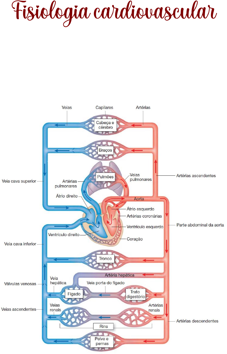 Daniela Luiza Dorini – Farmácia – Fisiologia Humana ‒ O sistema cardiovascular é constituído pelo coração, vasos sanguíneos e o sangue. ‒ Os vasos sanguíneos são as artérias (partem do coração) e as veias (chegam ao coração). ‒ O coração funciona como uma bomba, é dividido verticalmente, por uma parede, os septos, em metades esquerda e direita. ‒ Cada metade é dividida horizontalmente, em um átrio e um ventrículo. o Os átrios recebem o sangue das veias. o Os ventrículos bombeiam o sangue para as artérias. ‒ Circulação pulmonar – do átrio direito o sangue flui para o ventrículo direito, de onde é bombeado pelas artérias pulmonares para os pulmões, onde é oxigenado. A partir dos pulmões o sangue vai, pelas veias pulmonares para átrio esquerdo do coração. o Compreende – vasos que vão do ventrículo direito par o pulmão e que voltam para o átrio esquerdo. ‒ Circulação sistêmica – o sangue que chega dos pulmões pelo átrio esquerdo passa para o ventrículo esquerdo, sendo bombeado pela artéria aorta que se ramifica para todo o corpo até atingirem uma rede de capilares, após deixar os capilares o sangue segue pela pelas veias que vão ficando cada vez mais calibrosas. A veia cava Daniela Luiza Dorini – Farmácia – Fisiologia Humana superior drena todo o sangue da parte superior do corpo, e a veia cava inferior drena todo o sangue da parte inferior do corpo, as duas veias cavas desembocam no átrio direito. o Compreende – vasos sanguíneos que vão do ventrículo esquerdo para os tecidos e que voltam para o coração até o átrio direito. REVISÃO ANATÔMICA CARDIOVASCULAR Daniela Luiza Dorini – Farmácia – Fisiologia Humana CORAÇÃO O coração possui valvas que asseguram um fluxo unidirecional do sangue no coração. Dois conjuntos de valvas: 1. Valvas atrioventriculares – entre os átrios e os ventrículos a. Valva AV direita (tricúspide) – possui três folhetos ou cúspides. b. Valva AV esquerda (bicúspide ou valva mitral) – possui dois folhetos ou cúspides. 2. Valvas semilunares – entre os ventrículos e as artérias, ambas com três folhetos. a. Valva aórtica – VE e aorta. b. Valva pulmonar – VD e tronco pulmonar. Daniela Luiza Dorini – Farmácia – Fisiologia Humana SISTEMA ELÉTRICO DO CORAÇÃO ‒ A comunicação elétrica no coração começa com um potencial de ação em uma célula auto excitável. ‒ O nodo sinoatrial (1) inicia um impulso elétrico que se espalha pelos átrios: o Pelos feixes internodais posterior (5), médio (4) e anterior (3), até o nodo Atrioventricular (6). o Pelo feixe interatrial anterior ou Bachmann (2) até o átrio esquerdo. Esses eventos levam as contrações dos mesmos. ‒ Do nodo AV (6), o impulso parte pelo feixe AV comum ou feixe de His (7) e se espalha para: ‒ O ramo direito (8) do feixe His que levará o impulso às fibras de Purkinge (12) que o espalhará por todo ventrículo direito. Daniela Luiza Dorini – Farmácia – Fisiologia Humana ‒ O ramo esquerdo (9) do feixe His levará o impulso pela divisão ântero superior esquerda (10) e póstero inferior esquerda (11) também as fibras de Purkinge (12) que o espalhará por todo ventrículo esquerdo. ‒ Esses eventos finais levarão a contração dos ventrículos e ejeção do sangue através das valvas semilunares. 1 – Nó sinoatrial 2 – Feixe de Bachman 3 – Feixe internodal anterior 4 – Feixe internodal médio 5 – Feixe internodal posterior 6 – Nó atrioventricular 7 – Feixe de His ou feixe AV comum 8 – Ramo direito 9 – Ramo esquerdo 10 – Divisão ântero superior esquerda 11 – Divisão póstero inferior esquerda. 12 – Fibras de Purkinge Daniela Luiza Dorini – Farmácia – Fisiologia Humana CONDUÇÃO ELÉTRICA NO CORAÇÃO CICLO CARDÍACO ‒ O ciclo cardíaco compreende os eventos que ocorrem entre o icício de um batimento e o início do próximo. ‒ O ciclo é iniciado pela geração espontânea de um potencial de ação no nó sinoatrial. ‒ Possui duas fases: diástole (pressão normal: 80 mmHg), período em que o musculo cardíaco relaxa, e sístole (pressão normal: 120 mmHg), período em que o músculo está contraindo. 1. Coração em repouso: diástole atrial e ventricular o Momento em que tanto os átrios quanto os ventrículos estão relaxados. o Átrios estão se enchendo de sangue venoso. o Os ventrículos acabaram de realizar contração. o À medida que os ventrículos relaxam, as valvas AV se abrem e o sangue flui por gravidade dos átrios para os ventrículos. Daniela Luiza Dorini – Farmácia – Fisiologia Humana 2. Término do enchimento ventricular: sístole atrial o 20% do sangue de enchimento dos ventrículos só entra nos ventrículos quando o átrio contrai. 3. Contração ventricular inicial e o primeiro som cardíaco o A sístole ventricular inicia no ápice do coração. o O sangue empurrado para cima faz com que s valvas AV se fechem (gerando o primeiro som cardíaco – S1 – “tum”) e impeçam o refluxo para os átrios. o Contração ventricular isovolumétrica – é gerada contração, mas sem movimento, o sangue não tem para onde ir. 4. O coração bombeia: ejeção ventricular o Quando os ventrículos contraem, geram pressão que abre as valvas semilunares e empurra o sangue para as artérias. o A pressão criada pela contração ventricular é a força que propulsiona o fluxo sanguíneo. o As valvas AV ficam fechadas e os átrios continuam se enchendo. 5. Relaxamento ventricular e o segundo som cardíaco o Ventrículos repolarizam e relaxam, diminuindo a pressão ventricular. o PVentricular < PArterial → sangue volta flui para o coração. o O fluxo retrogrado força as valvas semilunares para a posição fechada, fechando-as, as vibrações geradas pelo fechamento geram o segundo som cardíaco – S2 – “ta”. o Período chamado de relaxamento ventricular isovolumétrico. Daniela Luiza Dorini – Farmácia – F