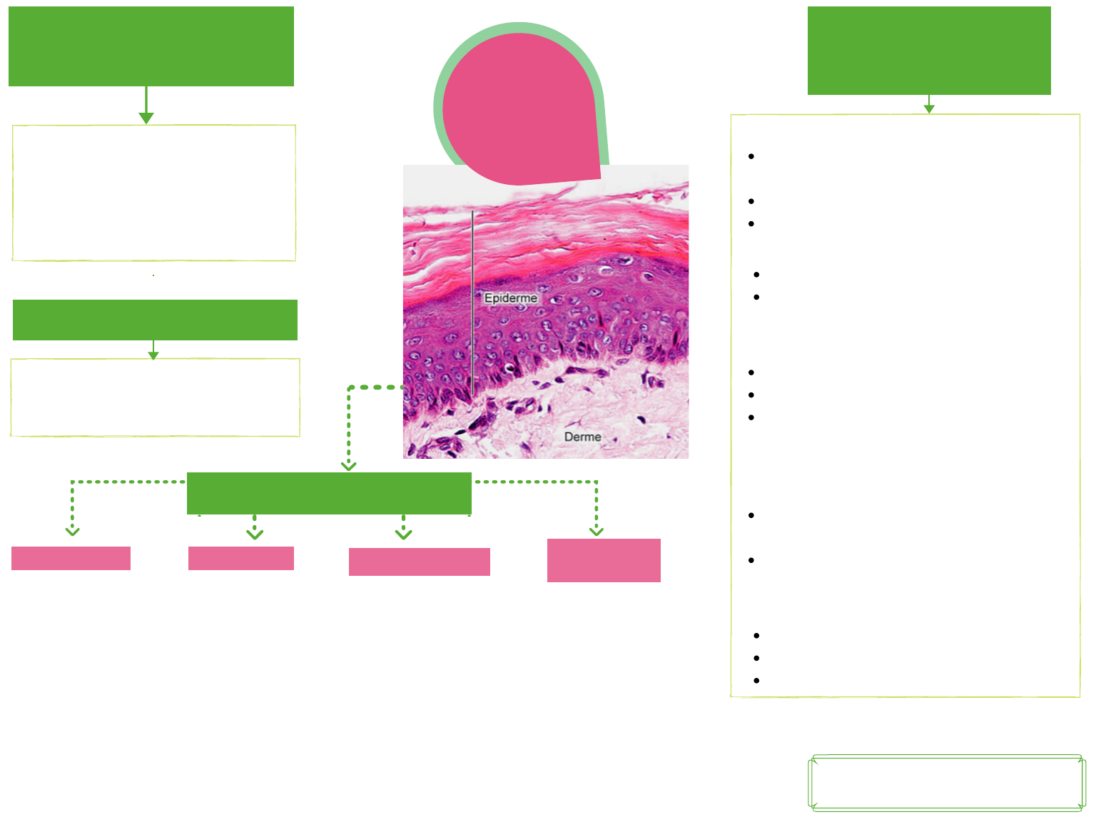 1. CAMADA BASAL Camada base, onde a epiderme se repousa (tem contato direto com a derme); Responsável pela constante renovação da epiderme; Possui queratina. 2. CAMADA ESPINHOSA Resistente ao atrito; Citoplasma com curta extensão e feixes de filamento de queratina - tonofilamentos. Impermeabilidade da pele; Citoplasma repleto de grânulos de queratohialina; Grânulos lamelares se fundem com a membrana 3. CAMADA ESTRATO GRANULOSA plasmática e expulsam seu conteúdo no espaço intercelular da camada granulosa Presente na pele espessa, como na palma da mão, planta Citoplasmas numerosos e filamentos de queratina 4. CAMADA LUCIDA *** do pé, lábios e pálpebras; compactados. Espessura variável; Acúmulo de células mortas; Citoplasma repleto de queratina. 5. CAMADA CÓRNEA Forma uma barreira protetora do corpo, (proteção contra danos externos, saída de água e entrada de substâncias/ micróbios). F U N Ç Õ E S A epiderme está localizada na parte superficial da pele humana. É formada por tecido epitelial estratificado pavimentoso queratinizado, avascular com 4- 5 camadas, sendo mais delgada que a derme. EPIDERME C a r a c t e r í s t i c a s e L o c a l i z a ç ã o Camadas da epiderme Responsáveis pelo TATO, parte profunda da epiderme. Células mecanorreceptoras, associadas às terminações nervosa sensitivas. C É L U L A S QUERATINÓCITOS Mais abundantes; produzem queratina, separam o organismo do meio externo. MELANÓCITOS Produzem melanina (pigmentação da pele). CÉLULAS DE MERKEL CÉLULAS DE LANGERHANS Encontradas em todas as camadas da epiderme, protegem a pele. São células de defesa, sistema imune. REFERÊNCIAS BIBLIOGRÁFICAS ROSS, Michael H., PAWLINA, Wojciech. Ross | Histologia - Texto e Atlas - Correlações com Biologia Celular e Molecular, 7ª edição. JUNQUEIRA, Luiz Carlos Uchoa; CARNEIRO, José- Histologia Básica- Texto e Atlas 13ª edição EPIDERME HUMNA- Disponivel em https://www.todabiologia.com/anatomia/epiderme_humana.htm. Acesso 20/09/2020 Loriane Rovani