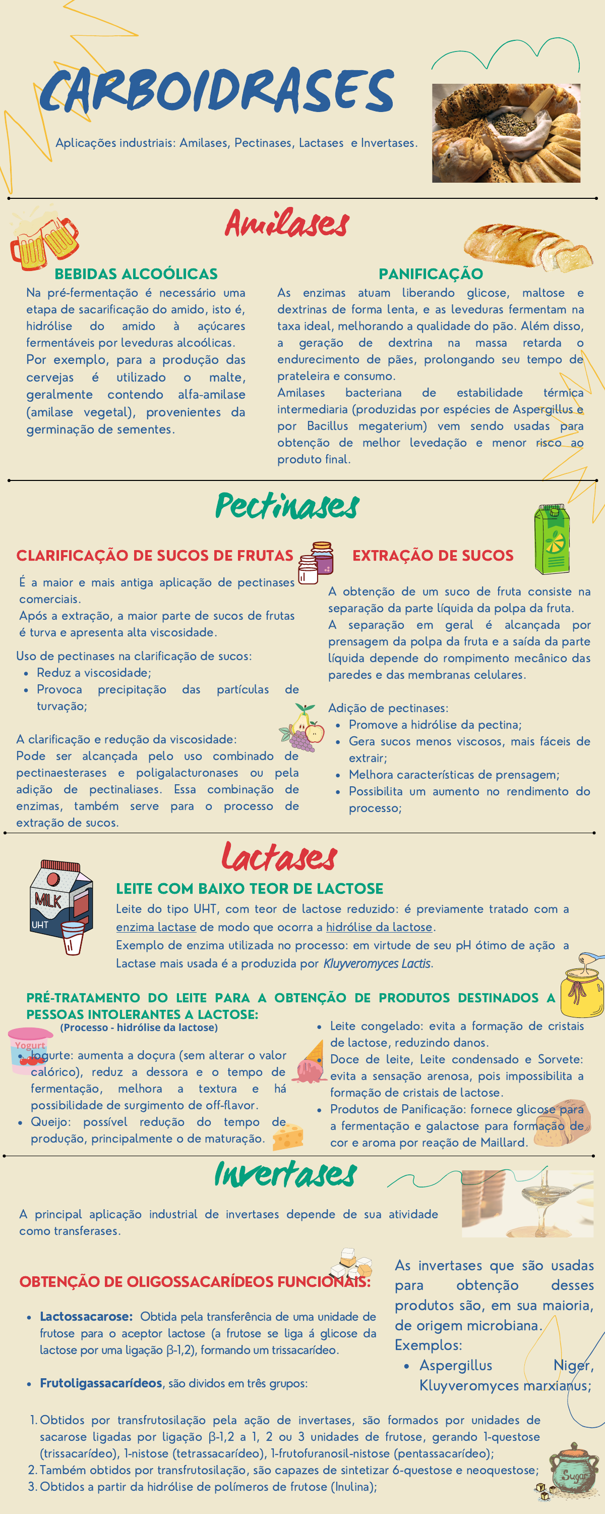 Yogurt EXTRAÇÃO DE SUCOS Promove a hidrólise da pectina; Gera sucos menos viscosos, mais fáceis de extrair; Melhora características de prensagem; Possibilita um aumento no rendimento do processo; A obtenção de um suco de fruta consiste na separação da parte líquida da polpa da fruta. A separação em geral é alcançada por prensagem da polpa da fruta e a saída da parte líquida depende do rompimento mecânico das paredes e das membranas celulares. Adição de pectinases: Aspergillus Niger, Kluyveromyces marxianus; As invertases que são usadas para obtenção desses produtos são, em sua maioria, de origem microbiana. Exemplos: Lactases CARBOIDRASES Aplicações industriais: Amilases, Pectinases, Lactases e Invertases. Pectinases CLARIFICAÇÃO DE SUCOS DE FRUTAS PRÉ-TRATAMENTO DO LEITE PARA A OBTENÇÃO DE PRODUTOS DESTINADOS A PESSOAS INTOLERANTES A LACTOSE: Invertases LEITE COM BAIXO TEOR DE LACTOSE Leite do tipo UHT, com teor de lactose reduzido: é previamente tratado com a enzima lactase de modo que ocorra a hidrólise da lactose. Exemplo de enzima utilizada no processo: em virtude de seu pH ótimo de ação a Lactase mais usada é a produzida por . Kluyveromyces LactisKluyveromyces Lactis UHT Leite congelado: evita a formação de cristais de lactose, reduzindo danos. Doce de leite, Leite condensado e Sorvete: evita a sensação arenosa, pois impossibilita a formação de cristais de lactose. Produtos de Panificação: fornece glicose para a fermentação e galactose para formação de cor e aroma por reação de Maillard. Iogurte: aumenta a doçura (sem alterar o valor calórico), reduz a dessora e o tempo de fermentação, melhora a textura e há possibilidade de surgimento de off-flavor. Queijo: possível redução do tempo de produção, principalmente o de maturação. Amilases BEBIDAS ALCOÓLICAS Na pré-fermentação é necessário uma etapa de sacarificação do amido, isto é, hidrólise do amido à açúcares fermentáveis por leveduras alcoólicas. Por exemplo, para a produção das cervejas é utilizado o malte, geralmente contendo alfa-amilase (amilase vegetal), provenientes da germinação de sementes. PANIFICAÇÃO As enzimas atuam liberando glicose, maltose e dextrinas de forma lenta, e as leveduras fermentam na taxa ideal, melhorando a qualidade do pão. Além disso, a geração de dextrina na massa retarda o endurecimento de pães, prolongando seu tempo de prateleira e consumo. Amilases bacteriana de estabilidade térmica intermediaria (produzidas por espécies de Aspergillus e por Bacillus megaterium) vem sendo usadas para obtenção de melhor levedação e menor risco ao produto final. Lactossacarose: Obtida pela transferência de uma unidade de frutose para o aceptor lactose (a frutose se liga á glicose da lactose por uma ligação β-1,2), formando um trissacarídeo. Frutoligassacarídeos, são dividos em três grupos: OBTENÇÃO DE OLIGOSSACARÍDEOS FUNCIONAIS: Reduz a viscosidade; Provoca precipitação das partículas de turvação; Uso de pectinases na clarificação de sucos: A clarificação e redução da viscosidade: Pode ser alcançada pelo uso combinado de pectinaesterases e poligalacturonases ou pela adição de pectinaliases. Essa combinação de enzimas, também serve para o processo de extração de sucos. É a maior e mais antiga aplicação de pectinases comerciais. Após a extração, a maior parte de sucos de frutas é turva e apresenta alta viscosidade. Obtidos por transfrutosilação pela ação de invertases, são formados por unidades de sacarose ligadas por ligação β-1,2 a 1, 2 ou 3 unidades de frutose, gerando 1-questose (trissacarídeo), 1-nistose (tetrassacarídeo), 1-frutofuranosil-nistose (pentassacarídeo); Também obtidos por transfrutosilação, são capazes de sintetizar 6-questose e neoquestose; Obtidos a partir da hidrólise de polímeros de frutose (Inulina); 1. 2. 3. A principal aplicação industrial de invertases depende de sua atividade como transferases. (Processo - hidrólise da lactose)