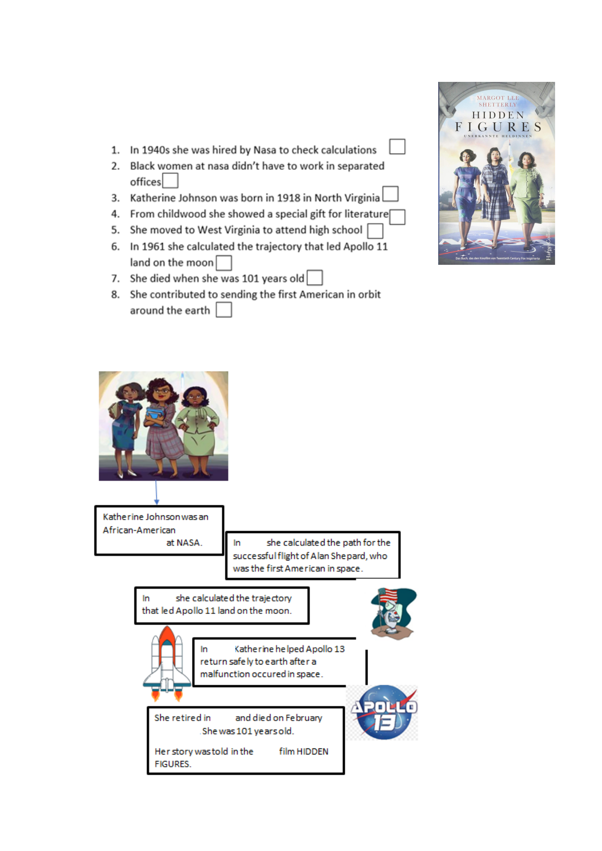 HIDDEN FIGURES (2016) 1) Answer if it is true or false, according to the movie. 2) Complete the squares with the missing information. 3) Answer to the questions. Who was Katherine Johnson? Why did she have to face exclusion? As the film opens, a young Katherine is counting and identifying prime numbers. What is a prime number? What year is the film set? Why would Katherine, Mary and Dorothy have to sit in the back of the bus in 1960s America? Why does Al Harrison (Katherine’s boss) get annoyed with her? Why does Mary go to court? What happened to the Liberty Bell capsule? What is the ancient method they find that solves the mathematical problem? 4) Read the comments and answer the questions. Do you agree with those comments? Choose one and write an answer to it (agreeing or disagreeing): 5) Write a the movie summary exposing the opinion from the group: