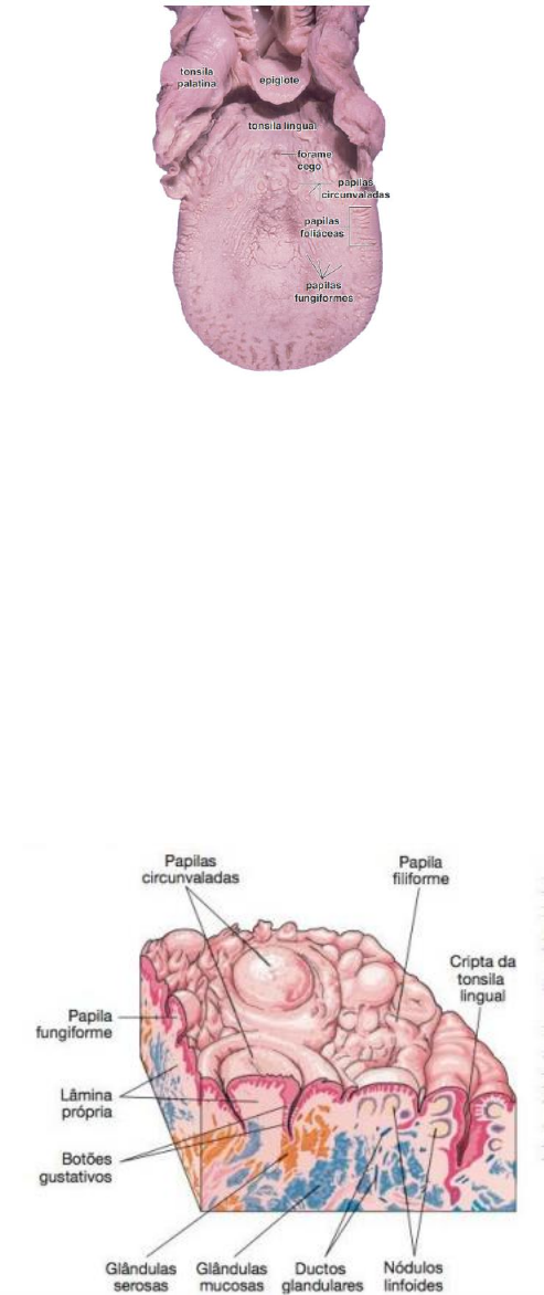Allycia Mello – UNIT/AL Histologia LÍNGUA A língua é uma massa de músculo estriado esquelético revestida por uma camada mucosa cuja estrutura varia de acordo com a região. A camada mucosa está fortemente aderida à musculatura, porque o tecido conjuntivo da lâmina própria penetra os espaços entre os feixes musculares. A superfície ventral (inferior) da língua é lisa, enquanto a superfície dorsal é irregular, recoberta anteriormente por uma grande quantidade de eminências pequenas denominadas papilas. Papilas linguais Papilas são elevações do epitélio oral e lâmina própria que assumem diversas formas e funções. Existem quatro tipos (ver Figura 15.2): filiformes, fungiformes, foliadas e circunvaladas. • As papilas filiformes têm um formato cônico alongado, são numerosas e estão sobre toda a superfície dorsal da língua; têm a função mecânica de fricção. Seu epitélio de revestimento, que não contém botões gustativos, é queratinizado. • As papilas fungiformes assemelham-se a cogumelos, tendo uma base estreita e uma porção superior mais superficial dilatada e lisa. Essas papilas, que contêm poucos botões gustativos na sua superfície superior, estão irregularmente distribuídas entre as papilas filiformes. • As papilas foliadas são pouco desenvolvidas em humanos, porém encontradas em macacos e coelhos. Elas consistem em duas ou mais rugas paralelas separadas por sulcos na superfície dorsolateral da língua, contendo muitos botões gustativos. • As papilas circunvaladas são 7 a 12 estruturas circulares grandes, cujas superficies achatadas se estendem acima das outras papilas. Elas estão distribuídas na região do V lingual, na parte posterior da lingua. Numerosas glândulas serosas (glândulas de von Ebner) secretam seu conteúdo no interior de uma profunda depressão que circunda cada papila. Esse arranjo similar a um fosso possibilita um fluxo contínuo de líquido sobre uma grande quantidade de botões gustativos ao longo das superficies laterais dessas papilas. Este fluxo é importante na remoção de partículas de alimentos da adjacência dos botões gustativos, para que eles possam receber e processar novos estímulos. As glândulas serosas também secretam uma lipase que provavelmente previne a formação de uma camada hidrofóbica sobre os botões gustativos, o que poderia prejudicar sua função. Além deste papel local, a lipase lingual é ativa no estômago e pode digerir até 30% dos triglicerídios da dieta. Outras glândulas salivares menores de secreção mucosa dispersas pela cavidade oral atuam da mesma maneira que as glândulas serosas associadas às papilas circunvaladas, auxiliando a função de botões gustativos encontrados em outras partes da cavidade oral, como, por exemplo, na porção anterior da língua. Existem pelo menos cinco qualidades na percepção humana de sabor: salgado, az.edo, doce, amargo e o saboroso (umam~ termo japonês para o sabor do glutamato monossódico). Todas essas qualidades podem ser percebidas em todas as regiões da lingua que contêm botões gustativos. Esses botões são estruturas em forma de cebola (Figura 15.3), cada uma contendo 50 a 100 células. O botão repousa sobre uma lâmina basal e, em sua porção apical, as células gustativas têm microvilosidades que se projetam por urna abertura denominada poro gustativo. Muitas das células têm Allycia Mello – UNIT/AL função gustativa, enquanto outras têm função de suporte. Células basais indiferenciadas são responsáveis pela reposição de todos os tipos celulares. GLÂNDULA PARÓTIDA As glândulas salivares maiores são glândulas emparelhadas com longos ductos que desembocam na cavidade oral. As glândulas parótida e submandibular na realidade estão localizadas fora da cavidade oral; suas secreções alcançam a cavidade através dos ductos. A glândula parótida está localizada subcutaneamente abaixo e à frente da orelha, no espaço entre o ramo da mandíbula e o processo estiloide do osso temporal. A glândula parótida é uma glândula acinosa composta; sua porção secretora é constituída exclusivamente por células serosa, contendo grânulos de secreção ricos em proteínas e elevada atividade de amilase. Essa atividade é responsável pela hidrólise de boa parte dos carboidratos ingeridos.. Como em outras glândulas salivares, o tecido conjuntivo contém muitos plasmócitos e linfócitos. Os plasmócitos secretam IgA, que forma um complexo com um componente secretor sintetizado pelas células acinosas, células dos duetos intercalares e estriados. O complexo secretor rico em IgA (SigA) é liberado na saliva, sendo resistente à digestão enzimática e constituindo-se em um mecanismo de defesa imunológica contra patógenos da cavidade oral. ÁCINOS DE GLÂNDULAS SECRETORAS Os ácinos são de três tipos: serosos, mucosos ou mistos. As glândulas parótidas são completamente serosas. As glândulas parótidas serosas emparelhadas são as maiores das glândulas salivares maiores. O ducto parotídeo segue seu trajeto a partir da glândula, abaixo e em frente à orelha, para entrar na cavidade oral no lado oposto do segundo dente molar superior. As unidades secretoras na parótida são serosas e circundam numerosos ductos intercalares longos e estreitos. Os ductos estriados são grandes e evidentes. A glândula parótida, no ser humano, é composta inteiramente de ácinos serosos em seus ductos. Tipicamente, os adipócitos também estão distribuídos por toda a glândula. A porção inferior da figura revela um ducto excretor dentro de um septo de tecido conjuntivo. 120X. Detalhe. Maior aumento das células acinosas serosas. 320X Allycia Mello – UNIT/AL MINI ATLAS Papilas filiformes: Elas são as mais numerosas dos três tipos de papilas. Essas papilas não possuem botões gustativos e são compostas de epitélio estratificado pavimentoso queratinizado. As papilas fungiformes estão dispersas como est