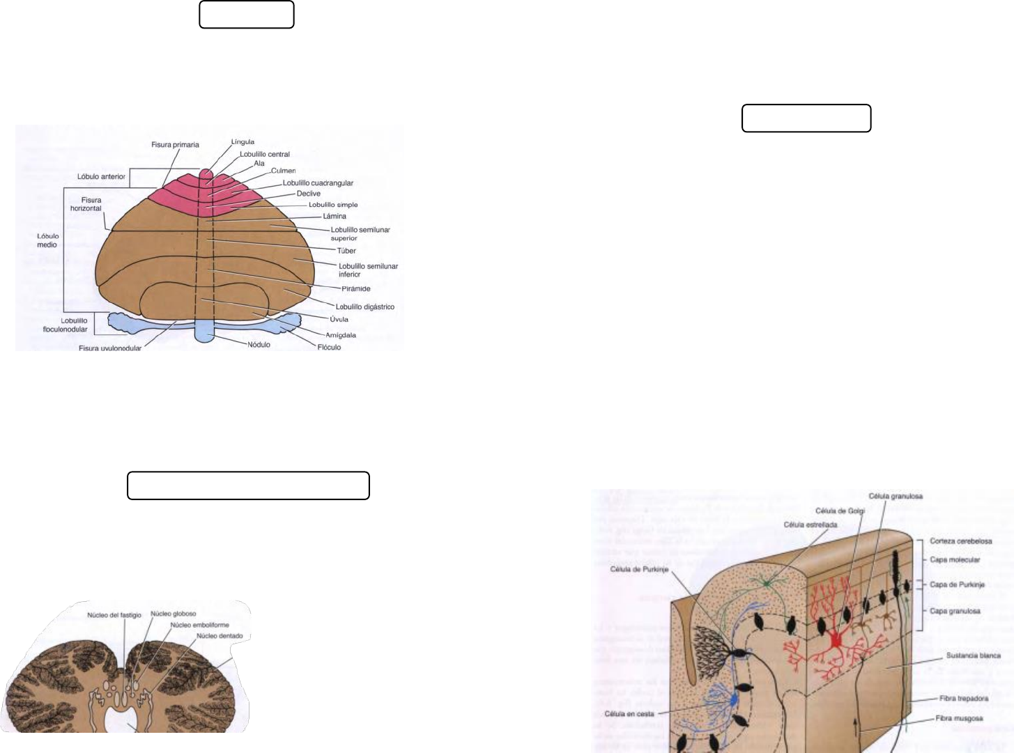 CEREBELO Es la parte más grande del cerebro posterior Se ubica por detrás del tronco del encéfalo. Está formado por hemisferios cerebelosos unidos por una porción media el vermis. Del punto de vista anatómico el cerebelo se divide 3 lóbulos: lóbulo anterior, posterior o media y el lóbulo floculonodular. El cerebelo se une por tres haces de fibras nerviosas: -Pedúnculo cerebelosos superior -Pedúnculo cerebelosos medio -Pedúnculo cerebelosos inferior (por donde pasa la vía vestibular) ESTRUCTURA DEL CEREBELO -El cerebelo está compuesto por una sustancia externa gris – la corteza. -Una sustancia blanca interna. dentro de la sustancia blanca hay tres masas de sustancia gris que conforma los núcleos intracerebelosos o cerebelosos. Núcleo dentado Fastigio Emboliforme Globoso NÚCLEO DENTADO: es el más grande, tiene forma arrugada – el núcleo está formado por fibras eferente que salen del núcleo y forma el pedúnculo cerebeloso superior. NÚCLEO FASTIGIO: está cerca de la línea media en el vermis. SUSTANCIA GRIS La corteza posee 3 capas principales: CAPA MOLECULAR: más externa, contiene neuronas estrelladas y en neuronas en cesta. Se cree que son NEURONAS INHIBIDORAS. CAPA DE PURKINJE: capa media, son neuronas grandes. Las dendritas de estas neuronas se dirigen hacia la capa molecular, se ramifican y establecen conexiones con las células. Su axón, atraviesa a la capa granulosa (más interna) y se mete en la sustancia blanca hasta llegar a los núcleos intracelebelosos. -Algunos axones se dirigen directamente hacia los núcleos vestibulares. CAPA GRANULOSA: contiene neuronas pequeñas que establecen sinapsis con las aferencias de las fibras musgosas. -El axón de cada neurona granulosa ingresa en la capa más externa – capa molecular, donde se bifurca en forma de una T. sus ramos discurren por toda la superficie cerebelosa, llamada de fibras paralelas. -la mayoría de las fibras paralelas establecen contacto con las células de Purkinje. . SUSTANCIA BLANCA Está formada por grupos de fibras FIBRAS INTRÍNSECAS: son las fibras que conectan diferentes regiones del cerebelo FIBRAS AFERENTES: son las fibras que entran en el cerebelo a través de los pedúnculos cerebelosos inferiores y medios. FIBRAS EFERENTES: son la eferencia del cerebelo. comienzan con los axones de las células de Purkinje. La gran mayoría de los axones se dirigen a los núcleos intercerebelosos (fastigio, dentado, globoso, etc.) Algunos axones de las neuronas de Purkinje en el lóbulo floculonodular y en partes del vermis pasan sin hacer sinapsis con los núcleos cerebelosos. AREAS FUNCIONALES DE LA CORTEZA CEREBELOSA Es posible dividir la corteza en 3 áreas funcionales 1.La Corteza del vermis: influye en los movimientos del tronco axial, cuello, hombro y caderas – llamado cerebelo vestibular. Así como también recibe señales aferentes de las mismas regiones. 2.La zona intermedia: lateral al vermis. Responsable del control de las contracciones musculares de las partes distales de los miembros, sobre todo manos y pies. Llamado de cerebelo espinal. 3.La zona lateral: interviene en el planeamiento de movimientos secuenciales de todo el cuerpo y participa en la evaluación de los errores. Llamado de cerebelo cerebral FIBRAS MUSGOSAS Y TREPADORAS Las fibras trepadoras y musgosas constituyen las dos principales aferencias hacia la corteza y ejercen un efecto EXCITADOR sobre las células de Purkinje. FIBRAS TREPADORAS: son terminales de los tractos olivocerebelosas. Llegan por la sustancia blanca, atraviesa la capa granulosa (más interna) y se divide muchas veces en la capa molecular donde establecen contacto con las células de Purkinje. Tienen actividad excitadora. FIBRAS MUSGOSAS: son las fibras terminales de todos otros haces cerebelosos aferentes. Ej. – fibras vestíbulocerebelosas. Las aferencias musgosas dejan ramas colaterales que excitan a los núcleos profundos, se dirigen a la corteza y hacen contacto con las neuronas de la capa granulosa y estas realizan contacto con las neuronas de Purkinje (inhibidora). Tiene una actividad excitadora. ¿CUAL ES ENTONCES LA FUNCON DE LAS CÉLULAS RESTANTES DE LA CORTEZA – ¿ESTRELLADA, EN CESTA? Se cree que son neuronas inhibidoras. Influyen en el grado de excitación de las células de Purkinje producido por las aferencias de las fibras trepadoras y musgosas. Así que, los impulsos inhibidores producido en estas células se transmiten por las células de Purkinje a los núcleos cerebelosos, que a su vez modifican la actividad muscular. -A través de las áreas de control motor del tronco encefálico y la corteza cerebral. (colocar de otra forma). Las células de Purkinje constituyen la unidad funcional de la corteza cerebelosa. NÚCLEOS INTRACERECEBELOSOS Los núcleos cerebelosos reciben información nerviosa de dos fuentes: 1. los axones inhibidores de las células de Purkinje. 2. los axones excitadores que son ramos de las fibras musgosas y trepadoras aferentes que se dirigen a la corteza. De esta forma, la aferencia sensitiva envía información excitadora a los núcleos cerebelosos que reciben poco tiempo después la información inhibidora procesada en la corteza a través de las células de Purkinje. La información de los núcleos abandona el cerebelo y se distribuye hacia el tronco encefálico, médula, cerebro. LOS PEDÚNCULOS: constituyen fibras aferentes y eferentes que se agrupan a cada lado del cerebelo en 3 grandes haces o pedúnculos y por el cual se relaciona con otras partes del sistema nervioso. Los pedúnculos cerebelosos superior – conecta con el mesencéfalo. Los pedúnculos cerebelosos medio – conecta con la protuberancia. Los conductos cerebelosos inferiores - conecta con el bulbo raquídeo. FIBRAS CEREBELOSAS AFERENTES La corteza cerebral envía información al cerebelo por tres vías: 1.la vía corticopontocerebelosa. 2.la vía cerebroolivocerebelosa. 3.la vía cerebrorreticulocerebelosa. VÍA CORTICOPONTOCEREBELOSA L