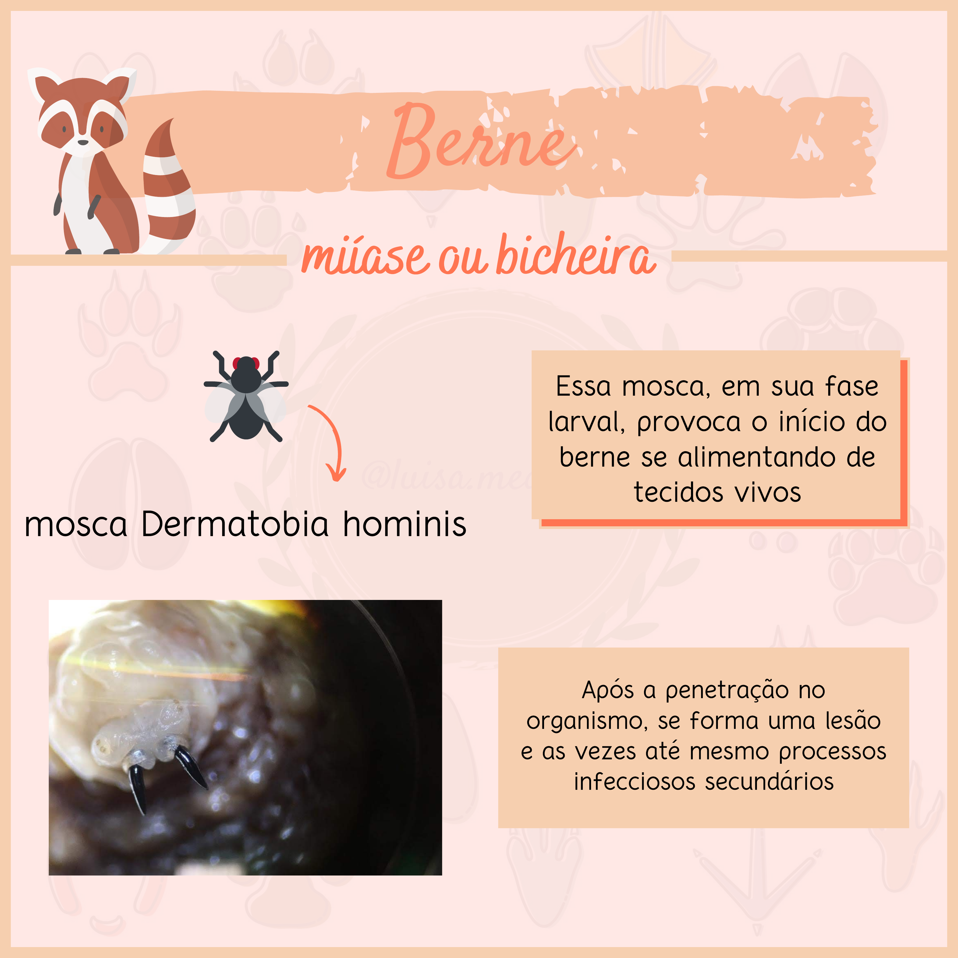 Essa mosca, em sua fase larval, provoca o início do berne se alimentando de tecidos vivos Após a penetração no organismo, se forma uma lesão e as vezes até mesmo processos infecciosos secundários Berne miíase ou bicheira mosca Dermatobia hominis Matas fechadas e próximo a morros/serras é mais propício de encontra-las. Infestações ocorrem, na sua maior parte, antes ou após períodos chuvosos. Causam dor local e estresse aos animais, devido ao movimento das larvas dentro das lesões Um dos principais métodos de controle é impedir o contato desses animais com possíveis vetores, utilizando produtos com ação repelente. miíase ou bicheira como controlar?