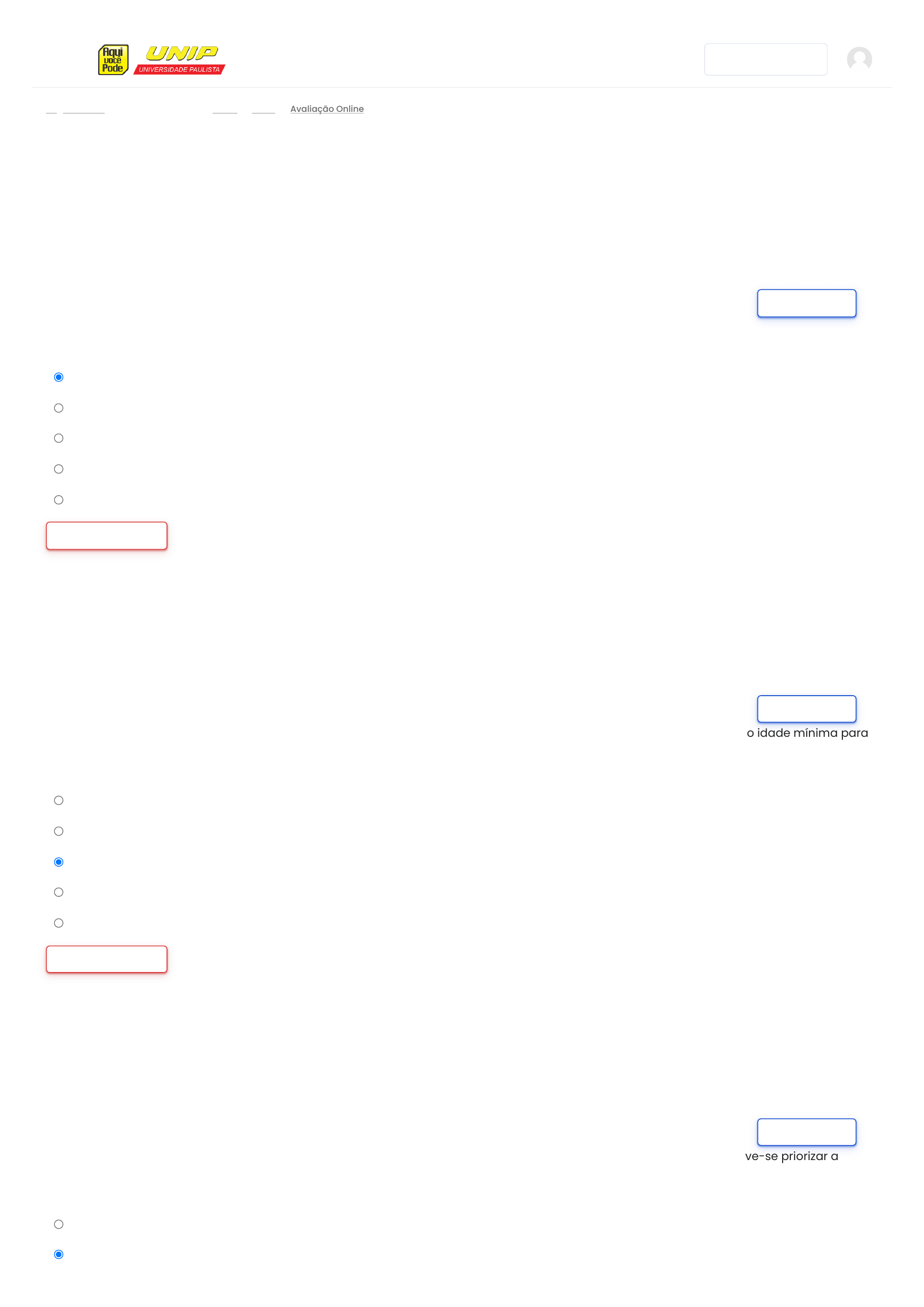 23/10/2020 Avaliação Online www.unipvirtual.com.br/avaunip/mod/quiz/attempt.php?attempt=3284626&cmid=57022 1/4 - Minhas disciplinas - - - Bibliotecas Virtuais Página inicial R1768 Geral Avaliação Online As telessalas e os Centros estaduais de educação de jovens e adultos são exemplos de Cursos de Presença: Escolha uma: a. Flexível b. Intermitente c. Alternativa d. Todas as respostas e. Adaptada Limpar minha escolha Os cursos presenciais correspondentes ao ensino médio terão a duração mínima de 1200 horas de trabalho escolar efetivo idade mínima para a matrícula inicial correspondente a: Escolha uma: a. Dezessete anos b. Dezesseis anos c. Dezoito anos d. Nenhuma das respostas e. Vinte anos Limpar minha escolha Para que o processo educativo com a linguagem escrita seja realizado em direção a uma aprendizagem significativa, deve-se priorizar a leitura, enquanto compreensão de textos e a escrita, enquanto produção de: Escolha uma: a. Dinâmicas b. Textos Remover rótulo Questão 1 Ainda não respondida Vale 1,00 ponto(s). Remover rótulo Questão 2 Ainda não respondida Vale 1,00 ponto(s). Remover rótulo Questão 3 Ainda não respondida Vale 1,00 ponto(s). http://www.unipvirtual.com.br/avaunip http://www.unipvirtual.com.br/avaunip/ http://www.unipvirtual.com.br/avaunip/course/view.php?id=1294 http://www.unipvirtual.com.br/avaunip/course/view.php?id=1294#section-0 http://www.unipvirtual.com.br/avaunip/mod/quiz/view.php?id=57022 http://www.unipvirtual.com.br/avaunip/mod/quiz/attempt.php?attempt=3284626&cmid=57022 http://www.unipvirtual.com.br/avaunip/mod/quiz/attempt.php?attempt=3284626&cmid=57022 23/10/2020 Avaliação Online www.unipvirtual.com.br/avaunip/mod/quiz/attempt.php?attempt=3284626&cmid=57022 2/4 c. Metodologias d. Nenhuma das respostas e. Livros Limpar minha escolha As instituições para serem autorizadas a realizar os exames presenciais, devem ser credenciadas pelos: Escolha uma: a. Conselhos estaduais de educação b. Conselhos Tutelares c. Nenhuma das respostas d. Conselhos Fiscais e. Conselhos Escolares Limpar minha escolha A educação de jovens e adultos é um campo complexo, pois envolve outras questões além da questão: Escolha uma: a. Emocional b. Fundamental c. Educacional d. Todas as respostas e. Social Limpar minha escolha Os cursos correspondentes às quatro primeiras séries do ensino fundamental terão organização, duração, estrutura e certificação definidas pelas: Escolha uma: a. Secretarias de Educação b. Todas as respostas P f it M i i i Remover rótulo Questão 4 Ainda não respondida Vale 1,00 ponto(s). Remover rótulo Questão 5 Ainda não respondida Vale 1,00 ponto(s). Remover rótulo Questão 6 Ainda não respondida Vale 1,00 ponto(s). http://www.unipvirtual.com.br/avaunip/mod/quiz/attempt.php?attempt=3284626&cmid=57022 http://www.unipvirtual.com.br/avaunip/mod/quiz/attempt.php?attempt=3284626&cmid=57022 http://www.unipvirtual.com.br/avaunip/mod/quiz/attempt.php?attempt=3284626&cmid=57022 Usuário-Vaio Pencil 23/10/2020 Avaliação Online www.unipvirtual.com.br/avaunip/mod/quiz/attempt.php?attempt=3284626&cmid=57022 3/4 c. Prefeituras Municipais d. Instituições que os ministram e. Escolas-Modelo Limpar minha escolha Os dispositivos legais estenderam para toda a escolaridade da educação básica, a educação de jovens e adultos, apesar da Constituição Federal de 1988 se referir somente ao ensino: Escolha uma: a. Médio b. Fundamental c. Superior d. Todas as respostas e. Seriado Limpar minha escolha Está sendo realizada pelos sistemas estaduais e municipais de ensino, cada um de acordo com suas competências e atribuições: Escolha uma: a. Educação Fundamental b. Nenhuma das respostas c. Educação de jovens e adultos d. Educação Infantil e. Educação Continuada Limpar minha escolha Em 1967 foi criada a primeira iniciativa do governo para resolver o problema da educação de jovens e adultos. Tal ação recebeu o nome de: Escolha uma: a. Educando o Brasil b. Educação para Todos c. Movimento Brasileiro de Alfabetização Remover rótulo Questão 7 Ainda não respondida Vale 1,00 ponto(s). Remover rótulo Questão 8 Ainda não respondida Vale 1,00 ponto(s). Remover rótulo Questão 9 Ainda não respondida Vale 1,00 ponto(s). http://www.unipvirtual.com.br/avaunip/mod/quiz/attempt.php?attempt=3284626&cmid=57022 http://www.unipvirtual.com.br/avaunip/mod/quiz/attempt.php?attempt=3284626&cmid=57022 http://www.unipvirtual.com.br/avaunip/mod/quiz/attempt.php?attempt=3284626&cmid=57022 Usuário-Vaio Pencil Usuário-Vaio Text Box CETA 23/10/2020 Avaliação Online www.unipvirtual.com.br/avaunip/mod/quiz/attempt.php?attempt=3284626&cmid=57022 4/4 ç d. Movimento de Educação para Maiores de Idade e. Todas as respostas Limpar minha escolha Em 1985, o MOBRAL foi extinto devido à redemocratização do país e substituído pela: Escolha uma: a. Fundação Leitura Ativa b. Fundação Aprender c. Fundação Educar d. Fundação Pró-Cultura e. Nenhuma das respostas Limpar minha escolha Remover rótulo Questão 10 Ainda não respondida Vale 1,00 ponto(s). Avisos Seguir para... Livro Texto http://www.unipvirtual.com.br/avaunip/mod/quiz/attempt.php?attempt=3284626&cmid=57022 http://www.unipvirtual.com.br/avaunip/mod/quiz/attempt.php?attempt=3284626&cmid=57022 http://www.unipvirtual.com.br/avaunip/mod/forum/view.php?id=24640&forceview=1 http://www.unipvirtual.com.br/avaunip/mod/url/view.php?id=35446&forceview=1