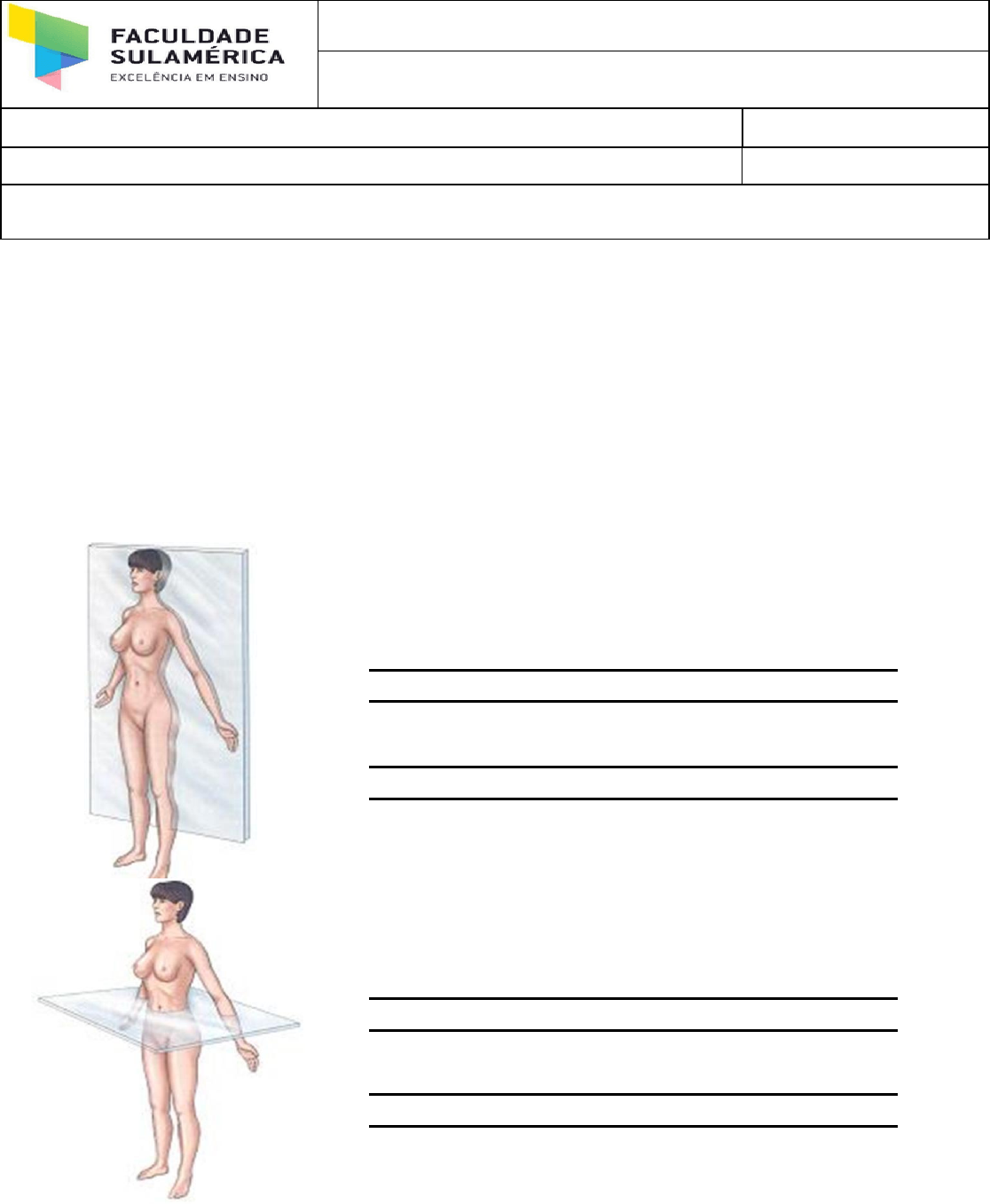 CURSO DE ODONTOLOGIA Disciplina: ANATOMIA I Professor: MARCUS VINÍCIUS F. CIRILO Data: 24/03/2020 Aluno (a):Cristiane Silva Dourado dos Santos - EXERCÍCIO DE FIXAÇÃO 0.1 Sobre cada PLANO DE SECÇÃO (CORTE), responda aos dois questionamentos: I. Como denominar o corte com seus respectivos eixos e as metades? II. Explique com suas palavras qual é a importância destes cortes para sua formação profissional, de acordo com o curso (faculdade) que está cursando? Nome do Plano de Secção ou Corte: Plano Coronal ou Frontal Nome dos 2 eixos que deslizam entre si para se obter tal corte: Ântero-Posterior AP Nome das metades geradas a partir deste corte: Anterior (Ventral) Posterior (Dorsal) Nome do Plano de Secção ou Corte: Plano Transversal, Axial ou Horizontal Nome dos 2 eixos que deslizam entre si para se obter tal corte: Longitudinal ou vertical Nome das metades geradas a partir deste corte: Divide o corpo em Superior e Inferior Nome do Plano de Secção ou Corte: Sagital Nome dos 2 eixos que deslizam entre si para se obter tal corte: Eixo horizontal ou Transversal Nome das metades geradas a partir deste corte: Divide o corpo em laterais – Direito e Esquerda Espaço reservado para você responder a questão II : È È muito importante, pois com esses cortes saberemos destinguir basicamente o local da patogenia, facilitando o tratamento de maneira rápida e éficaz. 0.2 Observe os 3 cortes anatômicos básicos no corpo humano como um todo e depois analise com atenção as imagens obtidas a partir de cada plano de corte no encéfalo (parte do sistema nervoso central que contém o cérebro, cerebelo e tronco encefálico). Escreva o nome do corte (a, b, c). Depois dê nome das possíveis vistas de cada “fatia” apresentada, e veja como a imagem poderá ser encontrada nos livros do tipo atlas de anatomia humana, para compreender imagens de exames como por exemplo na TC (tomografia computadorizada), entre outros. Cortes dos Crânios Cortes no boneco: A – Transversal A- Frontal B- Sagital B- Tranversal C- Frontal ou coronal C- Sagital