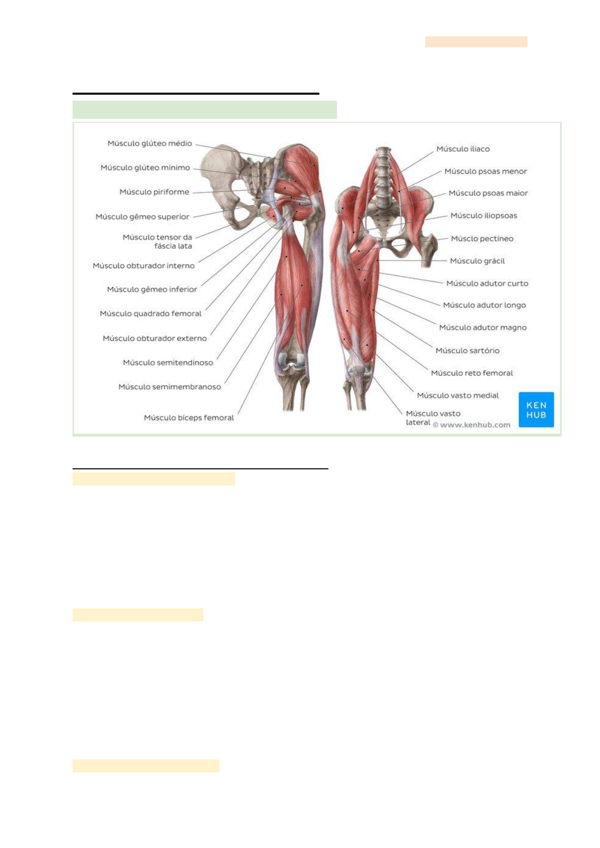 IZADORA MAGALHÃES MEMBROS INFERIORES: MÚSCULOS DA COXA E QUADRIL: Músculo do compartimento lateral da pelve: M. TENSOR DA FÁSCIA LATA: ● confinado entre as camadas da fáscia na face lateral da coxa, associado funcionalmente com os rotadores mediais e flexores da coxa ● ORIGEM: anteriormente na crista ilíaca e espinha ilíaca anterossuperior. ● INSERÇÃO: trato iliotibial ● AÇÃO: - Estabiliza o tronco na coxa, enrijecendo o trato iliotibial, flexiona, abduz e gira medialmente a coxa; - Compartimento anterior da coxa: MÚSCULO SARTÓRIO: maior músculo do corpo humano ● músculo superficial em forma de fita que segue obliquamente pela superfície anterior da coxa até o joelho, músculo mais longo do corpo, cruza as articulações do quadril e do joelho ● ORIGEM: espinha ilíaca anterossuperior ● INSERÇÃO: insere-se proximal e medialmente na tíbia ● AÇÃO: - Flexiona, abduz e gira lateralmente a coxa; flexiona a perna (fraco) como em um chute no futebol; ajuda a produzir a posição de pernas cruzadas (posição de lótus) Músculo RETO FEMORAL: músculo forte mas pouco resistente IZADORA MAGALHÃES ● músculo superficial do compartimento anterior da coxa, onde se posiciona em linha reta. É a cabeça mais longa e única do grupo do quadríceps a cruzar a articulação do quadril ● origem: espinha ilíaca ântero inferior e margem superior do acetábulo ● inserção: patela e tuberosidade da tíbia via ligamento patelar ● AÇÃO: - Estende a perna e flexiona a coxa, ajuda na flexão do quadril MÚSCULO VASTO LATERAL: ● maior cabeça do grupo (quadríceps femoral), forma a face lateral da coxa, um local comum de injeção intramuscular ● ORIGEM: trocânter maior, linha intertrocantérica, linha áspera ● INSERÇÃO:: a mesma do reto femoral ● AÇÃO: - Estende a perna e estabiliza o joelho Músculos do compartimento anterior da coxa: VASTO MEDIAL: ● Forma a face inferomedial da coxa ● ORIGEM: linha áspera, linha supracondilar medial ● INSERÇÃO: a mesma do reto femoral, ou seja, patela e tuberosidade da tíbia via ligamento patelar ● AÇÃO: - Estende a perna, as fibras inferiores estabilizam a perna VASTO INTERMÉDIO: quarta cabeça do quadríceps ● Encoberto pelo reto femoral, situado entre o vasto lateral e o vasto medial na coxa, anteriormente ● ORIGEM: proximal nas faces anterior da diáfise femoral ● INSERÇÃO: mesma do reto femoral, ou seja, patela e tuberosidade da tíbia via ligamento patelar ● AÇÃO: - Estende a perna MÚSCULO DO COMPARTIMENTO MEDIAL DA COXA: parte interna: M. PECTÍNEO: ● Músculo curto e plano, sobrejacente ao adutor curto proximalmente na coxa, adjacente ao adutor longo medialmente. ● ORIGEM: linha pectínea do púbis (e ramo superior) ● INSERÇÃO: uma linha do trocânter menor até a linha áspera na face posterior do fêmur. ● AÇÃO: - Aduz, flexiona e gira medialmente a coxa M. GRÁCIL: outro adutor ● Músculo longo, fino e superficial da coxa medialmente ● ORIGEM: ramo inferior e corpo do púbis e ramo isquiático adjacente ● INSERÇÃO: face medial da tíbia, imediatamente inferior ao seu côndilo medial ● AÇÃO: IZADORA MAGALHÃES - Aduz a coxa, flexiona e gira medialmente a perna, especialmente durante a marcha M. ADUTOR LONGO: um pouco maior que o adutor curto, músculo forte, pode causar muito desgaste na sínfise púbica. ● Sobrejacente ao adutor magno, mais anterior dos músculos adutores ● ORIGEM: púbis, próximo à sínfise púbica ● INSERÇÃO: linha áspera, terço distal do osso ● AÇÃO: - Aduz, flexiona e gira medialmente a coxa M. ADUTOR CURTO: (seccionado e tracionado) ● Em contato com o músculo obturador externo, sobreposto pelo adutor longo e pelo pectíneo ● ORIGEM: corpo e ramo inferior do púbis ● INSERÇÃO: linha áspera acima do adutor longo ● AÇÃO: - Aduz e roda medialmente a coxa M. ADUTOR MAGNO: (seccionado e tracionado): o mais forte desses músculos ● um músculo triangular com uma inserção ampla, é um músculo composto, com uma ação parcialmente de adutor e parcialmente de extensor ● ORIGEM: ramos do ísquio e do púbis e túber isquiático ● INSERÇÃO: linha áspera, linha supracondilar medial e tubérculo do adutor no fêmur ● AÇÃO: - A parte anterior aduz, roda medialmente e flexiona a coxa; a parte posterior é sinergista dos músculos do compartimento posterior na extensão da coxa MÚSCULOS DO COMPARTIMENTO POSTERIOR DA COXA: M. BÍCEPS FEMORAL: potente flexor do joelho ● músculo mais lateral do grupo, origem a partir de duas cabeças ● ORIGEM: túber isquiático (cabeça longa); linha áspera, linha supracondilar lateral e diáfise do fêmur proximalmente (cabeça curta) ● INSERÇÃO: o tendão comum de trajeto inferior e lateral (formando a margem lateral da fossa poplítea), inserindo-se na cabeça da fíbula e no côndilo lateral da tíbia ● AÇÃO: -Estende a coxa e flexiona a perna; roda lateralmente a perna quando o joelho está semiflexionado M. SEMITENDÍNEO: ● situado medialmente em relação ao bíceps femoral; seu tendão longo e delgado começa aproximadamente a dois terços do caminho da coxa ● ORIGEM: túber isquiático ● INSERÇÃO: face medial da diáfise da tíbia superiormente ● AÇÃO: -Estende a coxa e flexiona a perna; roda medialmente a perna M. SEMIMEMBRANÁCEO: IZADORA MAGALHÃES ● mais profundo que o semitendíneo ● ORIGEM: túber isquiático ● INSERÇÃO: côndilo medial da tíbia, através do ligamento poplíteo oblíquo do joelho até o côndilo lateral do fêmur. ● AÇÃO: - Estende a coxa e flexiona a perna roda medialmente a perna NERVOS: IZADORA MAGALHÃES MÚSCULOS DO JOELHO E DA PERNA: MÚSCULO DO COMPARTIMENTO ANTERIOR DA PERNA: TIBIAL ANTERIOR: super potente ● músculo superficial da perna anteriormente; segue em paralelo com a margem anterior da tíbia. ● ORIGEM: côndilo lateral e dois terços superiores da diáfise da tíbia; membrana i
