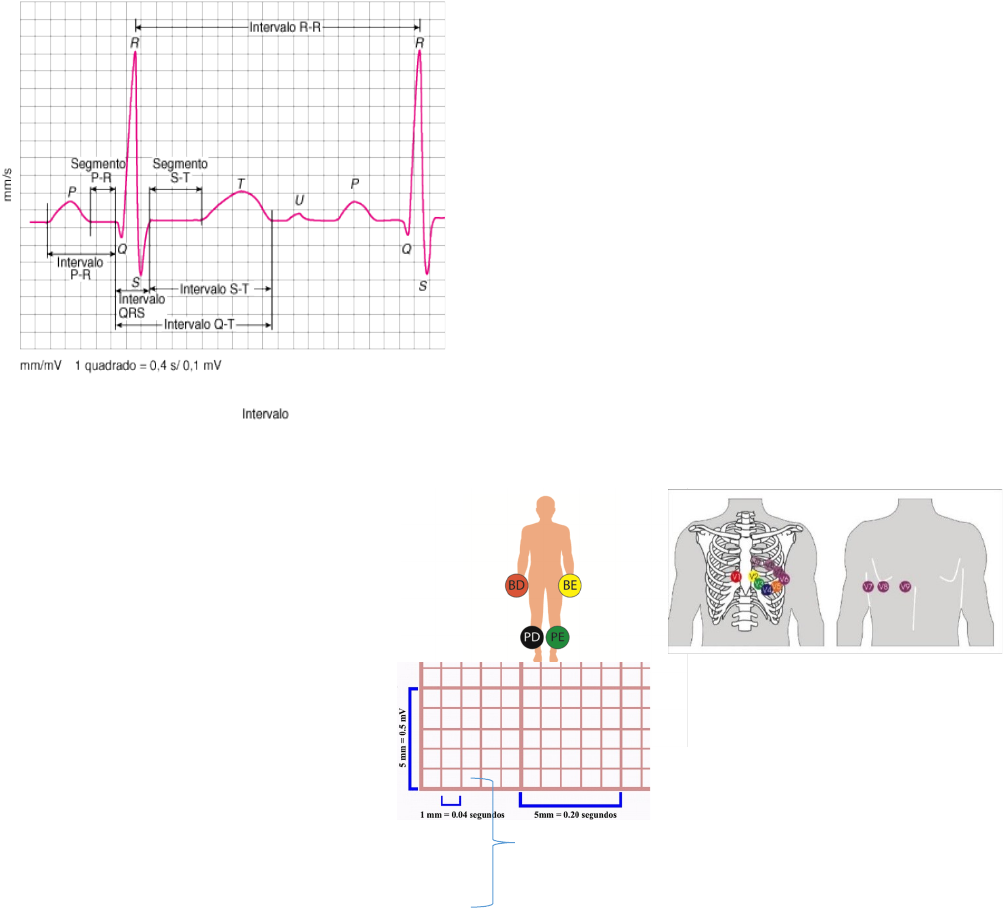 Aula 2 Cardiologia Introdução Ao ECG · ASPECTOS BÁSICOS Registro extra celular das variações do potencial elétrico do músculo cardíaco. Desenvolvido por Eithoven em 1903. Caminho = Nó sinusal -> NAV -> feixes de His Duração quadrados na horizontal = tempo (0.4 ms) Amplitude quadrados na vertical = voltagem · Ondas do ECG – ciclo cardíaco: · Onda P = despolarização atrial (a partir do no sinusal) – melhor visualizada nos seguimentos DII e VI · Intervalo PR = intervalo entre a despolarização das células do nó sinusal até o início da despolarização do miocárdio ventricular. · Complexo QRS = despolarização ventricular (repolarização atrial). · Onda T = repolarização ventricular. · Onda U = repolarização das fibras de Purkinje ? (Essa onda é imperceptível devido baixa voltagem) · Intervalo QT = sístole ventricular. · Segmento ST = fase inicial da repolarização ventricular · Posicionamento dos eletrodos V1= 4 EID V2 = 4 EIE V3 = entre V2 e V4 (V3 R) V4 = 5 EIE linha hemiclavicular (V4R) V5 = 5 EIE linha axillar anterior V6 = 5 EIE linha axillar media V7 = 5 EIE linha axillar posterior V8 = linha hemiclavicular posterior abaixo da escápula Não usa mt V9 = mesmo nível de V8 paravertebral. · 4 pas nas extremidades dos membros Derivações periféricas, visualiza a parede lateral e inferior do coração = AVL (Esq), AVR (Dir), DI, DII e DIII · 6 eletrodos para avaliação da parede anterior do coração. VI,VII,VIII,IV,V,VI e VII · - Existem 12 derivações, contudo, também podemos avaliar V7,V8 e V9. · Interpretação geral 1ª Sexo, idade 2ª Onda P – Avaliar ritmo: sinusal? (no plano frontal, onda P entre -30º e +90º, precedendo todo QRS). – Frequencia cardiaca: 1.500 dividido por numero de milímetros ou 300 dividido por numero de quadrados (5 mm). – Sobrecargas atriais (duracao: P normal de 0,08 a 0,11s; amplitude maxima de 2,5 mm). – Intervalo PR (normal: 0,12-0,20s). 3ª Complexo QRS – Avaliar orientacao (entre -30° e +90°, para tras). – Avaliar duracao (normal < 120 ms). – Sobrecargas ventriculares. – Area inativa: presenca de ondas Q patologicas. 4ª Onda T – Avaliar segmento ST: presenca de supra ou infradesnivelamento. – Avaliar alteracao de repolarizacao de onda T – normal: assimetrica, com inicio mais lento e final mais rapido. – Intervalo QT: do inicio do QRS ao termino da T (e QTc, calculado pela formula de Bazzet: QTc = QT/√RR; normal ate 450 ms para homens e 470 ms para mulheres). ROTEIRO PARA INTERPRETAÇÃO 1. Definir ritmo O comando sai do Nó sinusal ? · Ritmo sinusal = onda P positiva em DI, DII e aVF e negativa em aVR + ondas P com mesma morfologia + a cada onda P segue-se um QRS. Obs: · Se essa onda estiver negativa, pode ocorrer um erro na colocação do eletrodo. · É necessário a Onda P positiva, caso não tenha, dizemos que o ritmo Não é sinusal. · Se sai do nó sinusal, tem que ter a mesma morfologia em todas as derivações Análise do ritmo cardíaco – Ritmo sinusal: ritmo fisiologico, que se origina no atrio direito alto. Onda P positiva em DI, DII e aVF (no plano frontal, onda P entre -30o e +90o), precedendo todo QRS, de mesma morfologia. – Se onda P com orientacao no plano frontal diferente da sinusal (negativa em a VF e positiva em aVR, por exemplo), ritmo ectopico atrial. – Se onda P sem relacao com QRS, bloqueio atrioventricular total (BAVT). – Se onda P com morfologias diferentes, ritmo atrial multifocal (pelo menos três morfologias diferentes). 2. Definir frequência cardíaca (50– 100 bpm) Quantos Bpm ? Obs.: Se o ritmo está irregular, é necessário auscultar durante 1 minuto, caso esteja regular, é necessário contar auscultar por 15 segundos e multiplicar por 4. Algumas vezes, essa FC vem informada no ECG, mas quando não vem precisamos avaliar: · Ritmo regular = 300 / números de quadrados maiores (5X5mm) · Ritmo irregular = número de QRS no DII longo X 6. Supondo que o resultado deu 114 Bpm aproximadamente, com ausência de onda P, temos um ritmo não sinusal + taquicardia = Fibrilação atrial taquicárdica. Obs.: - Uma pessoa ansiosa ou com febre, por exemplo, possui a FC aumentada, mas quem conduz ainda é o ritmo sinusal, logo temos uma taquicardia sinusal (Toda QRS é precedida por uma onda P) - Podemos solicitar também no exame de ECG, um DII longo, pois será mais fácil para avaliar o ritmo. Normalmente, existem 4 batimentos no D2 longo. Neste caso, temos uma taquicardia não sinusal. Os B-Bloq B1 são medicações cronotrópicas negativas, ou seja, reduzem o número de contrações, reduzindo a FC, causando uma bradicardia sinusal. Nota: Na fibrilação atrial, temos o ritmo irregular + ausência de onda P. · SOBRECARGAS . Sobrecarga atrial esquerda – Duracao de onda P ≥ 120 ms. – Desvio do eixo da P para esquerda. –Onda P entalhada e bifida em DII (onda P mitrale). – Indice de Morris: componente final negativo de P em V1 com duracao > 40 ms e amplitude > 1 mm. – Indice de Macruz: duracao total da P dividida pelo intervalo PR > 1,7. . Sobrecarga atrial direita –Onda P pontiaguda com amplitude > 2,5 mm em DII, DIII e aVF, com duração normal. – Amplitude da P > 1,5 mm em V1, V2 e V4R. – Desvio de eixo da P para direita (entre +60o e +90o). – Amplitude de onda P em DIII > DI. – Sinal de Penaloza-Tranchesi: indireto; aumento importante da amplitude do complexo QRS em V2 em relacao ao V1. 3. Avaliar sobrecargas atriais Abri a válvula mitral e esta se encontra com estenose (degeneração) o átrio faz uma força maior, aumentando a pressão, causando uma sobrecarga de contração, aumentando o tamanho do átrio, o que reflete na onda P. O paciente possui uma insuficiência da válvula tricúspide, devido uma doença reumática, ocorre uma regurgitação do ventrículo para o átrio. Neste caso a sobrecarga é de volume, não de pressão, por causa do retorno venoso que também aumenta a quantidade de sangue no át