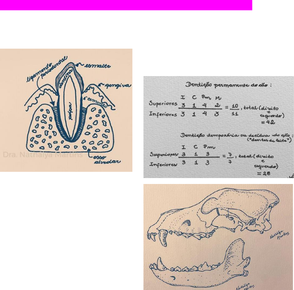 MORFOLOGIA DENTÁRIA DE CÃES NA PRÁTICA ODONTOLÓGICA CONSTITUIÇÃO DO DENTE - osso alveolar: projeções osseas que sustentam os dentes; onde os dentes encontram-se alojados (alvéolos dentários); sofre atrofia com a perda do dente 4 camadas: 1. Periósteo 2. Osso compacto/denso 3. Esponjoso 4. Tábua cribiforme ESTRUTURAS SUPERFICIAIS facilmente palpáveis → pouco musculo Face → forames intraorbitarios e mentonianos; crista sobre a raiz do dente canino superior DENTIÇÃO sistema de Triadon – referência a dentes específicos: Observações: ❖ Em gatos, há ausência de P1 e M2 na maxila e ausência de P1, P2, M2 e M3 na mandíbula ❖ Em braquicefálicos, ausência de P1 superior e M3 inferior PERIODONTIA • Enfermidades das estruturas que suportam e dão funcionalidade • Gengiva, epitélio juncional, ligamento periodontal, cemento e osso alveolar • Gengivite e doença periodontal inflamatória crônica Obs: sinais radiográficos presentes na doença periodontal: ❖ Reabsorção da crista alveolar ❖ Perda da integridade da lamina dura ❖ Alargamento do espaço periodontal ❖ Reabsorção óssea (horizontal, vertical e em áreas de furca) EXODONTIA • Anestesia geral; com ou sem bloqueio regional • Anestesia local • Sindesmotomia; luxação; remoção do dente • Dentes uni-radiculares; bi- radiculares; tri-radiculares Complicações: ❖ Fratura de raiz ❖ Hemorragia intensa ❖ Infecção ❖ Alveolite seca ❖ Soltura de pontos ❖ Fístula ❖ Corrimento nasal Materiais: ❖ Sindesmótomo ❖ Alavancas ❖ Elevadores de raíz ❖ Fórceps (boticão) ❖ Instrumentos para odontossecção Fonte: aula de anatomia topográfia ministrada pela Med. Vet. Dra. Nathálya dos Santos Martins.