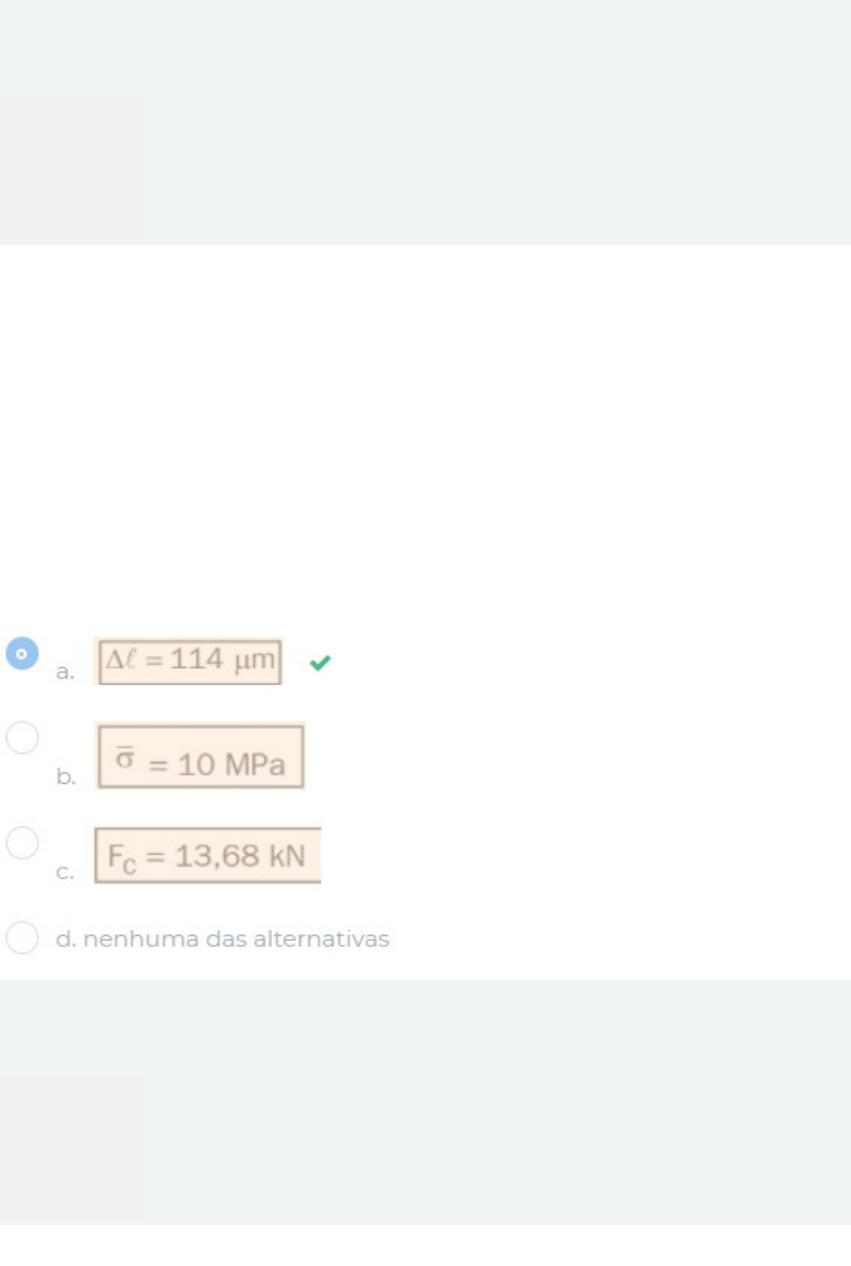 Questão 1 Correto Atingiu 1,00 de 1,00 Marcar questão Texto da questão Uma barra de Al possui secção transversal quadrada com 60 mm de lado e o seu comprimento é de 0,8 m. A carga axial aplicada na barra é de 36 kN. Determinar a tensão normal atuante na barra e o seu alongamento. Como se pode observar, a unidade do lado da secção foi transformada em m (60 mm = 60 x 10-3 m) para que pudéssemos obter a unidade de tensão no SI N/m2 (pascal). Alongamento na barra é? Escolha uma opção: Questão 2 Correto Atingiu 1,00 de 1,00 Marcar questão Texto da questão ∑ MA = 0 3 F1 sen 53° = 4 x 2,2 + 8 x 1 - 5 x 0,8 F1 = ? kN Resposta: Questão 3 Correto Atingiu 1,00 de 1,00 Marcar questão Texto da questão A figura representa duas barras de aço soldadas na secção BB. Assinale: 1 - A deformação longitudinal 2 - O alongamento total da peça Escolha uma opção: Verdadeiro Falso Questão 4 Incorreto Atingiu 0,00 de 1,00 Marcar questão Texto da questão Apresente a resposta correta da área mínima da secção transversal da barra 2. Analogamente a c.2. (só será aceita a resposta completa) Resposta: Questão 5 Correto Atingiu 1,00 de 1,00 Marcar questão Texto da questão Marque a alternativa incorreta referente a essa questão: Escolha uma opção: Questão 6 Correto Atingiu 1,00 de 1,00 Marcar questão Texto da questão Calcule corretamente o Módulo de elasticidade do matéria e apresente o resultado em GPa. Resposta: Questão 7 Correto Atingiu 1,00 de 1,00 Marcar questão Texto da questão Marque (V) Verdadeiro ou (F) Falso: Escolha uma opção: Verdadeiro Falso Questão 8 Correto Atingiu 1,00 de 1,00 Marcar questão Texto da questão Por simetria, conclui-se que: Escolha uma opção: a. F4 = F2 = 29,6 kN b. F4 = F2 = 29,9 kN c. F4 = F2 = 30,6 kN d. F4 = F2 = 20,6 kN e. nenhuma das alternativas Questão 9 Correto Atingiu 1,00 de 1,00 Marcar questão Texto da questão Tensão normal atuante é? Resposta: Questão 10 Correto Atingiu 1,00 de 1,00 Marcar questão Texto da questão Pede-se determinar para a barra de deformação transversal: Escolha uma opção: Verdadeiro Falso 5,3 1280 70 15,3MPa