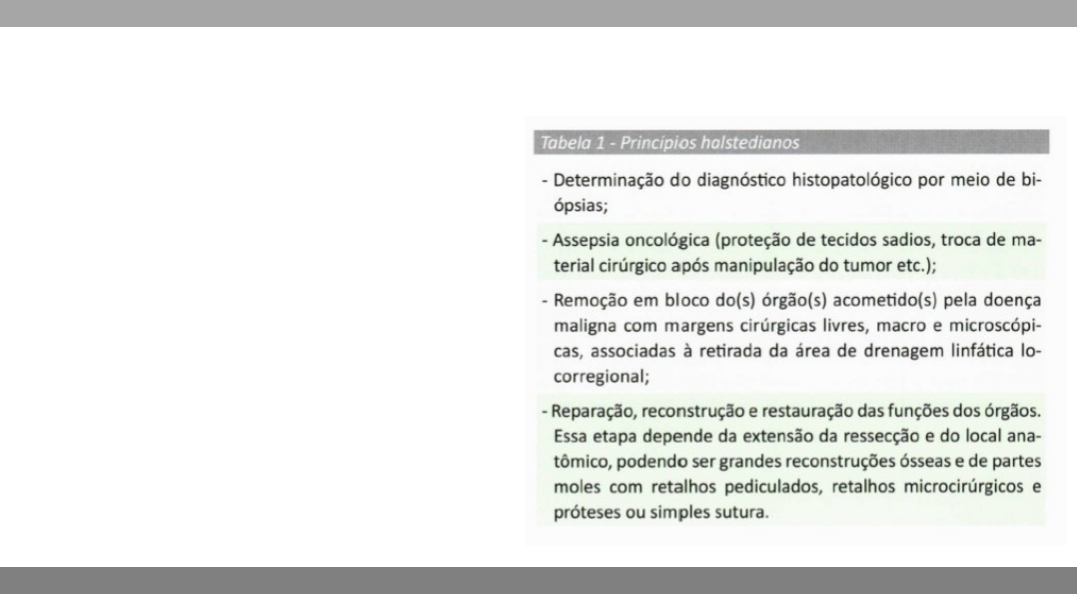 NEOPLASIAS DO TRATO GASTROINTESTINAL BASES DA CIRURGIA ONCOLÓGICA O câncer é o crescimento anormal de células em qualquer parte do corpo. Essas células anormais se reproduzem localmente, atravessam a barreira tissular e migram para todo o corpo. Durante muito tempo, a cirurgia foi o único tratamento para câncer, mas com o avanço dos estudos, drogas antineoplásicas, quimioterapia e radioterapia foram adicionados as terapêuticas. · Cirurgia e radioterapia: tratamento para câncer locorregional · Quimioterapia: tratamento sistêmico para os casos de metástase · Tratamento neoadjuvante: uso de quimio/radioterapia para diminuir o tumor antes da cirurgia · Tratamento adjuvante: uso de quimio/radioterapia após a cirurgia com intuito curativo A cirurgia oncológica segue os princípios halstedianos. CÂNCER DE ESÔFAGO EPIDEMIOLOGIA: - Entre as 10 neoplasias malignas mais incidentes no Brasil (benigno mais comum: leiomioma) - Predomina no sexo masculino (escamoso = 3:1; adenocarcinoma = 15:1) - Geralmente se apresenta a partir dos 40 anos de idade (a maior mortalidade é entre 60-70 anos) - O tipo escamoso é mais comum em negros; adenocarcinoma é raro neste grupo, sendo uma doença típica de brancos - Os países com maior incidência de Ca de esôfago são da Ásia e da África, nesses locais, o tipo mais comum ainda é o carcinoma escamoso TIPO HISTOLÓGICO: Atualmente, se reconhecem dois tipos histológicos principais: (1) carcinoma escamoso ou epidermoide: é derivado do epitélio estratificado não queratinizado, característico da mucosa normal do esôfago. Se origina principalmente no terço médio do órgão (em 50% dos casos). Fatores de Risco – etilismo e o tabagismo; Ingestão habitual de bebidas muito quentes (em torno de 65°C); alimentos ricos em compostos N-nitrosos (produtos defumados); contaminação com fungos produtores de toxina; deficiência de selênio, zinco, molibdênio e vitaminas (principalmente A). Acalásia; síndrome de Plummer-Vinson; estenose cáustica. Tilose palmar e plantar (raro distúrbio genético autossômico dominante, caracterizado por hiperceratose na palma das mãos e planta dos pés) nesses pacientes o risco se aproxima a 95%. Bulimia, infecções fúngicas crônicas, HPV, exposição à radiação, história pessoal de câncer no trato aerodigestivo (cabeça, pescoço e pulmão), presença de divertículos no esôfago e doença celíaca. (2) adenocarcinoma: é derivado do epitélio de Barrett – metaplasia intestinal que complica alguns pacientes com DRGE erosiva. Portanto, este tumor é localizado no terço distal do esôfago e, eventualmente, se confunde com o adenocarcinoma da cárdia (junção esofagogástrica). Está aumentando em incidência, em alguns países como os EUA já é o tipo mais comum de câncer de esôfago (70%). No Brasil e em outros países pobres, o tipo mais comum ainda é o escamoso. Fatores de Risco – presença do epitélio de Barrett, secundário à forma erosiva da esofagite de refluxo (10-15% dos pacientes com DRGE sintomática desenvolvem esôfago de Barrett e sesses, 1 a cada 200 pacientes-ano desenvolve adenocarcinoma de esôfago - incidência de 0,5% ao ano); Tabagismo e obesidade. O etilismo, por outro lado, NÃO está associado ao adeno (o consumo de vinho tinto, inclusive, parece reduzir a incidência de adenocarcinoma do esôfago). Acredita-se também que o uso de bisfosfonados orais (alendronato) esteja implicado no risco (tanto escamoso quanto adenocarcinoma). O FDA recomenda que esta classe de drogas seja contraindicada nos portadores de esôfago de Barrett. Raramente, o esôfago também pode ser sede de metástases de outros cânceres, em particular mama, pulmão e melanoma primário da pele. MANIFESTAÇÕES CLÍNICAS: sintomas iniciais podem ser inespecíficos, como uma dor retroesternal mal definida ou queixas de “indigestão”. No entanto, a principal manifestação clínica é a disfagia, que geralmente se inicia para sólidos e evolui para líquidos. A perda ponderal é um achado clássico. (sintomas iguais aos de acalasia, diagnostico diferencial) Lesões mais avançadas apresentam-se com halitose e, às vezes, tosse após ingestão de líquidos. A rouquidão por envolvimento do nervo laríngeo recorrente e a hematêmese são sintomas menos comuns. Icterícia (infiltração hepática metastática) e dispneia (infiltração pulmonar metastática) são manifestações menos prevalentes, e indicam doença extremamente avançada. Infelizmente, para ter disfagia mecânica, o câncer já deve ter envolvido grande parte da circunferência esofágica (em geral > 2/3 do lúmen). DIAGNÓSTICO: bem diagnosticados pela análise conjunta da Esofagografia Baritada + endoscopia digestiva alta com biópsia. No exame baritado, a diferenciação entre estenose péptica e câncer de esôfago não é difícil: neste último, é nítida a irregularidade da mucosa e a súbita transição entre o esôfago normal e a obstrução (“sinal do degrau”). Em relação à localização do tumor, cerca de 50% encontram-se no terço médio, 25% no terço superior e 25% no terço inferior. ESTADIAMENTO: Feito com USG endoscópica. O câncer de esôfago se caracteriza por ter um comportamento extremamente agressivo, disseminando-se localmente e a distância. A rica rede linfática presente na lâmina própria e na submucosa (intramural) facilita a disseminação linfonodal precoce. A ausência de serosa facilita a disseminação do tumor para órgãos adjacentes (por contiguidade). Os tumores do terço superior e médio invadem a árvore traqueobrônquica, a aorta e o nervo laríngeo recorrente, enquanto os tumores do terço distal avançam sobre o diafragma, pericárdio e estômago.Cerca de 75% dos pacientes diagnosticados com Ca de esôfago já apresentam invasão linfática no momento do diagnóstico. As metástases à distância mais importantes são: fígado e pulmão, ocorrendo também para ossos e rins. O