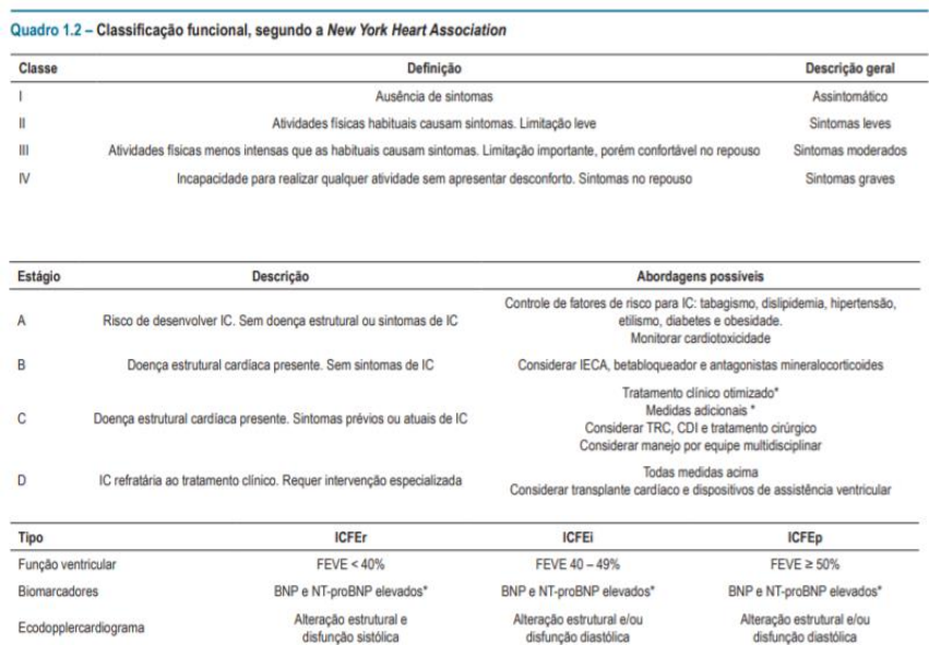 Ana Clara Quirino – 69 FACULDADE DE MEDICINA DE BARBACENA CARDIOLOGIA, CLÍNICA MÉDICA I Aula 10 – Prof. Daniel Vidigal Casos clínicos Paciente masculino, 59 anos, hipertenso e dislipidêmico, evoluindo com quadro de dispnéia aos grandes esforços há 8 meses com piora da dispnéia aos médios esforços (subir 2 lances de escadas) há 3 meses. Relata episódios de dor torácica em aperto quando sobe a rua íngreme da sua casa. Nega outras comorbidades. Faz uso regular de valsartan 160mg, anlodipino 10mg e atorvastatina 20mg. Relata, ainda, ser tabagista de 1 maço/dia há 29 anos. Nega história familiar de cardiopatias. No exame: RCR 2 tempos, bulhas normofonéticas, sem sopros, FC 84 bpm e PA 110/82 mmHg. Murmúrio vesicular fisiológico com crepitações finas bibasal. Abdome livre, sem visceromegalias. MMII com edema +/+4. ECG em ritmo sinusal, com sinais de sobrecarga ventricular esquerda. Traz ecocardiograma realizado há 20 dias que mostrava: VE com hipertrofia excêntrica e hipocinesia difusa de suas paredes, fração de ejeção do VE (FEVE) de 32%, grau I de disfunção diastólica do VE, VD normal, insuficiência mitral e tricúspide discretas, pressão sistólica na artéria pulmonar (PSAP) = 42 mmHg ( normal < 30 mmHg ). 1) Qual o diagnóstico sindrômico desse paciente? Insuficiência cardíaca congestiva. 2) Qual a classe funcional (NYHA), estágio da IC e classificação baseada na FEVE? Classe III, Estágio C, tipo ICFEr Ana Clara Quirino – 69 3) Qual possível diagnóstico etiológico da IC? Cardiopatia hipertensiva, cardiomiopatia dilatada idiopática (coração dilatada sem causa conhecida), isquêmica (paciente relata angina pode ter DAC). 4) Quais exames poderiam auxiliar no diagnóstico e/ou acompanhamento do caso? BNP e NT-proBNP, ECO de stress (ver isquemia), angioTC coronária (avaliação não invasiva da presença de DAC), cintilografia miocárdica (avaliação funcional não invasiva da perfusão miocárdica), cateterismo, ressonância magnética cardíaca (caro, usa quando o ECO não traz muita info). Não faz radiografia (paciente já trouxe o ECO e ECG). Ana Clara Quirino – 69 5) Qual deveria ser o tratamento não farmacológico para o caso? Equipe multidisciplinar, autocuidado diário (peso, atividade física, cuidados com dieta, monitorização dos sinais e sintomas de descompensação, como piora do cansaço, flutuações de peso e limitação funcional), restrição de sódio, perda de peso, parar de fumar e vacina (inclusive COVID). 6) Quais classes de medicamentos devemos introduzir nesse paciente e por que a escolha de cada uma delas? Trocar BRA por IECA para reduzir morbidade e mortalidade BB: primeira linha no tratamento da ICFEr, pois determinam benefícios clínicos na mortalidade global, na morte por IC e por morte súbita, melhora sintomas e reduzirem taxas de re-hospitalizações Antagonista dos receptores mineralocorticóide: para reduzir morbidade e mortalidade Diurético: melhora sintoma, diminui congestão. Ana Clara Quirino – 69 Paciente feminina, 83 anos, HAS e obesa, evoluindo com quadro de dispnéia ao tomar banho e mesmo em repouso há 6 meses. Não faz uso regular da medicação anti-hipertensiva. Nega precordialgia. Relata episódios esporádicos de palpitação. Ao exame: RCI em 2 tempos, bulhas normofonéticas, sopro sistólico II/VI em foco aórtico, FC 98 bpm (taquicardia) e PA 152/95 mmHg. Murmúrio vesicular fisiológico com crepitações finas bibasal. Abdome livre, sem visceromegalias. MMII com edema +++/+4. ECG em ritmo sinusal, sobrecarga atrial esquerda, extrassístoles atriais freqüentes. Ecocardiograma: VE com hipertrofia concêntrica moderada, FEVE de 52%, aumento leve do AE, estenose aórtica leve, grau II de disfunção diastólica, VD normal, insuficiência mitral leve, pressão sistólica na artéria pulmonar (PSAP) = 50 mmHg ( normal < 30 mmHg). Dosagem de BNP = 240pg/mL (valor referência < 50pg/mL). 1) Qual o diagnóstico sindrômico desse paciente? Insuficiência cardíaca congestiva; 2) Qual a classe funcional (NYHA), estágio da IC e classificação baseada na FEVE? Classe IV (dispnéia mesmo em repouso), estagio C (ela tem doença estrutural e sintomas), ICFEp (FE > 50%); 3) Qual possível diagnóstico etiológico da IC? Cardiopatia hipertensiva, valvopatia (pouco provável, idoso já tem calcificação), taquicardiomiopatia (arritmia); 4) Quais exames poderiam auxiliar no diagnóstico e/ou acompanhamento do caso? ECO de stress, angiotomografia, cintolografia miocárdica, cateterismo não é indicado, holter (avaliar arritmia). 5) Qual deveria ser o tratamento não farmacológico para o caso? Multidisciplinar, dieta, vacina, perda de peso (caminhada na reabilitação). 6) Quais classes de medicamentos devemos introduzir nesse paciente e por que a escolha de cada uma delas? Diuréticos de alça ou tiazídicos para diminuir sintomas congestivos; tratamento de comorbidades (HAS no caso dela IECA) para diminuir sintomas ou progressão da doença, espironolactona para redução de hospitalizações, BRAs para redução de hospitalizações. Ana Clara Quirino – 69 Prognóstico: paciente geralmente para de tomar os remédios depois que apresenta certa melhora, por isso é importante conversar com ele e incentivar a manter o tratamento de maneira regular, para diminuir a mortalidade (ICC mata mais que câncer, mas não é vista com a mesma seriedade).