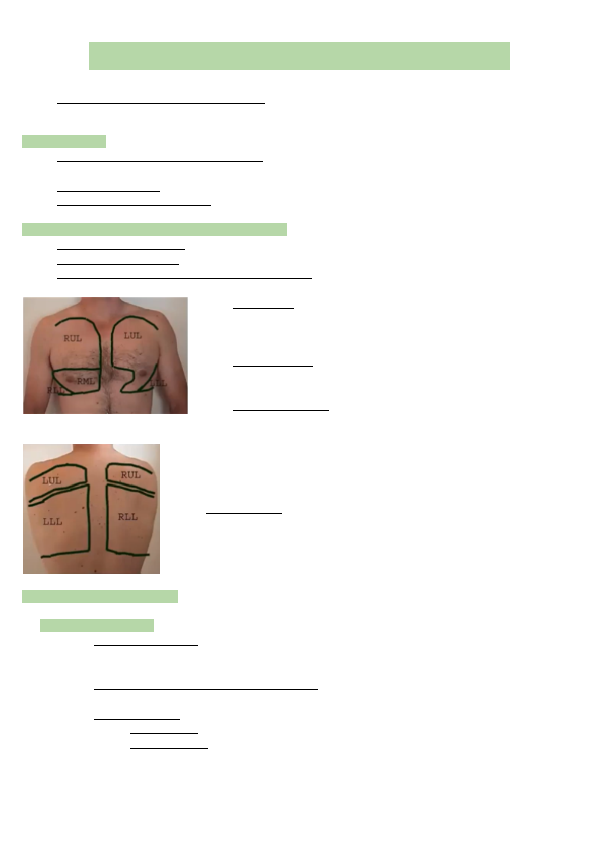 Ana Júlia Ornelas Piedade - MED 104 Aula 2 - 12/08 Exame Físico do Aparelho Respiratório ❖ O exame do tórax se inicia pelas mãos: baqueteamento digital, impregnação pela fumaça de cigarro, cianose (fenômeno de Raynaud); Exame de Tórax ❖ Posicionamento adequado do paciente: sentado, deitado, semi-recostado ou de pé; ❖ Ex.: no paciente com derrame pleural, na posição semi-recostado, o líquido fica na base do pulmão; ❖ Exposição do tórax; ❖ Inspeção estática e dinâmica; Projeções Pulmonares na parede anterior do tórax ❖ Limite superior anterior: 2cm acima da borda medial da clavícula; ❖ Limite inferior anterior: ao nível do 6º arco costal na linha hemiclavicular - apêndice xifóide; ❖ No 4º espaço costal na linha paraesternal direita: divisão do lobo superior e lobo médio; ● Mediastino: coração, traquéia, esôfago e grandes vasos. Fica localizado entre os 2 pulmões; ● Linhas tracejadas delimitando o parênquima pulmonar direito e esquerdo; ● Pulmão direito: 3 lobos (superior, médio e inferior) e 2 fissuras (horizontal e oblíqua). O lobo médio só tem referência anterior, posteriormente não tem essa divisão; ● Pulmão esquerdo: 2 lobos (superior, incluindo a língula e inferior) e 1 fissura (oblíqua); ● Lobo superior direito e esquerdo; ● Lobo inferior direito e esquerdo; ● Sem lobo médio; ● Na altura de T4 ocorre essa divisão dos lobos superiores e inferiores; ● Limite inferior: 4 dedos horizontais abaixo da ponta das escápulas Sequência do exame do tórax ❖ Sequência: inspeção, palpação, percussão e ausculta; ❖ Inspeção estática: ● Posição da traqueia: observar se está centralizada em relação ao esternocleidomastoideo. Mas, geralmente, as alterações torácicas só provocam desvios traqueais dentro do tórax, pouco visível na região cervical. ● Abaulamentos, retrações, lesões cutâneas: quando achar alterações, como cicatriz, é necessário descrever a localização, se está inflamada, se tem os sinais flogísticose etc; ● Formas de tórax: ➢ Tórax normal: o diâmetro ântero-posterior é menor do que o latero-lateral; ➢ Tórax em tonel: comum em pacientes com DPOC, diâmetro ântero-posterior está aumentando por aumento da retenção aérea. O pulmão fica hiperinsuflado empurrando o Ana Júlia Ornelas Piedade - MED 104 esterno para frente e o diafragma para baixo (região abdominal). Há aumento do diâmetro ântero-posterior por causa do aumento da retenção aérea. A hiperinsuflação empurra o esterno para frente e o diafragma para baixo (radiografia); ➢ Tórax de pombo ou peito em quilha: alteração da forma do esterno, protraído. Pode ser uma má formação sem relação com doenças, ou pode estar relacionado a doenças; ➢ Pectus escavatum ou tórax em funil: processo estético, não há doenças relacionadas (raro ter); ➢ Cifoescoliótico: a cifoescoliose é um desvio anterior-lateral da coluna vertebral que provoca deformidade torácica e altera a dinâmica ventilatória dentro da caixa torácica. A capacidade de gerar pressão negativa fica muito comprometida e os pacientes puxam menos ar (ventilam menos) e ao longo prazo os gases sanguíneos são alterados e começam a reter CO2 e diminuir o O2. Com isso, a artéria pulmonar sofre vasoespasmo e começa a longo prazo a trazer alteração dessa troca gasosa e os pacientes começam a evoluir para um quadro de cor pulmonale (insuficiência do ventrículo direito causada por uma doença pulmonar), podendo levar a falência cardíaca direita e até respiratória; ➢ Ginecomastia: é a presença de tecido glandular desenvolvido no paciente do sexo masculino; ➢ Linhas do tórax: ● Região supraclavicular direita e esquerda; 2 Ana Júlia Ornelas Piedade - MED 104 ● Região infraclavicular direita e esquerda; ● Região mamária direita e esquerda; ● Região infra mamária direita e esquerda; ● Região esternal; ● Região supra escapular direita e esquerda; ● Região escapular direita e esquerda; ● Região infra escapular direita e esquerda; ● Região interescapulovertebral direita e esquerda; ● Região axilar; ● Região infra axilar. ❖ Inspeção dinâmica: ● Não podemos avisar ao paciente que iremos analisar sua frequência respiratória; ● É necessário que o paciente retire a camisa para melhor visualização do tórax; ● Ritmo respiratório: ➢ Normal/usual: é atípico; ➢ Taquipnéia: acima de 20 rpm; ➢ Dispnéia Suspirosa: volume corrente usual, inspira mais profundamente, não é associada a patologia; ➢ Ritmo de Biot: volume corrente se altera/sem regularidade, não tem ritmicidade/valores homogêneos. Está relacionado a doenças do SNC - traumatismo cranioencefálico, AVC; ➢ Ritmo de Cantani: não tem pausas inspiratórias e expiratórias, ritmo rápido e amplo, o volume corrente aumentado. Está relacionado a cetoacidose diabética; ➢ Ritmo de Kussmaul: volume grande, pausa, volume grande, pausa. Está relacionado a acidose metabólica (cetoacidose diabética); ➢ Ritmo de Cheyne-Stokes: volume corrente pequeno e vai aumentando aos poucos, depois vai fazendo o caminho inverso até dar uma pausa (apneia) e vai crescendo de novo. Está associado a insuficiência cardíaca grave; 3 Ana Júlia Ornelas Piedade - MED 104 ● Sinais de esforço respiratório: ➢ Tiragem intercostal: retração da pele entre um arco intercostal e outro; ➢ Tiragem subcostal: limite inferior torácico (rebordo costal) retraído na inspiração; ➢ Retração na fúrcula esternal: no ângulo do manúbrio; ➢ Uso de musculatura acessória cervical: esternocleidomastóideo e os escalenos; ➢ Batimentos de asas do nariz; ➢ Respiração paradoxal: há tiragem intercostal. O paciente inspira e o abdome retrai, porque o diafragma já perdeu sua função, entrou em fadiga. Só a musculatura intercostal está funcionando de maneira mais intensa, aí quando o paciente inspira, o d