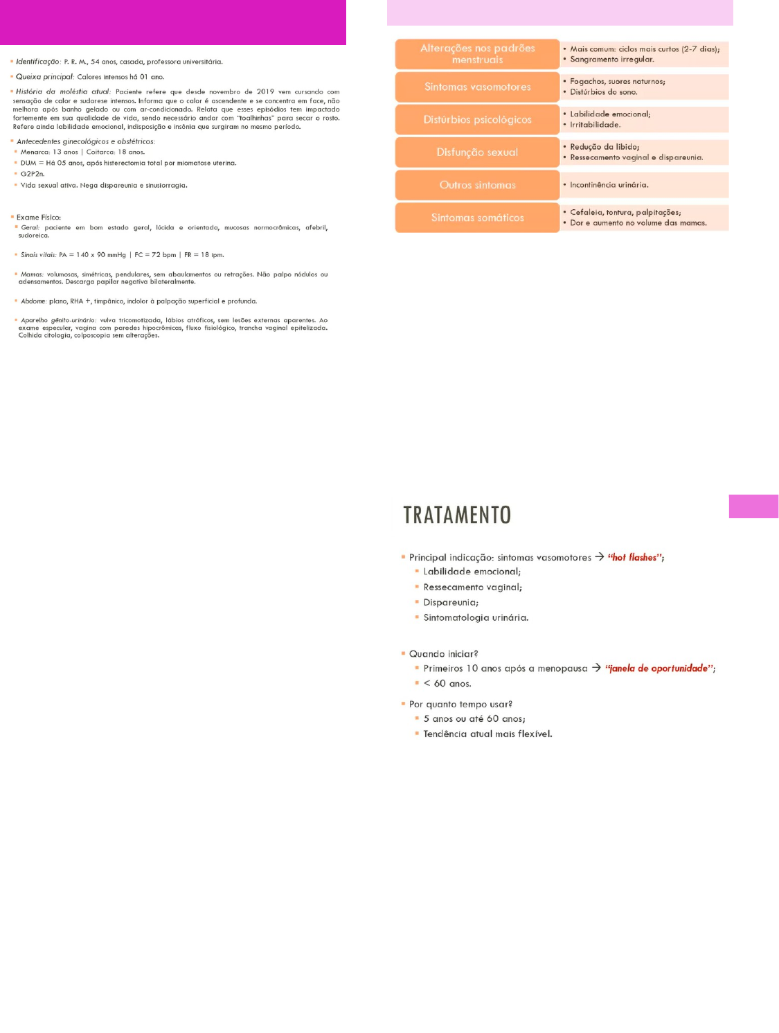 Keyse Mirelle – 4° Período Ginecologia Prática 2 atenção à mulher climatéria – aula 7 – 03/11/2020 Dispaneuria= dor na relação sexual. Sinusiorragia= sangramento na relação sexual. Obs: Sinais de atrofia compatível com o período que a mulher passa perimenopausa, esse período de climatério, vamos olhar para vulva dessa mulher e vemos que ela perde o coxim adiposo (fica embaixo da vulva), ou seja, essa vulva perde o turgor, a elasticidade da pele, então dizemos que esses lábios estão atróficos. Devemos valorizar no exame físico da paciente o trofismo da vulva, lábios e a coloração mais hipocromica. E no exame especular. Nesse período perimenopausa a mulher apresenta um hipoestrogenismo, ou seja, a queda do estrogênio típica desse período, logo a parede da vagina fica hipocrômica (parede mais pálida). Obs: O fluxo fisiológico é importante, então se tiver sem esse fluxo pontuamos que existe algum grau de ressecamento vaginal. Trancha vaginal epitelizada (a vagina termina em um fundo cego, vemos no exame escapular) é uma cicatriz da histerectomia, ela fez uma histerectomia total, então tirou o colo e o corpo do útero também. É uma paciente que parou de menstruar há 5 anos, porque retirou o útero, mas ainda assim as queixas climatéricas dela só começaram a um ano. Ou seja, na histerectomia tendemos a tirar o útero e as trompas, logo preservamos o máximo os ovários do paciente e toda sua irrigação para que eles continuem produzindo os hormônios. Então, ela só deu sinais que essa função ovariana não está funcionando mais. sinais e sintomas O grau dos sintomas que a paciente apresenta vai aparecer no exame físico e no clínico. A dispareunia tem relação com o ressecamento vaginal. Vale ressaltar que ela é multifatorial, logo ela pode ter dor por conta do ressecamento ou por conta da queda do libido. O climatério é o período da perimenopausa que vem todos os sintomas, por isso chamamos de sintomas climatéricos. A menopausa é o climatério há 12 meses, então é uma data. Vamos tratar a paciente que tem queixa. Os sintomas vasomotores é aqueles calores que sobem pelo pescoço e vem pela face. Além disso apresenta outros sintomas, mas devemos pensar muito sobre os riscos/benefícios de instituir a reposição hormonal. Em casos de terapia sistêmica, ou seja, uso de adesivo e comprimido, devemos ficar atento as condições que contraindicam o uso da terapia e o seu risco para a paciente. Sendo assim, precisamos saber quando iniciar. Na janela de oportunidade, primeiros 10 anos pós menopausa, tem benefícios de reposição hormonal. Além disso, isso deve ser iniciado antes dos 60 anos de idade. Devemos utilizar por 5 anos ou até a pessoa fazer 60 anos. O WHI (estudo que norteia a terapia hormonal), essas pacientes precisam fazer uma USG de mama regularmente e mamografia também, já as pacientes que tem útero temos que medir o endométrio para ver se a terapia não está aumentando o endométrio, buscar medir o risco cardiovascular. Logo, devemos acompanhar a paciente de perto. terapia de reposição hormonal Obs: Essa reposição hormonal não promove a supressão do eixo. O estrógeno isolado vamos utilizar em pacientes que não tem útero, mas preciso descartar uma endometriose, porque nesse caso não vou ter risco de proliferação de endométrio. Já quando tenho uma paciente com útero temos que dar progesterona (para antagonizar o efeito do estrógeno e evitar que o endométrio sofra uma hiperplasia, então isso aumenta o risco de Câncer de endométrio) + estrógeno. O estrógeno isolado é dado de forma contínua, temos algumas vias de administração, são elas: via oral; transdérmica; percutânea; subdérmica, vale ressaltar que todas citadas são através do estradiol. Já nas pacientes com útero, precisamos da antagonização da progesterona para prevenir a hiperplasia endometrial, em mulheres histerectomizadas com focos de endometriose precisa desse tratamento para que esses focos não aumentem. E temos os tipos de regime, temos o cíclico (que imita um ciclo menstrual e vamos dar estrogênio continuamente ou fazemos o estrógeno 21 dias por mês e a progesterona por 10-14 dias) ou o contínuo (uma associação do estrógeno e da progesterona sem interrupção). Objetivo: evitar a hiperplasia do endométrio. Tratamento não hormonal - Pacientes hipertensas devemos ter cuidado, logo o cardiologista deve liberar o uso de um determinado medicamento. Os inibidores seletivos de captação da serotonina (ISRS) e os inibidores seletivos da recaptação da serotonina e noradrenalina (ISRSN). E temos também as drogas de ação central. Usamos mais o ISRS e ISRSN. RESUMO DO CASO: - Ela tem indicação de reposição de terapia hormonal, logo ela tem queixa, mas ela não pode sair com uma prescrição de terapia hormonal, por conta da sua PA. - Devemos solicitar alguns exames: uma USG pélvica, uma USG mama, mamografia, MAPA, MRPA, avaliação ambulatorial. - O estrógeno isolado pode ser uma opção de tratamento, por ela não tem útero e não ter histórico. Obs: A dosagem de hormônio não é relevante. - Normalmente o diagnóstico de climatério é clínico. Devemos pedir o exame de TSH para excluir determinados diagnósticos que caso apresente pode interferir no ciclo da paciente. Logo, vamos pedir todos os hormônios tireoidianos. OBS: NÃO CONFUDIR HORMÔNIO TIREOIDIANO COM SEXUAL. Paciente apresenta sinais de falência. Essa paciente está no climatério, mas não é uma paciente menopausada porque só tem 5 meses de irregularidade menstrual. Apresenta queixa de lubrificação vaginal reduzida (outra queixa). Principal queixa: irregularidade menstrual. - Tratamento tópico (nesse caso não precisamos de progesterona) para essa paciente, usar lubrificantes a base de água em casos de atrofia vulvovaginal. Mas se a paciente não apresentar melhora devemos tratar através de estrógeno por via vaginal em baixa dos