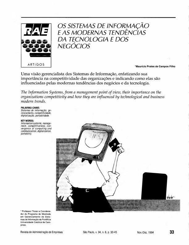 ARTIGOS -OS SISTEMASDE INFORMAÇAO EAS MODERNAS TENDÊNCIAS DA TECNOLOGIA E DOS NEGÓCIOS 'Maurício Prates de Campos Filho Uma visão gerencialista dos Sistemas de Informação, enfatizando sua importância na competitividade das organizações e indicando como elas são influenciadas pelas modernas tendências dos negócios e da tecnologia. The Information Systems, from a management point of view, their importance on the organizations competitivity and how they are influenced by technological and business modern trends. PALAVRAS-CHAVE: Sistemas de informação, ge- renciamento, competitividade, digitalização, portabilidade. KEYWORDS: Inforrnation systems, manage- ment, competitiveness, con- vergence of computing and communication, digitalization, portability * Professor Titular e Coordena- dor do Programa de Mestrado em Gerenciamento de Siste- mas de Informação da Pontifícia Universidade Católica de Cam- pinas. São Paulo, v. 34, n. 6, p. 33-45 33Revista de Administração de Empresas Nov./Dez. 1994 i1~lÉARTIGOS ,-----~_._--,-------- Os sistemas de informação (5.1.)podem afetar das mais variadas formas o desem- penho das modernas organizações, abrin- do-lhes, inclusive, novos espaços e opor- tunidades de atuação competitiva, moti- vo pelo qual os gerentes e administrado- res não podem se furtar a compreender sua natureza e a utilizar seus recursos com efi- cácia. O leque de novas oportunidades que os 5.1. trazem começa com a melhoria e otimização das operações internas da or- ganização, indo até suas operações exter- nas, auxiliando na competitividade van- tajosa através de benefícios diretos aos clientes ou usuários. Por outro lado, os 5.1. também podem acrescentar novos riscos ao desempenho organizacional, tais como Iilh!lEi' Representação dos elementos e componentes do S.1. SISTEMA DE INF RMAÇÃO PRATICAS Dt 'qABALHO vulnerabilidade a acidentes, ao vandalis- mo e ao uso estratégico de 5.1. pelos com- petidores. Assim, os 5.1. podem ser con- ceituados, do ponto de vista do seu gerenciamento, como uma combinação estruturada de informação, recursos hu- manos, tecnologias de informação e práti- cas de trabalho, organizados de forma a permitir o melhor atendimento dos obje- tivos da organização. Essa conceituação é bastante abrangente, mas tesn a vantagem de levar a uma compreensão maior sobre os usos e limitações dos sistemas conven- cionais e tradicionais de negócios ou servi- ços, assim como sobre os possíveis impac- tos de futuras inovações no comportamen- to organizacional. De acordo com essa con- ceituação, os seguintes exemplos podem ser considerados como 5.1. consistentes': 1. ALTER,S. Information sys- tems - a management pers- pective. New Work: Addison Wesley, 1992. 34 ., sistemas interativos usados por geren- tes e executivos de alto escalão para o monitoramento das operações de sua empresa; • sistemas biométricos que garantem aces- so seletivo a setores de segurança da or- ganização, através de leitura e análise de impressões digitais ou de vasos san- güíneos da retina ocular; sistemas de reservas de companhias aé- reas usados por agentes de viagem para fazer o booking de vôo de seus clientes; • sistemas de videoconferência usados para manter coordenados os gerentes de marketing geograficamente dispersos de uma mesma empresa. OS COMPONENTES IDO 8.1 A figura 1 procura expandir o conceito de 5.1., mostrando esquematicamente as correlações existentes entre os objetivos organizacionais e os componentes infor- mação, práticas de trabalho, recursos hu- manos e tecnologias de informação. Essa figura enfatiza que o ponto focal para o entendimento da natureza do 5.1. são as práticas de trabalho, e não as tecnologias de informação, como pode parecer à pri- meira vista. A chave para a conceituação está na forma através da qual os compo- nentes interagem para criar práticas de tra- balho que atendam convenientemente os objetivos da organização. A figura 1 tam- bém fornece um formato básico para de- senvolver a configuração de qualquer tipo ou exemplo de 5.1. Os objetivos organizacionais Os objetivos organizacionais não são exatamente um componente do 5.1., mas exercem um papel vital na determinação das práticas de trabalho. São os objetivos que provêem os critérios básicos para se decidir como e quando as práticas de tra- balho da organização devem ser alteradas e adaptadas. Outros determinantes de im- portância são as características dos recur- sos humanos, a informação disponível e as tecnologias de informação em uso, além de outros fatores externos ao sistema. O lançamento de um produto novo no mer- cado, por exemplo, pode motivar rapida- mente uma variedade de práticas de tra- balho, combinando sistemicamente os re- cursos humanos, as informações e as tec- nologias de informação. © 1994, Revista de Administração de Empresas / EAESP / FGV, São Paulo, Brasil. OS SISTEMAS DE INFORMAÇÃO E AS MODERNAS TENDÊNCIAS... As práticas de trabalho As práticas de trabalho consistem nos métodos utilizados pelos recursos huma- nos para desempenhar suas atividades no 5.1.,incluindo não somente os procedimen- tos descritos pelos manuais de operação, mas também as linhas de ação nas quais os recursos humanos se coordenam, se co- municam e tomam decisões, realizam ne- gócios ou serviços e desempenham outras tarefas. Note-se que se usa o termo "prátí- cas de trabalho" e não "procedimentos", implicando que os 5.1. incluem tanto as atividades orientadas aos procedimentos, como as atividades orientadas aos recur- sos. As atividades orientadas ao procedi- mento são aquelas utilizadas para tarefas repetitivas e rotineiras, tais como a emis- são de ordens de compra e de faturas, ao passo que as atividades orientadas ao re- curso, tais como planilhas de cálculo e pacotes gráficos, servem para dar suporte aos recursos humanos na comunicação e na tomada de decis