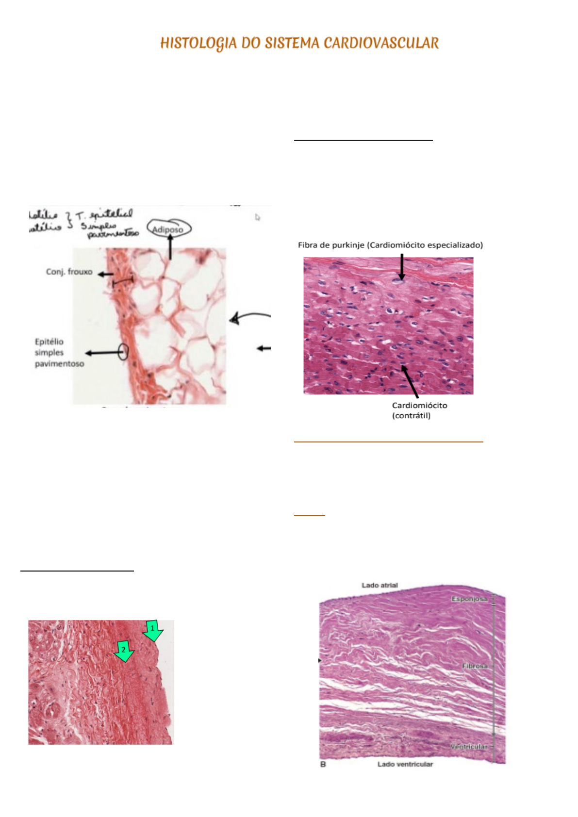 Histologia do sistema cardiovascular: coração Paredes do coração; esqueleto fibroso; valvas; S. de condução elétrica; câmaras cardíacas. Epicárdio Camada mais externa Epitélio(mesotélio) simples pavimentoso > tec.conjuntivo frouxo > tec. adiposo(vasos e gânglios nervosos) Miocárdio Músculo estriado cardíaco > cardiomiócito(contração do tec.) em várias direções. Discos intercalares: zônula de adesão, desmossomos, junções comunicantes Cardiomiócitos: contráteis(para bombear sangue); mioendócrinos (controlar pressão, sintetizam fator natriurético atrial); nodais(controlam a contração rítmica/ nós); fibras de purkinje(propagam a contração rítmica do coração). Diferença de espessura: Átrio direito > átrio esquerdo > ventrículo direito > ventrículo esquerdo Endocárdio Endotélio Epitélio simples pavimentoso > subendotelial Tec conjuntivo frouxo > denso não modelado > subendocárdio continuação do tec conjuntivo com fibras de purkinje na área dos ventrículos(pode ser ausente em algumas regiões). Sistema condutor do coração Nó sinoatrial/SA (marcapasso) - Nó atrioventricular/AV > estímulo vai para os feixes > entram dos ventrículos na direção das fibras de purkinje(ramos subendocárdicos). OBS: Cardiomiócitos são menores que as fibras de purkinje e mais escuros Esqueleto fibroso ou esqueleto cardíaco Conjuntivo denso não modelado, presente em volta das valvas cardíacas e no trígono fibroso. Tem função de sustentação e isolante elétrico. Valvas • Camada esponjosa – conjuntivo frouxo + endotélio • Camada fibrosa – conjuntivo denso não modelado • Camada ventricular – conjuntivo denso não modelado + endotélio