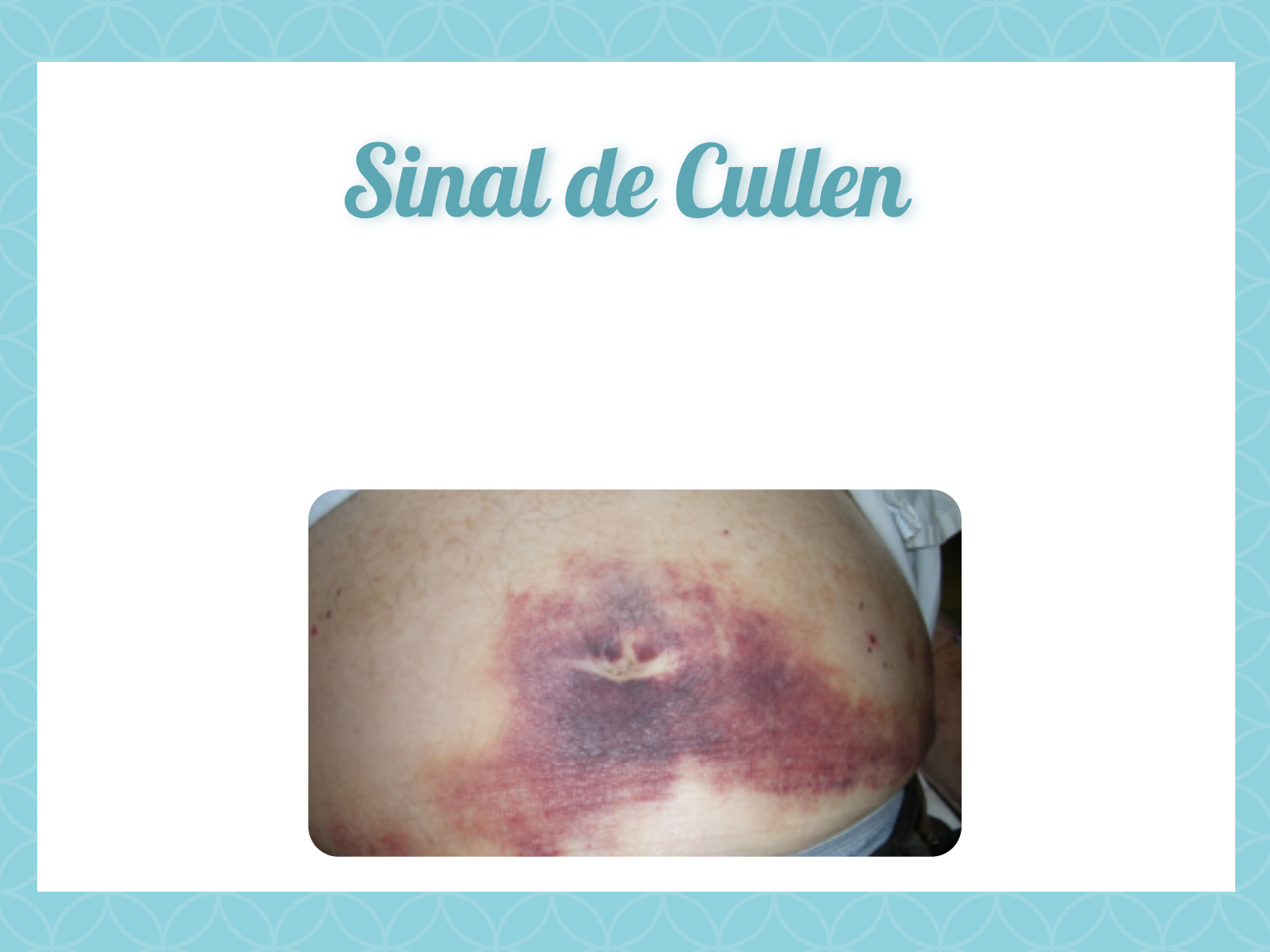 O Sinal de Cullen é um sinal médico que é caracterizado equimoses azuis-pretas na região periumbilical devido à hemorragia retroperitoneal, associada principalmente à ruptura de gravidez ectópica, mas também eventualmente presente na pancreatite aguda. enf_sara