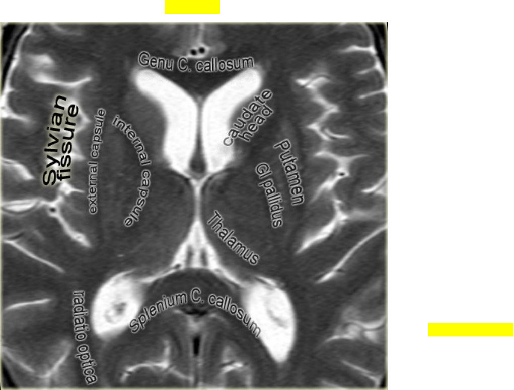 Eva Carneiro | Radiologia 2 NEURORRADIOLOGIA ANATOMIA – Tálamo · Neste nível, os gânglios da base são vistos. · As duas linhas escuras medialmente ao tálamo são as veias cerebrais internas.