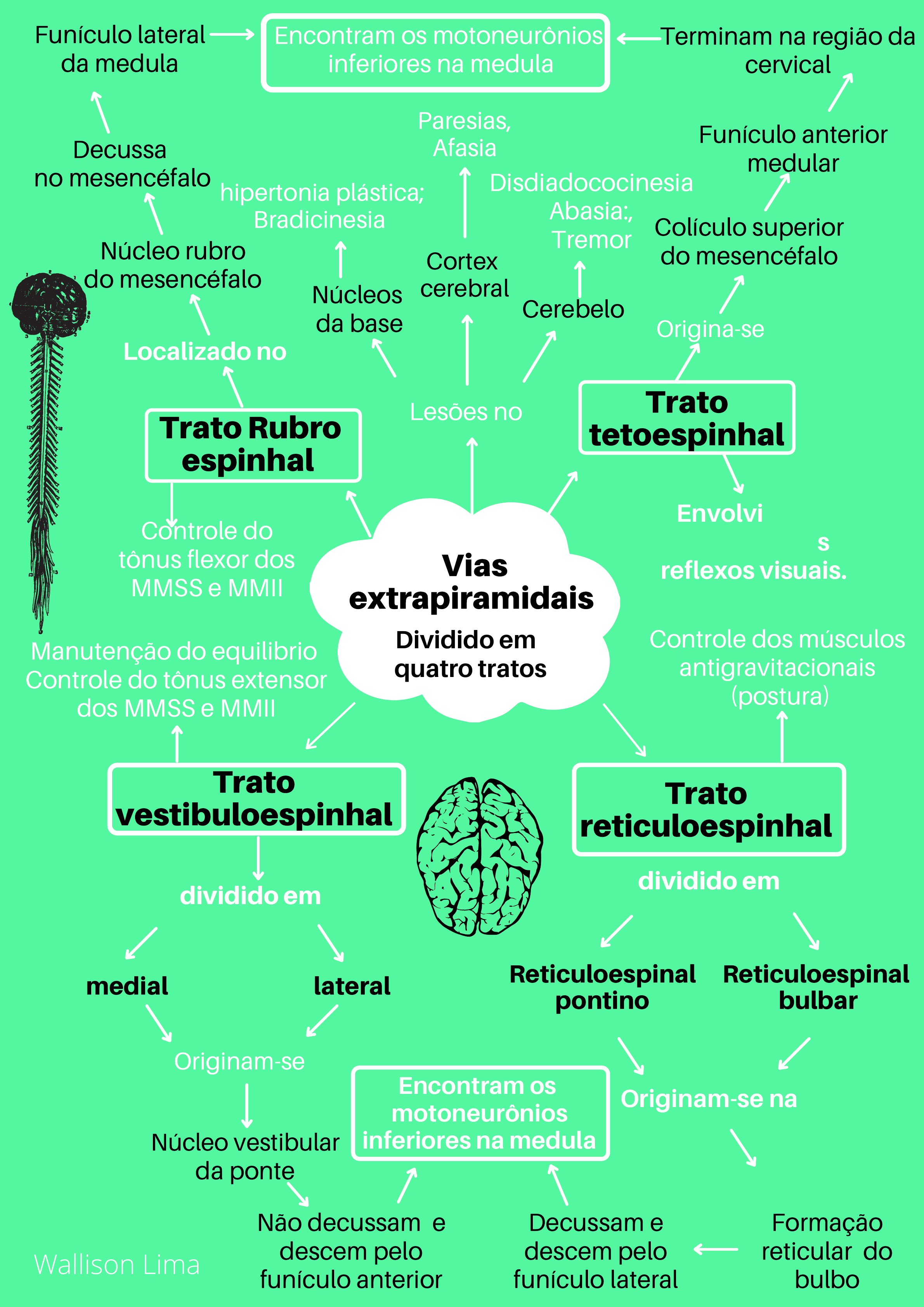 Trato Rubro espinhal Trato tetoespinhal Trato vestibuloespinhal Trato reticuloespinhal Núcleo rubro do mesencéfalo Localizado no Decussa no mesencéfalo Funículo lateral da medula Núcleo vestibular da ponte Formação reticular do bulbo Não decussam e descem pelo funículo anterior Encontram os motoneurônios inferiores na medula Encontram os motoneurônios inferiores na medula Terminam na região da cervical Controle do tônus flexor dos MMSS e MMII Origina-se Manutenção do equilibrio Controle do tônus extensor dos MMSS e MMII Lesões no Cortex cerebral Cerebelo Vias extrapiramidais Dividido em quatro tratos medial dividido em lateral Originam-se Originam-se na Colículo superior do mesencéfalo dividido em Reticuloespinal pontino Reticuloespinal bulbar Decussam e descem pelo funículo lateral Controle dos músculos antigravitacionais (postura) Envolvido em movimentos reflexos visuais. Funículo anterior medular Núcleos da base Disdiadococinesia Abasia:, Tremor hipertonia plástica; Bradicinesia Paresias, Afasia Wallison Lima
