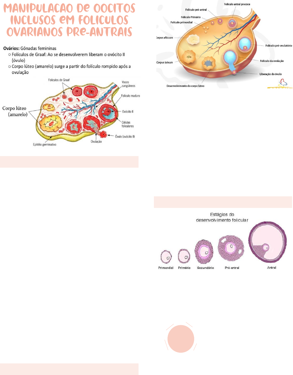 HORMÔNIO: Fatores de crescimento. Função endócrina do ovário: produzir hormônios e fatores de crescimento. Os principais hormônios produzidos são estrógenos e progesterona. Função gametogênica do ovário: é a ovulação. Produzir um oócito maduro por cada ciclo. Ou seja, oócitos prontos para serem fecundados. O ovário possui duas regiões: medular e cortical. Na maioria das espécies a parte medular tem vasos sanguíneos, nervos, que servem para nutrir, sustentar e ajudar a função ovariana. No córtex, que é a parte mais externa, possui os folículos ovarianos e corpos lúteos. Existem duas exceções: a égua e a raposa. Os folículos estão internamente e no córtex estarão os vasos e nervos. FOLÍCULO OVARIANO: Unidade morfológica e funcional formado pelo oócito + as células que o circundam. O oócito é circundado por camadas de células. As células da granulosa (CG) e células da teca. Sua função é manter a sobrevivência, crescimento e maturação. As células atuam jogando substancias que servem para maturar, crescer e proteger o material genético. CATEGORIAS FOLICULARES: O primeiro folículo que formado no ovário é o folículo primordial que possui um oócito circundado por uma única cada de células de formato pavimentoso. O folículo vai se tornar um folículo de transição, que é um oócito circundado por células somáticas pavimentosas e pelo menos 3 no formato cúbico. Os folículos vão crescendo e evoluindo, quando uma camada de células modificarem de formato completamente, até se tornarem cúbicas, ele passa a ser um folículo primário. O folículo secundário é um oócito circundado por, pelo menos duas camadas completas de células cúbicas. A partir do folículo secundário ele possui células da teca, que servem para produzir estrógeno, ou seja: esteredogênese. A grande formação de liquido faz necessario a formação de uma cavidade, chamada cavidade antral. Quando essa cavidade é formada, o folículo passa a ser secundário. Antro Todos folículos antes desse são conhecidos como folículos pré antrais. A MOIFOPA trabalha com óvulos imaturos, ou seja: primordial, transição e secundário. A célula continua a crescer. O antro vai crescendo e empurrando o oócito para um polo dos com forças hidrostáticas. As células que envolvem o oócito são chamadas de corona radiata. Este é o oócito maduro. A maturação em vitro é a colheita de folículos antrais (2 e 3) e inserir substancias para o tornar maduro. As fêmeas nascem com uma quantidade exata de folículos, e eles vão diminuindo a cada ciclo estral. Por isso, a menopausa representa o final do “estoque” de folículos. PRINCIPAL OBJETIVO DA MOIFOPA: recuperar os folículos pré antrais antes que eles entrem em atresia, e destiná-los a sistemas de cultivo que permitam a sobrevivência, crescimento, maturação e utilização dos folículos. ETAPAS DA MOIFOPA: Manipulação de oócitos inclusos em folículos ovarianos pré-antrais. Isolamento mecânicos e enzimáticos Preservação (resfriamento) ISOLAMENTO: Mecânico: se utiliza um cortador de tecidos. O ovário vai ser cortados e processado por filtros para separar os folículos para avaliação microscopiana. Também existe a microdissecção, onde só se pode ser enxergado folículos secundários, porque é o único visível no microscópio. Enzimáticos: colágenase e hialuronidase. São mais rápidos. REFRIGERAÇÃO: É um pré-requisito para outras etapas. Serve para transporte de ovários e tempo para manipulação e evitar a degeneração ovariana. 4C. Primeiro deve lavar os oócitos colocar no meio MEM ou soro fisiológico. CRIOPRESERVAÇÃO DE TECIDO OVARIANO: Conservação de material biológico a temperaturas ultra baixas, geralmente em nitrogênio líquido a -196C, ou em sua fase de vapor a -150C. IMPORTÂNCIA DA CRIOPRESERVAÇÃO NA MEDICINA HUMANA: Mulheres que sofrem de menopausa prematura Tratamentos de câncer degeneram os folículos FOPA (tecidos ovarianos) Transplante Restauração da fertilidade IMPORTÂNCIA DA CRIOPRESERVAÇÃO NA MEDICINA VETERINÁRIA: Preservação de material genético para raças em extinção ou de maior valor genético FOPA tecido ovariano Biotécnicas da reprodução animal (FIV e clonagem) Multiplicação de animais MÉTODOS DE CRIOPRESERVAÇÃO: Vitrificação: congelação muito rápida que impede a formação de gelo intracelular. Congelação muito rápida 2500C Solução amorfa – estado vítreo Pode acontecer rompimento da célula quando for reaquecer Maior viscosidade Menor custo In situ: cultivar ovário inteiro ou parte do ovário e adicionar substancias. Pode ser cultivado os folículos isoladamente em placa. Uma das regiões dele irá achatar, então o ideal é que seja em ágar. A vantagem é que o folículo pode ser acompanhado individualmente.