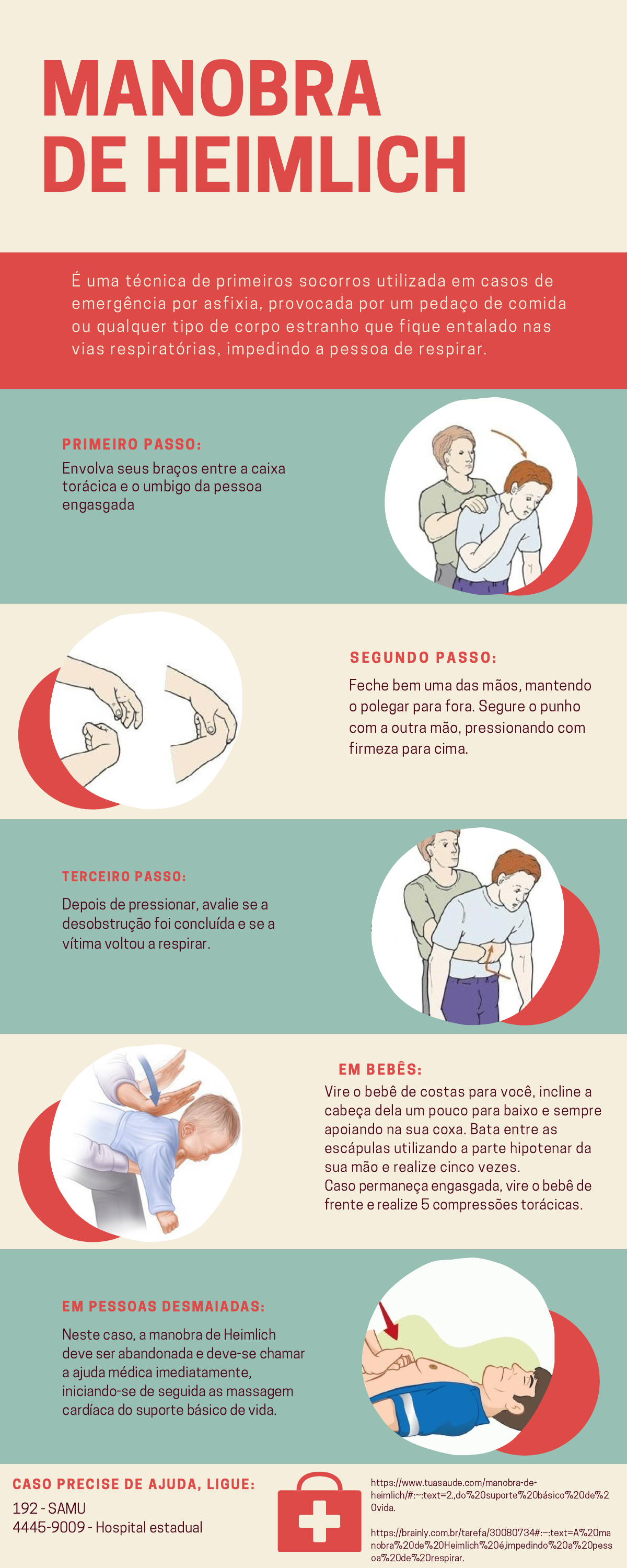 P R I M E I R O P A S S O : E M B E BÊS : S E G U N D O P A S S O : MANOBRA DE HEIMLICH É uma técnica de primeiros socorros uti l izada em casos de emergência por asfixia, provocada por um pedaço de comida ou qualquer tipo de corpo estranho que fique entalado nas vias respiratór ias, impedindo a pessoa de respirar. Envolva seus braços entre a caixa torácica e o umbigo da pessoa engasgada Depois de pressionar, avalie se a desobstrução foi concluída e se a vítima voltou a respirar. Feche bem uma das mãos, mantendo o polegar para fora. Segure o punho com a outra mão, pressionando com firmeza para cima. T E R C E I R O P A S S O : C A S O P R E C I S E D E A J U D A , L I G U E : E M P E S S O A S D E S M A I A D A S : 192 - SAMU 4445-9009 - Hospital estadual Neste caso, a manobra de Heimlich deve ser abandonada e deve-se chamar a ajuda médica imediatamente, iniciando-se de seguida as massagem cardíaca do suporte básico de vida. Vire o bebê de costas para você, incline a cabeça dela um pouco para baixo e sempre apoiando na sua coxa. Bata entre as escápulas utilizando a parte hipotenar da sua mão e realize cinco vezes. Caso permaneça engasgada, vire o bebê de frente e realize 5 compressões torácicas. https://www.tuasaude.com/manobra-de- heimlich/#:~:text=2.,do%20suporte%20básico%20de%2 0vida. https://brainly.com.br/tarefa/30080734#:~:text=A%20ma nobra%20de%20Heimlich%20é,impedindo%20a%20pess oa%20de%20respirar.