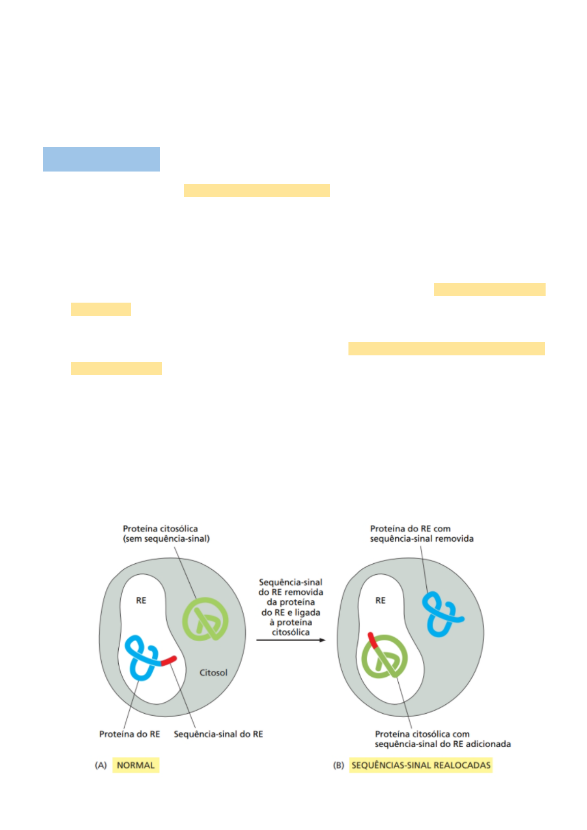 Universidade Nove de Julho - Medicina - Bruna Siqueira de Arruda Dinâmi�� ��lu��� I� DI����ON����TO �� �R��EÍNA� Seq�ên�i��-si���� ❏ Responsáveis por direcionar as proteínas para os compartimentos corretos. O destino de uma proteína no citosol depende do sinal de endereçamento (sequência-sinal.) ❏ Formadas por um segmento contínuo de aminoácidos com 15 a 60 aminoácidos. ❏ Quando a proteína chega ao compartimento correto, a sequência-sinal é removida. ❏ Geralmente, essa sequência está na porção N-terminal da proteína. ❏ Os compartimentos específicos possuem receptores de endereçamento complementar, que irão reconhecer determinada sequência. ❏ Proteínas sem sequências-sinais → permanecem no citosol, como proteínas residentes permanentes. Experimentos foram realizados para chegar a essas conclusões. Uma proteína sem sequência-sinal permanece no citosol. Se nessa proteína for colocada uma sequência-sinal, ela é direcionada para determinado compartimento. 1 Universidade Nove de Julho - Medicina - Bruna Siqueira de Arruda 1. Tra��p���� at���és �e ��r�� �uc����es Nesse transporte, as proteínas se movem transpassando as membranas nucleares externas e internas pelos poros nucleares Vi� d� �i��l��ação ❏ As proteínas do citosol endereçadas ao núcleo possuem o chamado sinal de localização nuclear (uma ou duas sequências curtas que possuem lisinas ou argininas carregadas positivamente), que funcionam como sequência sinal. É essa sequência será reconhecida pelo receptor de importação nuclear - encontrados próximos dos poros nucleares, no citosol. ❏ Os receptores de importação nuclear auxiliam no direcionamento da proteína recém-sintetizada para o poro nuclear, através de interações com fibrilas e abrindo passagem pela malha. ❏ A proteína acoplada ao receptor de importação passa pelo poro nuclear e chega ao núcleo. Ao chegar ao núcleo, o receptor de importação se desprende 2 Universidade Nove de Julho - Medicina - Bruna Siqueira de Arruda da proteína (volta para o citosol e é reutilizado), tornando-a funcional no núcleo. ❏ A importação de proteínas do citosol para o núcleo requer energia e, nesse caso, a hidrólise de GTP é a fonte dessa energia. A Ran (GTPase) é a mediadora desse fornecimento de energia. 3 Universidade Nove de Julho - Medicina - Bruna Siqueira de Arruda 1. A proteína com determinada sequência-sinal se liga ao receptor de importação; 2. Proteína ligada ao receptor de importação entra no núcleo; 3. A Ran-GTP se liga ao receptor de importação (em um sítio de ligação diferente do que a proteína está ligada) e libera a proteína no núcleo; 4. Ran-GTP e receptor de importação são direcionado de volta para o citosol; 5. Quando a Ran-GTP ligada ao receptor chega no citosol, ocorre a *hidrólise do GTP (GTP → GDP + energia) e a Ran-GDP se solta do receptor. Isso permite que uma nova proteína que deve ser importada para o núcleo se ligue ao receptor de importação. ** A hidrólise libera energia para que a Ran-GTP se desligue do receptor. 4 Universidade Nove de Julho - Medicina - Bruna Siqueira de Arruda 2. Tra��p���� at���és �e ��m���na� As proteínas que se movem do citosol para o retículo endoplasmático, mitocôndrias ou cloroplastos são transportadas pelas membranas das organelas por translocadores proteicos localizados nas membranas. Mit��ôn��i�s 1. A sequência-sinal (na região N-terminal) da proteína é reconhecida por um complexo TOM (translocador da membrana externa). 2. O complexo TOM e a proteína sofrem uma translocação, difundindo-se lateralmente na membrana, até encontrar o complexo TIM (translocador da membrana interna). Obs.: A proteína é desnaturada à medida em que é transportada. 3. Quando o complexo TOM e o complexo TIM se encontram, a proteína é internalizada. 4. Dentro da mitocôndria, a sequência-sinal é clivada por uma peptidase sinal, tornando a proteína funcional. 5 Universidade Nove de Julho - Medicina - Bruna Siqueira de Arruda Per����so��� ❏ São organelas oxidativas, que utilizam o oxigênio molecular e o peróxido de hidrogênio (H2O2 → H2O + O2) para realizar oxidações. ❏ Eliminam substâncias tóxicas na célula, em uma reação metabolizada pela enzima catalase. ❏ Sequência-sinal → -Ser-Lys-Leu-COO- A proteína se liga a uma peroxina, como a PEX5 (receptor), que interage com outras proteínas da superfície do peroxissomo. Essa interação abre caminho para a internalização da proteína no peroxissomo. Se uma dessas proteínas falhar, há problemas com esse transporte. Por exemplo, temos a Síndrome de Zellweger, causada por uma mutação que bloqueia a importação de proteínas pelos peroxissomos. Indivíduos com Síndrome de Zellweger nascem com anormalidades graves no encéfalo, no fígado e nos rins. A sobrevida é muito baixa e a maioria não sobrevive por mais de 6 meses de idade. 6 Universidade Nove de Julho - Medicina - Bruna Siqueira de Arruda Retícu�� ��do���s�áti�� (RE) ❏ As proteínas hidrossolúveis são completamente translocadas pela membrana do RE e liberadas no lúmen do RE. Além disso, as futuras proteínas transmembrânicas são translocadas apenas em parte pela membrana do RE e ficam presas à ela. ❏ Se uma proteína possui uma sequência-sinal de RE, o ciclo do ribossomo se liga à membrana do retículo endoplasmático. 7 Universidade Nove de Julho - Medicina - Bruna Siqueira de Arruda 1. O ribossomo direciona a proteína (que possui a sequência-sinal para o RE) até as proximidade do RE; 2. A SRP (Partícula de Reconhecimento de Sinal) reconhece a sequência-sinal e se liga ao receptor de SRP que está na membrana do RE; 3. Após esse reconhecimento, a proteína começa a ser internalizada pelo tra