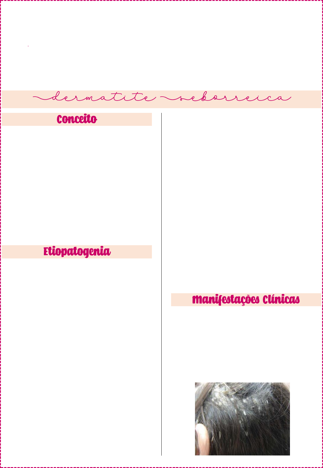 Lesões Eritematoescamosas Dermatite seborreica e Psoríase o Dermatite crônica; o Ocorre em regiões cutâneas ricas em glândulas sebáceas; o Eventual participação do fungo Malassezia spp; o Ocorre em, pelo menos, 5% da população geral; o Alta incidência nos portadores de infecções pelo HIV. o Causa ainda desconhecida; o Alterações na dinâmica epidérmica: ↑ de mitoses e do trânsito transepidérmico (presença de células nucleadas na camada córnea); o Há relação com as glândulas sebáceas, devido à topografia das lesões e suas relações com as variações funcionais das glândulas sebáceas ao longo da vida. # As glândulas sebáceas são estimuladas por hormônios androgênicos: nascimento (androgênios maternos DS no lactente estimulo androgênico cessa após alguns meses DS desaparece) e pós-puberdade (18 aos 40 anos, melhorando gradualmente). o Papel do fungo Malassezia spp. ainda não é bem definido: o Alguns autores argumentam que o aumento do número de Malassezia spp. nas lesões seja secundário ao aumento dos nutrientes lipídicos nas escamas; o A maioria acredita em um papel etiológico preponderante. # Evidências: antifúngicos sistêmicos melhoram a DS, reduz fungo melhora DS, colonização abundante da pele por Malassezia lesões semelhantes à DS, suscetibilidade maior a DS nos portadores de HIV (suscetíveis a infecções fúngicas). o Lesões eritematodescamativas, recobertas por escamas de aspecto gorduroso, que se distribuem pelas áreas seborreicas. Couro cabeludo o Pitiríase capitis (caspa) e prurido. Região retroauricular e ouvido externo o Eritema, descamação e fissuras. Face o Parte interna dos supercílios, glabela, sulco nasolabial, asas do nariz e região paranasal. Tronco (regiões interescapular e pré- estermal) o Lesões petaloides. Regiões flexurais (axilares, anogenitais e inframamárias) e região umbilical o Infecção secundária por cândida e bactérias é frequente. Agravadas por: infecções por HIV, tensão emocional, quadros neurológicos (poliomielite, lesões do trigêmeo, epilepsia, paralisia facial), doença de Parkinson, Síndrome de Down, alcoolismo, alimentos condimentados, diabetes, obesidade. o Inicia-se entre a 1 ª e a 2ª semana de vida, desaparecendo em semanas ou meses; o Compromete a área das fraldas, face e couro cabeludo (crosta láctea), com lesões eritematodescamativas não pruriginosas, sem comprometimento do estado geral, podendo haver disseminação para outras áreas seborreicas. o Clínico; o Descartar diagnósticos diferenciais: psoríase, pitiríase rósea, dermatite atópica, candidose e dermatofitose, dermatite infectada, entre outros. o Considerar a possibilidade de infecção pelo HIV nos casos mais intensos e abruptos ou não responsivos ao tratamento. o É importante o esclarecimento quanto à natureza crônica e recorrente da doença não deve-se falar em cura, e sim em controle do processo; o Orientação básica: no início, usar diariamente o tratamento proposto e, depois, espaçar à medida que o paciente apresentar melhora. Couro Cabeludo o Xampus à base de LCD (liquor carbonis detergens) de 5 a 8% associado ou não a: piritionato de zinco (1 a 2,5%), sulfeto de selênio (1 a 2,5%), coaltar (2 a 3%), cetoconazol (1 a 2%), octopiroxolamina (1 %), enxofre e ácido salicílico; o Casos mais resistentes: creme ou pomada de corticoide; o Se houver infecção secundária, antibióticos sistêmicos ou tópicos. Face o Creme de corticoide não fluorada (hidrocortisona 1%), alternado com creme de cetoconazol 2%. o Sabonetes com enxofre e ácido salicílico. o Aplicação de ultravioleta B (casos resistentes). o Imunomoduladores: tacrolimo pomada a 0,1 % e pimecrolimo creme, por sua ação anti- inflamatória. Tronco o Pomadas de corticoide; o Sabonete de enxofre e ácido salicílico (controle recidiva). Áreas intertriginosas o Cremes ou pomadas de corticoide com antibacteriano e antifúngico; o Limpeza com água boricada. o Doença imunoinflamatória, cutâneo articular, crônica e recorrente que se caracteriza por hiperplasia epidérmica, ciclo evolutivo acelerado dos queratinócitos e ativação imune inapropriada; o Pode ocorrer em qualquer faixa etária, 2 picos de incidência: entre 20 e 30 anos de idade e após os 50 anos; o Ambos os sexos são acometidos igualmente. o Causa desconhecida, o Base hereditária, provavelmente multifatorial, o que significa dizer que é de herança poligênica; o Requer fatores ambientais para sua expressão: não ocorrência de 100% entre os monozigóticos indica que fatores ambientais contribuem na etiologia. Fatores ambientais o Trauma cutâneo de diversas naturezas: físico, químico, elétrico, cirúrgico, inflamatório; o Infecções: estreptococo β-hemolítico (psoríase aguda e em gotas), indivíduos com HIV (exacerbação da psoríase); o Medicamentos (lítio, β-bloqueadores, antimaláricos, AINEs): agravam a psoríase; o Estresse emocional; o Clima frio: devido menor radiação solar; o Outros fatores: distúrbios endócrinos e metabólicos, ingestão aumentada de álcool. Psoríase em placas (Psoríase Vulgar) o Forma mais comum; o Placas eritemaescamosas, com escamas secas, branco-prateadas, aderentes e estratificadas; o Lesões bem delimitadas, de tamanhos variados; o Halo ou anel de Woronoff: bastante característico, porém raramente observado; o Afeta de forma simétrica a face de extensão dos membros, particularmente joelhos e cotovelos, couro cabeludo e região dorsal, podendo acometer qualquer outra área da pele; o Pode acometer dobras flexurais (psoríase invertida): descamação menos evidente pela sudorese e maceração locais; o Pode acometer áreas seborreicas (seboríase); o Pode acometer semimucosas (queilite, glossite, língua fissurada e língua geográfica, blefarite, conjuntivite e ceratite); o Unhas: depressões puntiformes da lâmina ungueal ou unha em dedal psoríase ungueal (excluir onicomicose pelo micológ