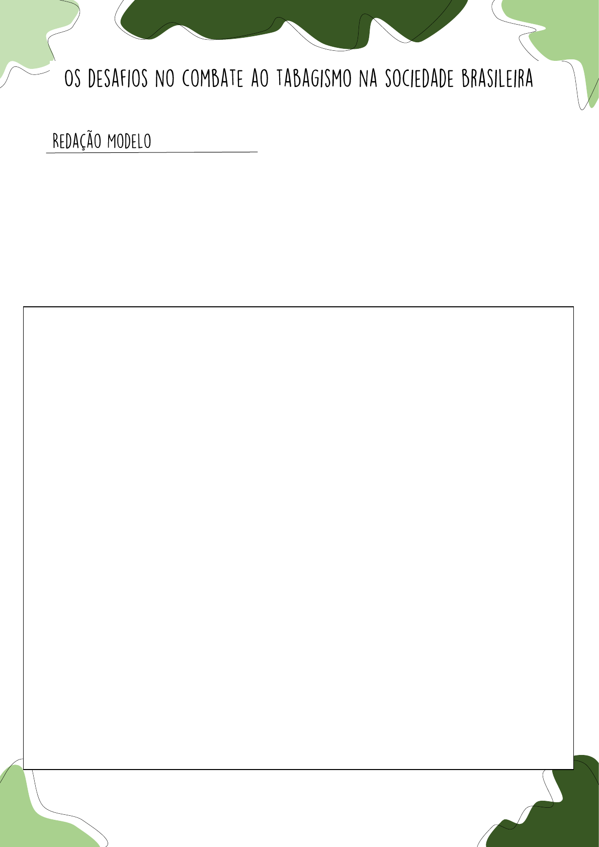 Olá! Meu nome é Pedro Moura (@pedroh.sa) e tirei 960 no ENEM 2020 Estou disponibilizando minha redação. Tenho outras redações disponíveis no meu perfil do “Passei Direto”, dá uma olhada! Tema: Os desafios no combate ao tabagismo na sociedade brasileira Na série “Euphoria”, a jovem protagonista Rue é dependente de substâncias químicas e, devido a isso, tem sua vida afetada em âmbitos que vão desde a sua saúde, até seus relacionamentos. De forma análoga a ficção, o vício ao tabaco também se mostra prejudicial ao homem. Nesse contexto, evidencia-se a procura por prazer, além da inércia governamental, como fatores que ampliam essa problemática. Dessa forma, rever a situação na qual a dependência está inserida é essencial para avaliar suas consequências na atualidade. Em primeira análise, é valido destacar que a busca por prazeres momentâneos é a principal causa para o estabelecimento do tabagismo. De acordo com a filosofia Hedonista, a felicidade dever reger a tomada de decisões humanas. Acerca disso, observa-se que as obras midiáticas utilizam essa filosofia para manipular o indivíduo, atribuindo ao cigarro os fatores de status e satisfação instantânea. Nessa perspectiva, essa cultura que prestigia o individuo fumante caracteriza-se como um agravante na questão do tabagismo, já que estimula a dependência química e amplia as consequências trazidas por ela, como por exemplo o câncer pulmonar. Assim, o pensamento imediatista aliado à influência midiática não só fortalece a questão do vício ao tabaco, mas também os problemas de saúde causados por ele. Além disso, a inércia governamental corrobora na intensificação dessa problemática. Segundo o Ministério da Saúde, 8,5% dos jovens são fumantes no Brasil. No que tange a esse assunto, analisa-se que embora haja uma lei que impeça a venda desse produto para menores, não há uma fiscalização eficaz que concretize a norma jurídica. Nessa visão, evidencia-se o desrespeito a Constituição Federal, haja vista que a saúde é um direito que deve ser assegurado pelo Estado. Em virtude disso, é possível observar que tal negligencia com a cidadania facilita o aumento das taxas de fumantes e, por consequência, no número de doenças evitáveis que, a longo prazo, afetará os setores da saúde pública. Dessa maneira, fica claro que o poder estatal não está sendo efetivo no combate ao vício. Em face do exposto, medidas são indispensáveis para solucionar os entraves relacionados ao tabagismo. Portanto, cabe ao Ministério da Saúde, por meio de uma parceria com o Ministério da Educação, promover palestras nas escolas de ensino médio que visem alertar os perigos que a dependência química pode causar. À luz disso, é importante que tais palestras sejam ministradas por agentes da saúde, devido ao conhecimento inerente a tal área. Dessa forma, tendo os jovens como publico alvo, a taxa de indivíduos fumantes seria amenizada de acordo com o tempo e, assim, as cenas retratadas na série “Euphoria” não seriam presentes, também, na realidade.