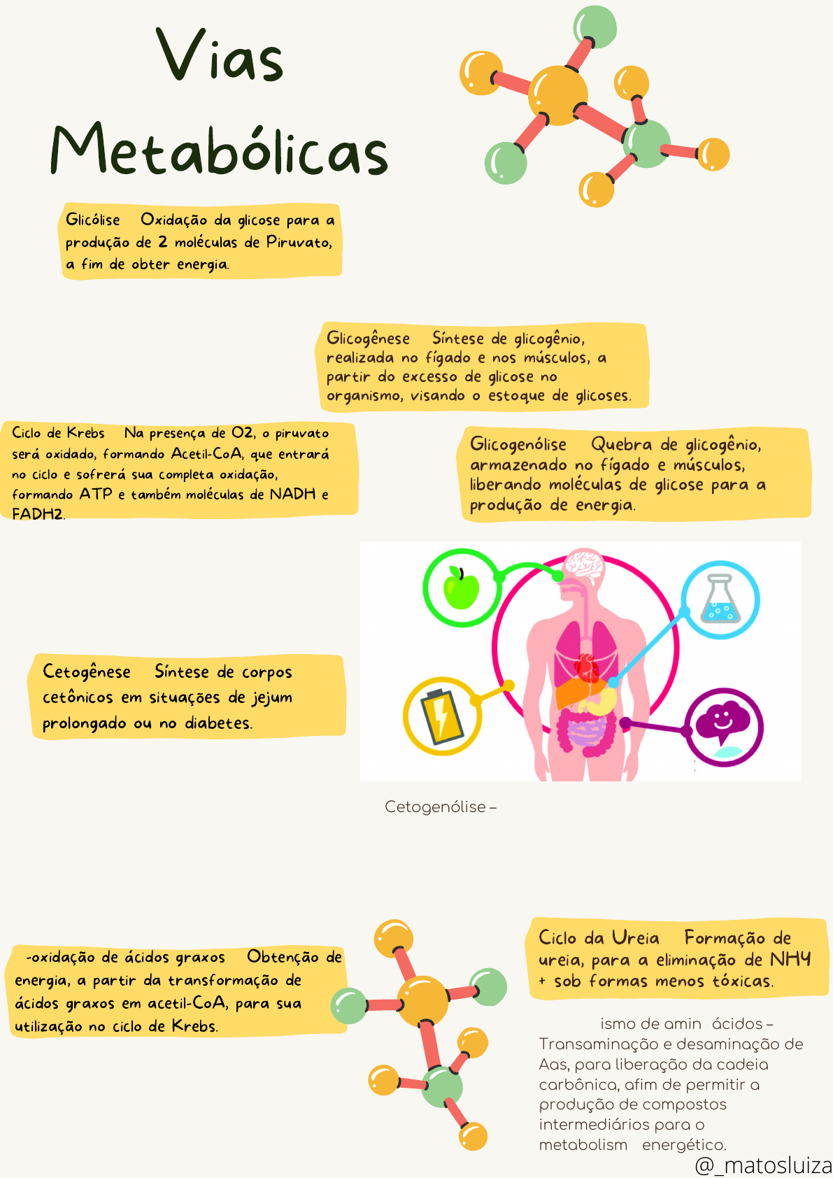 Gliconeogênese – Síntese de glicose a partir de compostos que não são carboidratos (aglicanos), em momentos de baixa oferta de glicose para o organismo, afim de possibilitar a produção de energia. Via das Pentoses – Desvio da via glicolítica, importante para a síntese de pentoses para produção de nucleotídeos e também é responsável pela produção de NADPH, um importante composto que participa de reações de anabolismo e auxilia no combate ao estresse oxidativo. Cadeia Respiratória – Transporte de elétrons carregados por NADH e FADH2. Nesta etapa ocorrerá a grande produção de energia para a célula. Lipogênese – Via responsável pela síntese de ácidos graxos que serão armazenados no fígado e, principalmente no tecido adiposo, servindo com uma reserva energética. Vias Metabólicas Cetogenólise – Degradação de corpos cetônicos, para formação de Acetil CoA, que irá suprir as necessidades energéticas do sistema nervoso e musculo, em situações de jejum prolongado ou diabetes. Fermentação Láctica – Ocorre a partir do Piruvato, formado na glicólise, na ausência de O2, resultando em ácido láctico. Glicogênese – Síntese de glicogênio, realizada no fígado e nos músculos, a partir do excesso de glicose no organismo, visando o estoque de glicoses. Ciclo de Krebs – Na presença de O2, o piruvato será oxidado, formando Acetil-CoA, que entrará no ciclo e sofrerá sua completa oxidação, formando ATP e também moléculas de NADH e FADH2. Ciclo da Ureia – Formação de ureia, para a eliminação de NH4 + sob formas menos tóxicas. Glicólise – Oxidação da glicose para a produção de 2 moléculas de Piruvato, a fim de obter energia. Cetogênese – Síntese de corpos cetônicos em situações de jejum prolongado ou no diabetes. β-oxidação de ácidos graxos – Obtenção de energia, a partir da transformação de ácidos graxos em acetil-CoA, para sua utilização no ciclo de Krebs. Glicogenólise – Quebra de glicogênio, armazenado no fígado e músculos, liberando moléculas de glicose para a produção de energia. Catabolismo de aminoácidos – Transaminação e desaminação de Aas, para liberação da cadeia carbônica, afim de permitir a produção de compostos intermediários para o metabolismo energético. @_matosluiza