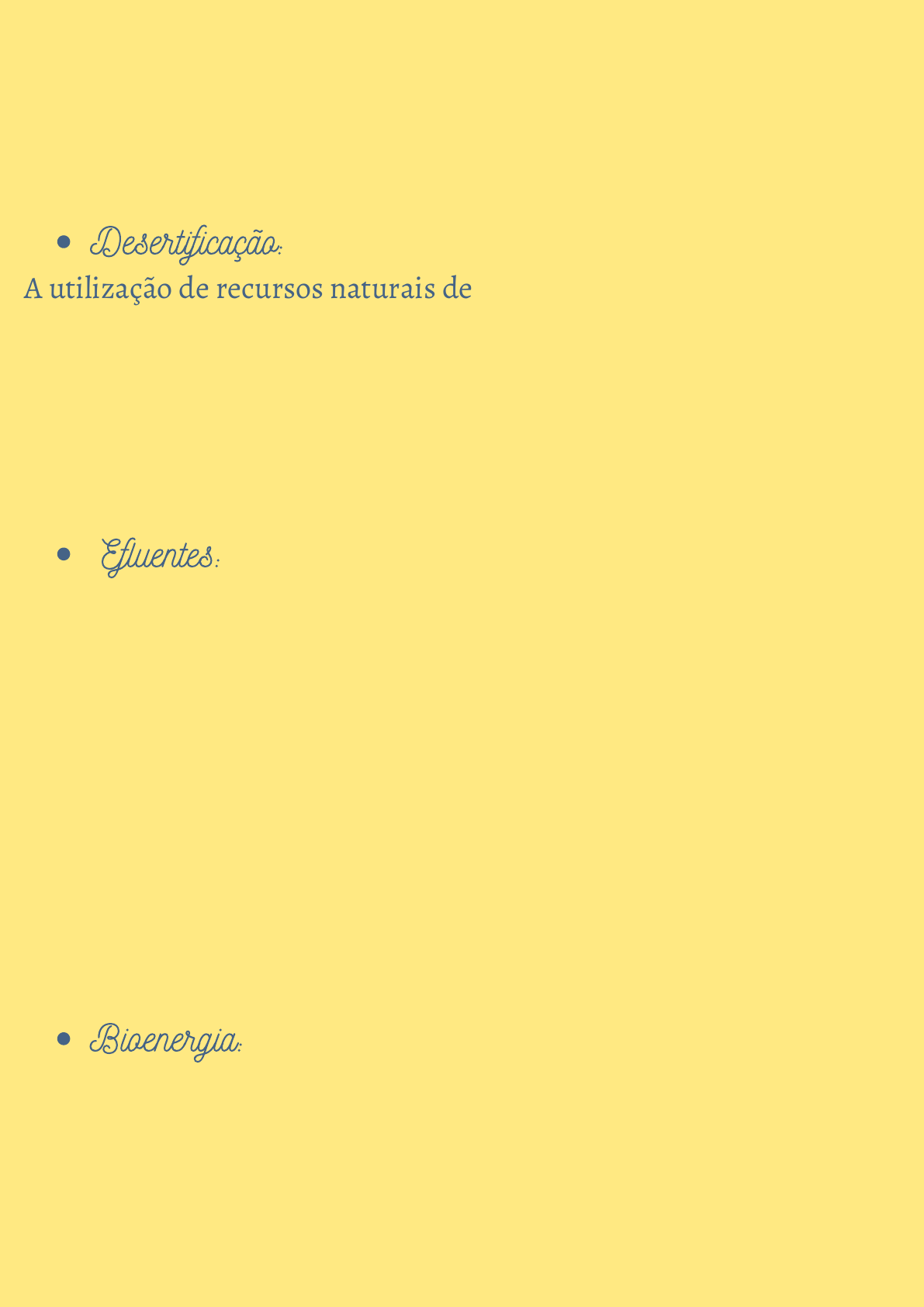 Responsabilidade Socioambiental Desertificação: Efluentes: Bioenergia: A utilização de recursos naturais de forma inapropriada, somada às mudanças climáticas e aspectos físicos naturais, ocasiona uma degradação de tal forma que torna impossível a regeneração dos locais explorados, fazendo surgir áreas áridas e semiáridas. No Brasil, as áreas susceptíveis à desertificação são encontradas na Região Nordeste. A água é um bem precioso, utilizado corriqueiramente em nossas atividades do cotidiano. O processo de “chegada, recebimento” da água é denominado afluente; e a “saída”, denominada efluente. Devido à mistura com outros compostos, orgânicos e inorgânicos, como gorduras, pesticidas, metais e afins, os efluentes tornaram-se uma temática de grande discussão, pois o destino, em sua maioria, são os rios. Ao serem lançados em aquíferos, um dos principais problemas é a carga microbiana existente no material, que ocasiona sequestro de oxigênio e impede o desenvolvimento e manutenção da vida aquática. A bioenergia é compreendida como aquela que acarreta menores níveis de impactos ambientais, composta por fontes sustentáveis. Matérias- primas como biomassa, sol, vento, são consideradas formas de energia limpa. A busca por fontes alternativas de energia tornou-se crescente, a fim de evitar um colapso energético futuro.