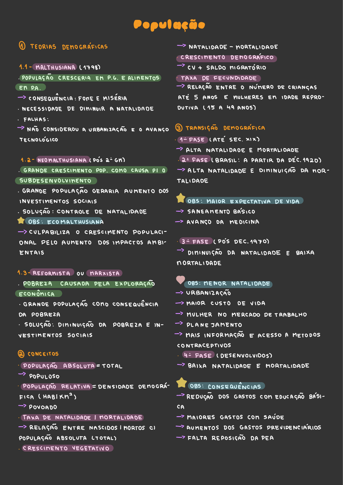 PERDI Guarapuava! badoo.GEEOEBF.O.GE s TEORIAS DEMOGRÁFICAS NATALIDADE - MORTALIDADE CRESCIMENTO DEMOGRÁFICO . - MALTHUSIANA ( 1798) CV + SALDO MIGRATÓRIO • POPULAÇÃO CRESCERIA EM P.co . E ALIMENTOS TAXA DE FECUNDIDADE EM PA . RELAÇÃO ENTRE O NÚMERO DE CRIANÇAS CONSEQUÊNCIA : FOME E MISÉRIA ATÉ 5 ANOS E MULHERES EM IDADE REPRO - - NECESSIDADE DE DIMINUIR A NATALIDADE DUTIVA ( 15 A 49 ANOS) - FALHAS : NÃO CONSIDEROU A URBANIZAÇÃO E O AVANÇO 3 TRANSIÇÃO DEMOGRÁFICA TECNOLÓGICO . 1° FASE ( ATÉ SEC . XIX) ALTA NATALIDADE E MORTALIDADE • 2- NEOMALTHUSIANA ( PÓS 2° GM) 2° FASE ( BRASIL : A PARTIR DA DÉC. 1920) . GRANDE CRESCIMENTO POP . COMO CAUSA PI O ALTA NATALIDADE E DIMINUIÇAÕ DA MOR- SUBDESENVOLVIMENTO TALIDADE - GRANDE POPULAÇÃO GERARIA AUMENTO DOS INVESTIMENTOS SOCIAIS OBS : MAIOR EXPECTATIVA DE VIDA . SOLUÇÃO : CONTROLE DE NATALIDADE SANEAMENTO BÁSICO OBS : ECO MALTHUSIANA AVANÇO DA MEDICINA CULPABILIZA O CRESCIMENTO POPULACIONALPELO AUMENTO DOS IMPACTOS AMBI- 3° FASE ( PÓS DEC. 1970) ENTAIS DIMINUIÇÃO DA NATALIDADE E BAIXA MORTALIDADE - 3- REFORMISTA OU MARXISTA - POBREZA CAUSADA PELA EXPLORAÇÃO OBS : MENOR NATALIDADE ECONÔMICA URBANIZAÇÃO . GRANDE POPULAÇÃO COMO CONSEQUÊNCIA MAIOR CUSTO DE VIDA DA POBREZA MULHER NO MERCADO DE TRABALHO - SOLUÇÃO : DIMINUIÇÃO DA POBREZA E IN - PLANEJAMENTO VESTIMENTOS SOCIAIS MAIS INFORMAÇÃO E ACESSO A METODOS CONTRACEPTIVOS 2 CONCEITOS 4° FASE ( DESENVOLVIDOS) - POPULAÇÃO ABSOLUTA = TOTAL BAIXA NATALIDADE E MORTALIDADE POPULOSO POPULAÇÃO RELATIVA = DENSIDADE DEMOGRÁ- OBS : CONSEQUÊNCIAS FICA ( HABIKM > ) REDUÇÃO DOS GASTOS COM EDUCAÇÃO BÁSI - POVOADO CA TAXA DE NATALIDADE / MORTALIDADE MAIORES GASTOS COM SAÚDE RELAÇÃO ENTRE NASCIDOS / MORTOS CI AUMENTOS DOS GASTOS PREVIDENCIÁRIOS POPULAÇÃO ABSOLUTA (TOTAL) FALTA REPOSIÇÃO DA PEA CRESCIMENTO VEGETATIVO PIRÂMIDE ETÁRIA - DIVIDIDA EM : BASE ( JOVENS) CORPO ( PEA) TOPO ( IDOSOS) QUANTO MAIOR O DESENVOLVIMENTO , MENOR A NATALIDADE E MAIOR A EXPECTATIVA DE VIDA 5 PEA - ATIVIDADES PRODUTIVAS PRIMÁRIA ( AGROPECUÁRIA) SECUNDÁRIA ( INDÚSTRIA) TERCIÁRIA ( COMÉRCIO E SERVIÇOS) QUATERNÁRIA ( PESQUISA CIENTÍFICA) A MECANIZAÇÃO DO CAMPO E ROBOTIZAÇÃO DA INDUSTRIA CONTRIBUÍRAM PI O CRESCIMENTODO SETOR TERCIÁRIO TERCIARIZAÇAÕ OBS : O SETOR TERCIÁRIO NO BRASIL É SATURADO COM NÚMERO DE TRABALHADORES SUPERIOR AO DE VAGAS CONSEQUÊNCIA : AUMENTO DA INFORMALIDADECOM TRABALHADORES SEM DIREITOS E DIMINUIÇÃODA ARRECADAÇÃO DO ESTADO G IDH - ÍNDICE DE QUALIDADE DE VIDA DO PAÍS • 3 INDICADORES : ESCOLARIDADE EXPECTATIVA DE VIDA RENDA PER CAPITA OBS : ÍNDICE DE OINI ME DE DESIGUALDADE