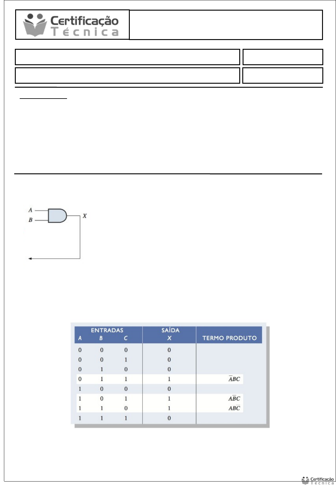 Sistemas Digitais - CT Data: / / 201_. Aluno (a): Avaliação Prática NOTA: INSTRUÇÕES: · Esta Avaliação contém 10 (dez) questões, totalizando 10 (dez) pontos; · Baixe o arquivo disponível com a Atividade de Pesquisa; · Você deve preencher dos dados no Cabeçalho para sua identificação: · Nome / Data de entrega. · As respostas devem ser digitadas abaixo de cada pergunta; · Ao terminar grave o arquivo com o nome Atividade Prática; · Envio o arquivo pelo sistema no local indicado; · Em caso de dúvidas consulte o seu Tutor. 1 - Se duas formas de onda, A e B, são aplicadas nas entradas de uma porta AND conforme mostrado na figura abaixo, qual é a forma de onda de saída resultante? 2 - Projete um circuito lógico para implementar a operação especificada na tabela verdade mostrada na imagem abaixo: 3 - Determine a forma de onda fout para o circuito dado na imagem abaixo quando uma onda quadrada de 8 kHz for aplicada na entrada de clock do flip-flop A. 4 - A Figura abaixo mostra um temporizador 555 configurado no modo (oscilador). Determine a frequência de saída e o ciclo de trabalho. 5 - São realizadas medidas de frequência no contador truncado mostrado na imagem abaixo conforme indicado. Determine se o contador está funcionando corretamente e, em caso negativo, determine o defeito. 6 - Mostre os estados do registrador de 5 bits mostrado na imagem abaixo para as formas de onda de entrada de dados especificada e do clock. Considere que o registrador esteja inicialmente zerado (todos os bits em nível 0). 7 - O conteúdo hexadecimal do registrador CS e do IP são mostrados na imagem abaixo. Determine o endereço físico da próxima instrução na memória. 8 - Um ALM em um FPGA Stratix II é configurado no modo LUT estendida, como mostra a imagem abaixo. Para as saídas da LUT específica mostrada, determine a saída de soma de produtos final. 9 - Determine as saídas A = B, A > B e A < B para os números de entradas mostrados no comparador visto na imagem abaixo. 10 - Determine as margens de ruído dos níveis ALTO e BAIXO para CMOS e TTL usando as informações dadas nas imagens abaixo. Acionamentos Eletrônicos - ELT Eletrônica Digital - ELE/ELT