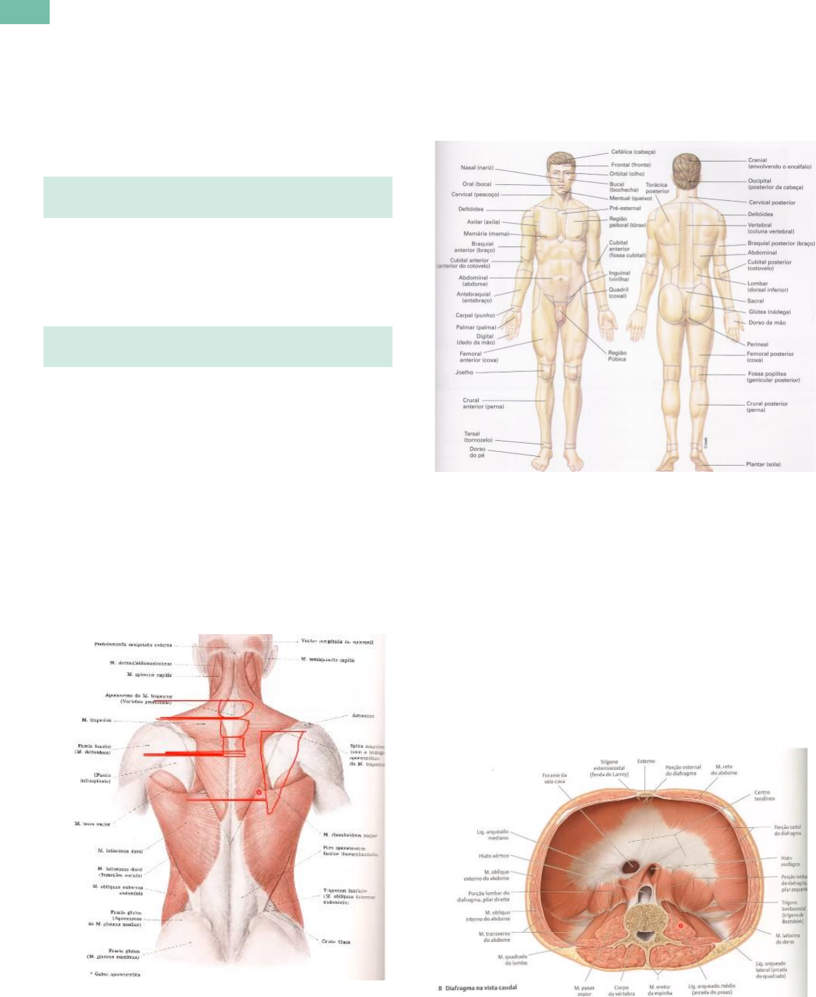 1 Lívia Santos TXVIA Anatomia Topográfica Prof° Marcelo Callil 06/08/2021 Dorso → INTRODUÇÃO • Dorso fornece proteção da medula espinhal e outras estruturas, distribuição dos nervos espinais, locomoção (posicionamento correto); → DIVISÃO DO DORSO • o dorso é divido em 3 partes: cervical posterior (nuca), posterior do tórax e região lombar; • além disso essas regiões se dividem em sub- regiões importante para descrição semiológica: - região posterior do tórax: dividida em região supraescular, infraescapular, subescapular escapular e interescápulo vertebral direitas e esquerdas • divisão das camadas musculares: divididos em pós vertebral (músculos atras da coluna vertebral) e pré-vertebral (antes da coluna): - pré- vertebral: repare que abaixo está a cavidade abdominal (sem órgão, com órgãos chama cavidade peritoneal). A musculatura pré-vertebral é formada pelo músculos psoas maior e quadrado do lombo de cada lado, bem como dos músculos da parede abdominal; - pós-vertebrais: divididos em superficiais, profundos e paravertebrais (ao lado da coluna vertebral). 2 Lívia Santos TXVIA Anatomia Topográfica Prof° Marcelo Callil 06/08/2021 → camada superficial: trapézio (função= elevar a escápula/ombro, retração e rotação da escápula; origem =na protuberância occipital externa e processos espinhosos das vértebras cervicais e torácicas; inserção= acrômio e espinha da escápula de cada lado; inervação= nervo acessório XI); m. latíssimo do dorso (função= potente extensor e adutor do membro superior, usado no remo, natação “carrega o peso do corpo sobre as mãos”, ajuda também na respiração como músculo acessório da respiração, inervação: nervo toracodorsal) → camada profunda: m. esplênio da cabeça (função= rotação usa um dos esplênio ipsilateral e extensão da cabeça com os dois esplênios; inervação= ramos dorsais dos nervos cervicais; m. levantador da escápula (elevar o ombro e retrair e fixar a escápula; origem= axis, c3 e c4; inserção= ângulo superior da escápula; inervação= nervo dorsal da escápula) m. romboide maior e menor ( origem nos processos espinhosos e inserção na margem medial da escápula; função= retração e fixação da escápula; inervação= nervo dorsal da escápula) m. redondo menor (origem= tubérculo maior do úmero; inserção= borda lateral da escápula ou região infraescapular; função= rotação lateral do braço e mantem a cabeça 3 Lívia Santos TXVIA Anatomia Topográfica Prof° Marcelo Callil 06/08/2021 do úmero em posição para abdução do membro superior; inervação= nervo axilar sinal de lesão do plexo braquial é perca de rotação do braçi) M. redondo maior (origem no úmero e inserção na escápula; função= mantém a estática do braço; inervação= n. subescapular) M. supraespinhal (função= abdução do braço até 30°, inervação= nervo supraescapular) m. infraespinal (função= rotação lateral do braço junto do redondo menor; inervação= nervo supraescapular) m. subescapular (origem=tubérculo menor do úmero; inserção= borda medial da escápula; função= potente rotação medial do braço com auxílio do m. redondo maior que mantem a cabeça do úmero em posição; inervação= nervos subescapulares inferior e superior) → ao retirar os romboides e latíssimo m. serrátil posterior superior e m. serrátil posterior inferior (função= retináculo – mantem sustentação e posicionamento de estruturas, nesse caso ossos, fáscias músculos; inervação do superior = nervos cervicais de C6 até T4 até T5 torácicos diretamente da medula; inervação inferior= últimos nervos torácicos T11 T12 até nervos lombares de L2 a L3) 4 Lívia Santos TXVIA Anatomia Topográfica Prof° Marcelo Callil 06/08/2021 → Músculos paravertebrais (ainda mais profundo que os anteriores) perceba os músculos intercostais ao lado; → DIVISÃO DO DORSO m. intercostais externos (origem= dos processos transversos até as cartilagens costais, quando acaba a parte óssea acaba a musculatura do externo e o espaço entre as cartilagens costais é a membrana intercostal interna; distribuição: superinferiormente da parte medial para a parte lateral, anteriormento distribuição superoinferior de lateral para medial m. intercostais internos ao retirar a membrana intercostal interna se encontra os músculos intercostais internos; distribuição= da parte medial para a parte lateral 5 Lívia Santos TXVIA Anatomia Topográfica Prof° Marcelo Callil 06/08/2021 por dentro da cavidade torácica vê-se que eles não chegam até os processos transversos Função= intercostal externo inspiração (expansão da caixa torácica) e internos fazem a expiração com uma exceção: intercostais internos localizados entre o 4° e 5° EIC anterior atual na inspiração. Inervação= nervos intercostais da medula; m. transverso do tórax: das cartilagens costais até as costelas m. eretor da espinha ilieocostal, longuíssimo e espinal: funções= extensão, flexão e rotação da coluna; inervação= ramos dorsais cervicais torácicos e lombares; 6 Lívia Santos TXVIA Anatomia Topográfica Prof° Marcelo Callil 06/08/2021 → TRÍGONOS DO DORSO • trígono da ausculta pulmonar= localizado na região interescápulo vertebral de cada lado; - limite medial= borda lateral do trapézio; - limite lateral= borda medial da escápula; -limite inferior= borda superior do músculo latíssimo do dorso; -assoalho do trígono= músculo romboide maior e uma parte da fáscia toracolombar recobre o trígono • trígono lombar superior (trígono de Grynfelt) - limite superior: abaixo da 12° costela - lateral: m. oblíquo interno - medial: m. quadrado do lombo - soalho: fáscia toracolombar (camada profunda) - teto= m´. latíssimo do dorso • trígono lombar inferior (trígono de Petit) - limite inferior: crista ilíaca - lateral: m. oblíquo externo - medial: m. latíssimo do do