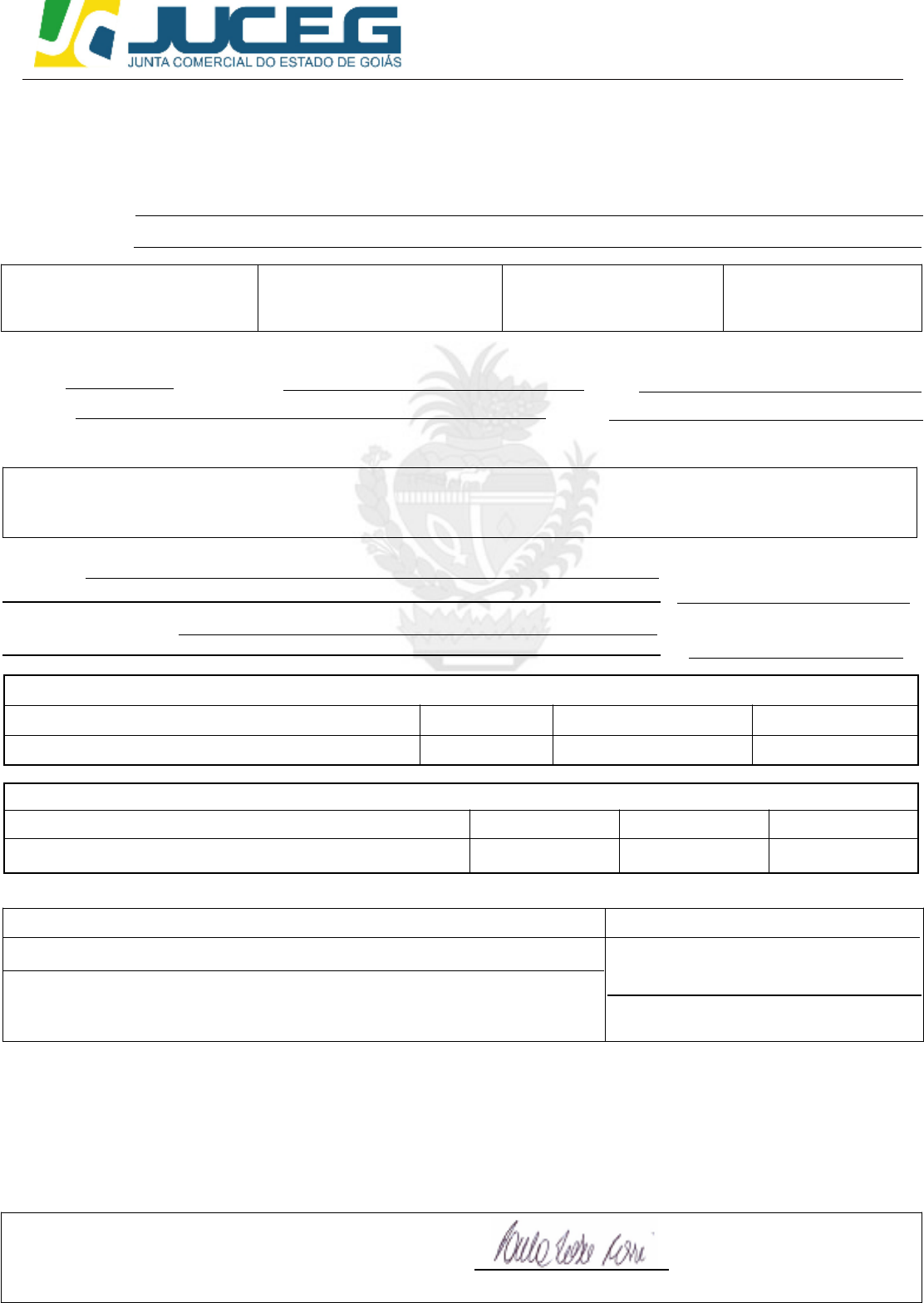 Certificamos que as informações abaixo constam dos documentos arquivados nesta Junta Comercial e são vigentes na data da sua expedição. CERTIDÃO SIMPLIFICADA SECRETARIA DE INDUSTRIA E COMÉRCIO JUNTA COMERCIAL DO ESTADO DE GOIÁS SISTEMA NACIONAL DE REGISTRO DE EMPRESAS MERCANTIS - SINREM NOME EMPRESARIAL NATUREZA JURÍDICA 52 60095900-0 37.318.506/0001-53 04/06/2020 01/06/2020 NIRE (Sede) CNPJ DATA DE ARQUIVAMENTO DO ATO CONSTITUTIVO DATA DE INÍCIO DE ATIVIDADE UNIVERSO INDUSTRIA E DISTRIBUIÇÃO EIRELI EMPRESA INDIVIDUAL DE RESPONSABILIDADE LTDA TITULAR NOME / CPF ADMINISTRADOR INÍCIO DO MANDATO TÉRMINO DO MANDATO VENERANDO SOARES LIMA 052.360.958-24/ SIM 01/06/2020 XXXXXXXXXXXXXX RUA A ESQUINA COM RUA I MICROEMPRESA OU EMPRESA DE PEQUENO PORTE (Lei n 123/2006) SN DUZENTOS MIL REAIS ESTADO GO CAPITAL R$ OBJETO SOCIAL / ATIVIDADE ECONÔMICA ENDEREÇO ITAPOA DUZENTOS MIL REAIS CAPITAL INTEGRALIZADO R$ FABRICACAO DE EQUIPAMENTOS DE TRANSPORTE, COMERCIO ATACADISTA DE TINTAS, VERNIZES E SIMILARES,COMERCIO VAREJISTA DE TINTAS E MATERIAIS PARA PINTURA, COMERCIO ATACADISTA DE SOLVENTES, COMERCIO ATACADISTA ESPECIALIZADO DE MATERIAIS DE CONSTRUCAO, COMERCIO ATACADISTA DE PRODUTOS SIDERURGICOS E METALURGICOS, EXCETO PARA CONSTRUCAO, COMERCIO ATACADISTA DE MAQUINAS E EQUIPAMENTOS PARA USO INDUSTRIAL PARTES E PECAS, COMERCIO ATACADISTA DE FERRAGENS E FERRAMENTAS, MONTAGEM DE ESTRUTURAS METALICAS,COMERCIO ATACADISTA DE MATERIAIS DE CONSTRUCAO. Indeterminado PRAZO DE DURAÇÃO200.000,00 MUNICÍPIO QUADRA27 LOTE 01 SALA 02 200.000,00 NÚMERO COMPLEMENTO APARECIDA DE GOIÂNIA BAIRRO Microempresa ADMINISTRADOR NOMEADO / INÍCIO DO MANDATO / TÉRMINO DO MANDATO NOME CPF INÍCIO DO MANDATO TÉRMINO DO MANDATO VENERANDO SOARES LIMA 052.360.958-24 01/06/2020 XXXXXXXXXXXXXX ÚLTIMO ARQUIVAMENTO NÚMERO SITUAÇÃO DAS FILIAIS EVENTO(S) STATUS ATO 20200544667 REGISTRO ATIVO XXXXXXXXXXXXXX 04/06/2020DATA ENQUADRAMENTO DE MICROEMPRESA ENQUADRAMENTO DE MICROEMPRESA Chave de segurança : A autenticidade deste documento pode ser verificadas através do endereço: Certidão Simplificada emitida NNfHL VANDO LIMA DA SILVA DE JESUS, 01515451119 Paula Nunes Lobo Veloso Rossi SECRETÁRIA-GERALhttp://servicos.juceg.go.gov.br/ Protocolo: 214932134 Goiânia, 23 de Agosto de 2021 Página: 1 / 1 Paula Nunes Lobo Veloso Rossi 2021-08-23T11:41:26-0300 Goiânia - GO PAULA NUNES LOBO VELOSO ROSSI:90076664104 Autenticação de Certidão Simplificada
