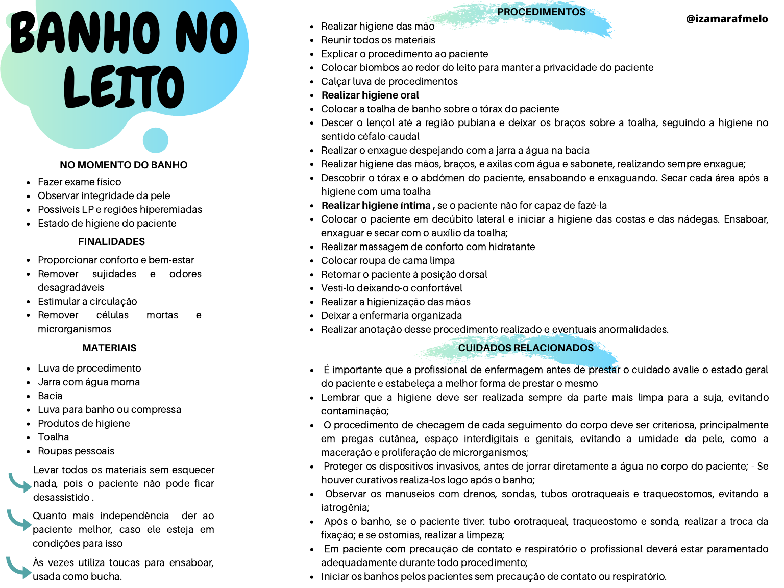 Realizar higiene das mão Reunir todos os materiais Explicar o procedimento ao paciente Colocar biombos ao redor do leito para manter a privacidade do paciente Calçar luva de procedimentos Realizar higiene oral Colocar a toalha de banho sobre o tórax do paciente Descer o lençol até a região pubiana e deixar os braços sobre a toalha, seguindo a higiene no sentido céfalo-caudal Realizar o enxague despejando com a jarra a água na bacia Realizar higiene das mãos, braços, e axilas com água e sabonete, realizando sempre enxague; Descobrir o tórax e o abdômen do paciente, ensaboando e enxaguando. Secar cada área após a higiene com uma toalha Realizar higiene íntima , se o paciente não for capaz de fazê-la Colocar o paciente em decúbito lateral e iniciar a higiene das costas e das nádegas. Ensaboar, enxaguar e secar com o auxílio da toalha; Realizar massagem de conforto com hidratante Colocar roupa de cama limpa Retornar o paciente à posição dorsal Vesti-lo deixando-o confortável Realizar a higienização das mãos Deixar a enfermaria organizada Realizar anotação desse procedimento realizado e eventuais anormalidades. É importante que a profissional de enfermagem antes de prestar o cuidado avalie o estado geral do paciente e estabeleça a melhor forma de prestar o mesmo Lembrar que a higiene deve ser realizada sempre da parte mais limpa para a suja, evitando contaminação; O procedimento de checagem de cada seguimento do corpo deve ser criteriosa, principalmente em pregas cutânea, espaço interdigitais e genitais, evitando a umidade da pele, como a maceração e proliferação de microrganismos; Proteger os dispositivos invasivos, antes de jorrar diretamente a água no corpo do paciente; - Se houver curativos realiza-los logo após o banho; Observar os manuseios com drenos, sondas, tubos orotraqueais e traqueostomos, evitando a iatrogênia; Após o banho, se o paciente tiver: tubo orotraqueal, traqueostomo e sonda, realizar a troca da fixação; e se ostomias, realizar a limpeza; Em paciente com precaução de contato e respiratório o profissional deverá estar paramentado adequadamente durante todo procedimento; Iniciar os banhos pelos pacientes sem precaução de contato ou respiratório. BANHO NO LEITO Luva de procedimento Jarra com água morna Bacia Luva para banho ou compressa Produtos de higiene Toalha Roupas pessoais Proporcionar conforto e bem-estar Remover sujidades e odores desagradáveis Estimular a circulação Remover células mortas e microrganismos Fazer exame físico Observar integridade da pele Possíveis LP e regiões hiperemiadas Estado de higiene do paciente Levar todos os materiais sem esquecer nada, pois o paciente não pode ficar desassistido . Quanto mais independência der ao paciente melhor, caso ele esteja em condições para isso PROCEDIMENTOS Às vezes utiliza toucas para ensaboar, usada como bucha. FINALIDADES NO MOMENTO DO BANHO MATERIAIS CUIDADOS RELACIONADOS @izamarafmelo
