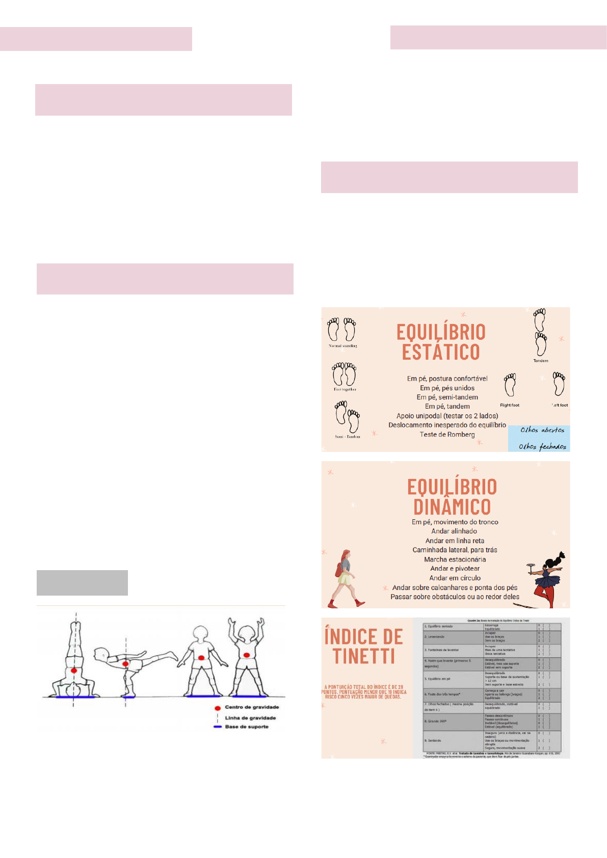 -Capacidade do organismo de manter posturas, posições e atitudes, compensando e anulando todas as forças que agem sobre o corpo. -Relação entre o centro de massa e centro de gravidade. -Estático: O equilíbrio estático se refere a capacidade de manter uma postura com o mínimo possível de oscilação. (Aquele equilíbrio que não ocorre nenhuma movimentação) -Dinâmico: O equilíbrio dinâmico caracteriza a manutenção da postura ao realizar atividades que requerem um maior desempenho motor e que provoque perturbações do qual o corpo precisa se reajustar. Base de apoio: O equilíbrio se da a partir da união do sistema visual + sistema proprioceptivo (nos torna apto a localizar partes do nosso corpo com relação ao espaço + sistema vestibular (dá consciência a essa localização do corpo); -Observar reações: oscilação do CG e estratégias motoras; -Quedas; -Segurança do paciente; Equilíbrio Conceito Tipos de equilíbrio Como fazer a avaliação?