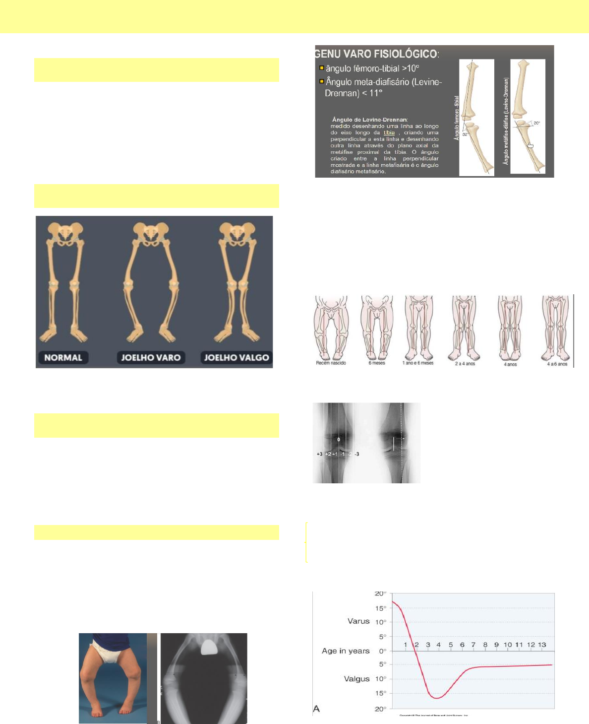 Introdução ❖ Deformidades da tíbia e fíbula são as anormalidades mais comuns que afetam os membros inferiores das crianças. ❖ A maioria das deformidades da perna é fisiológica e auto-limitada. ❖ Podem ser congênitas ou adquiridas. Desvios angulares ❖ Varo-afastamento do eixo central ❖ Valgo- Aproximação do eixo central Genu varum ❖ Deformidade extremamente comum. ❖ Desvio lateral dos joelhos, com arqueamento da tíbia ❖ Classificação- fisiológico ou postural e patológico GENU VARUM FISIOLÓGICO ▪ Deformidade com um ângulo fêmoro-tibial maior do que 10º*** fise radiologicamente normal arqueamento lateral da tíbia proximal. ▪ Fise: espaço fisário (por onde o osso cresce, espaço endocondral) ▪ Arqueamento lateral da tíbia proximal MEDIDA DO ÂNGULO FÊMORO-TIBIAL >11° patologia específica DESENVOLVIMENTO DO ÂNGULO FEMORO-TIBIAL AO LONGO DO CRESCIMENTO ➢ 6-12 meses: varo máximo ➢ 18-24 meses: alinhamento neutro ➢ 4 anos: valgo máximo ➢ 7 anos: atenuação do valgo ➢ 11 anos: padrão adulto QUADRANTES DO JOELHO ➢ Lateralização do eixo- carga fica mais intensa no compartimento medial -1 e -2: varo +1 +2: valgo Gráfico de Vankka e Salenius ➢ Descreve a mudança dos desvios angulares ➢ Genu varum fisiológico-resolução espontânea 3 e 5 anos Deformidades associadas ao joelho Larissa Cedraz ➢ Corrige em torno dos 4, padrão de correção com 7 e em torno de 11 anos como ficará JOELHO VARO PATOLÓGICO Causas: Raquitismo, osteopatia metabólica, deficiência de vitamina D, Artrite reumatóide TÍBIA VARA ➢ Retardo de crescimento do aspecto medial da epífise proximal da tíbia. ÜDuas formas reconhecidas: Tíbia vara infantil (doença de Blount) - Instalação até os 3 anos Tíbia vara do adolescente - Instalação após os 10 anos DOENÇA DE BLOUNT ➢ Definição ➢ Blount, 1937 Angulação abrupta logo abaixo da fise proximal ➢ Linha fisária irregular Epífise em forma de cunha, com bico na metáfise medial Subluxação aparente da tíbia proximal ➢ Fisiologia: Perda do arranjo colunar e da ossificação endocondral, tanto no aspecto medial da metáfise quanto na área correspondente da fise. É freqüente o desenvolvimento de frouxidão do complexo ligamentar lateral do joelho. THRUST Diagnóstico diferencial: Genu varum fisiológico Displasias esqueléticas Doenças osteo-metabólicas (Percentil) Deformidade pós-traumática: Sequela pós-infecciosa, Displasia fibrocartilaginosa focal proximal (epífise normal) Ângulo metáfise-diáfise da tíbia proximal (Levine e Drennan, 1982) > 11º: 29 em 30 pacientes desenvolveram doença de Blount. < 11º: 3 em 58 pacientes foram afetados. Não é diagnóstico de Blount, ajuda a diferenciar tipo 1 de Blount do varo fisiológico. Classificação Tratamento • Órteses: Idade < 3 anos , Langesnkiöld até II , Ausência de instabilidade ligamentar, Ausência de obesidade (> percentil 90) RESULTADOS DO TRATAMENTO NÃO CIRÚRGICO VARIAM NA LITERATURA: 50 A 90 % DE BOM RESULTADO. • ÜLangenskiöld > II: Tratamento deve ser cirúrgico. Já não há indicação de tratamento ortótico isolado no estágio II • -Langenskiöld VI • Menos de 2 anos de crescimento restante e congruência articular: osteotomia corretiva + fechamento fisário total (epifisiodese) • Mais de 2 anos de crescimento restante: Epifisiodese lateral Correção angular + alongamento Correção + fixação externa TIBIA VARA DO ADOLESCENTE ✓ Aspectos clínicos Paciente típico é adolescente masculino, negro e obeso Teoria da sobrecarga – Lei de Hueter-Volkmann Achados radiográficos ✓ O formato da fise tibial proximal é relativamente normal, mas há sinais de dano microscópico ✓ Ocorre alargamento do aspecto lateral da fise femoral distal, pela mudança do eixo mecânico VARO FEMORAL SECUNDÁRIO ✓ Tratamento: Osteotomia ✓ Realinhamento por fixação externa ✓ Epifisiodese lateral Grampo hemiepifisário Geno Valgo ❖ Desvio angular da articulação do joelho, no plano frontal, em direção à linha média do corpo, causando alterações no eixo anatômico e mecânico do membro inferior ❖ Após 18 meses de idade o joelho das crianças normais passa a assumir o formato em valgo, que atinge o valor máximo aos 3 anos de idade, quando então passa a diminuir gradativamente até os 6-7 anos; ❖ Nos casos de geno valgo se apresenta de forma mais acentuado, assimétrico, se houver história familiar ou se a criança for de baixa estatura para a idade deve-se pensar em formas patológicas: displasia metafisária, raquitismo e fratura da metáfise proximal da tíbia, devendo ser tratado conforme a patologia de base; ❖ Na pré-adolescência, se houver persistência, idade esquelética de 11 anos nas meninas e de 12 anos nos meninos, a possibilidade de correção espontânea é remota; ❖ Howorth (1971), relata que geno valgo se não estiver corrigido aos 10 anos de idade a distância IM for superior a 7,5 cm (7,5 a 10 cm) indica correção cirurgica; ❖ Sharrard (1976) observou que no geno valgo com distancia IM acima de 10 cm, em idade de 10-11 anos, é improvável que a correção ocorra espontaneamente; ❖ Hemiepifiodese e grampeamento fisário são as duas técnicas mais utilizadas de correção de geno varo e geno valgo no adolescente; ❖ O critério clinico para a indicação de hemiepifiodese é a presença de intervalo intermaleolar (IM) maior que 8 cm na posição ortostática, e para determinar a idade adequada para realizá-la, utiliza-se o gráfico de Bowen, que relaciona deformidade versus crescimento; ❖ Geralmente o grampeamento é realizado no fêmur, e a idade recomendada pé em torno de 11 anos para os dois sexos; ❖ Quando a distância IM for maior que 12,5 cm ou quando o paciente tiver mais que 13 anos o grampeamento deve ser feito no fêmur e na tíbia. ❖ O joelho valgo (genu valgum) é uma condição clínica onde há um desvio angular da articulação do joelh