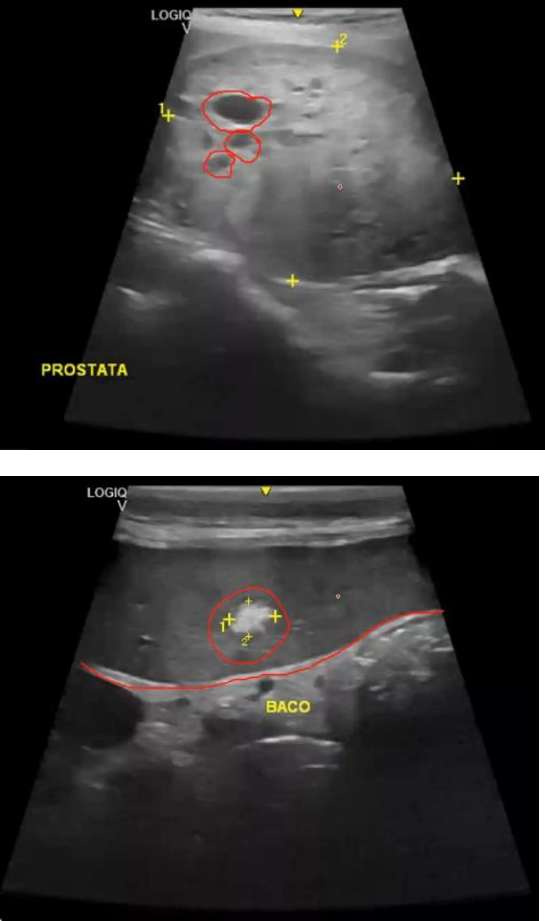 Imagens Aspecto heterogêneo com presença de cistos Hiperplasia prostática benigna Área homogênea com uma formação hiperecogenica Para saber necessário fazer histopatológico Corno uterino aumentado de tamanho com conteúdo anecogenico Pode ser muco/pio/hemometra Testículo heterogêneo com nódulo isoecogenico (semelhante ao testículo) com áreas anecogenicas Pode ser uma neoplasia Area anecogenica Cisto no ovario Parenquima testicular heterogenio Provavelm neoplasia Fetos mumificados Superfície hiperecogenica com presença de sombra acústica posterior Calculo Parte hipoecogenica e parte hiperecogenica central Granuloma no coto uterino Mucoceli Prostata com aumento de tamanho com presençade cistos Nodulo hipoecogenico Fetos Nodulo hipoecogenico com area hiperecogenica Neoplasia Torção do cordão espermático Ausência de vascularização e ecogenicidade diminuída Hiperplasia endometrial cística Presença de cistos na parede Prostatite Heterogêneo com presença de áreas hiper e hipoecogenicas Diferencial de neoplasia Cisto hepático Estrutura anecogenica, com contornos definidos e circulares. Embriões e vesícula gestacional Gestação Fetos macerados Estruturas fetais desorganizadas Aumento da próstata Neoformação Cisto papaprostatico Estrutura anecogenica projetando para fora do parênquima prostático Testículo equitopico Aumento de corno uterino Não é possível diferenciar de gestação ou neoformação Epididimite Ecogenicidade diminuida Possivel ver os vasos Vesicula biliar com presença de lama biliar