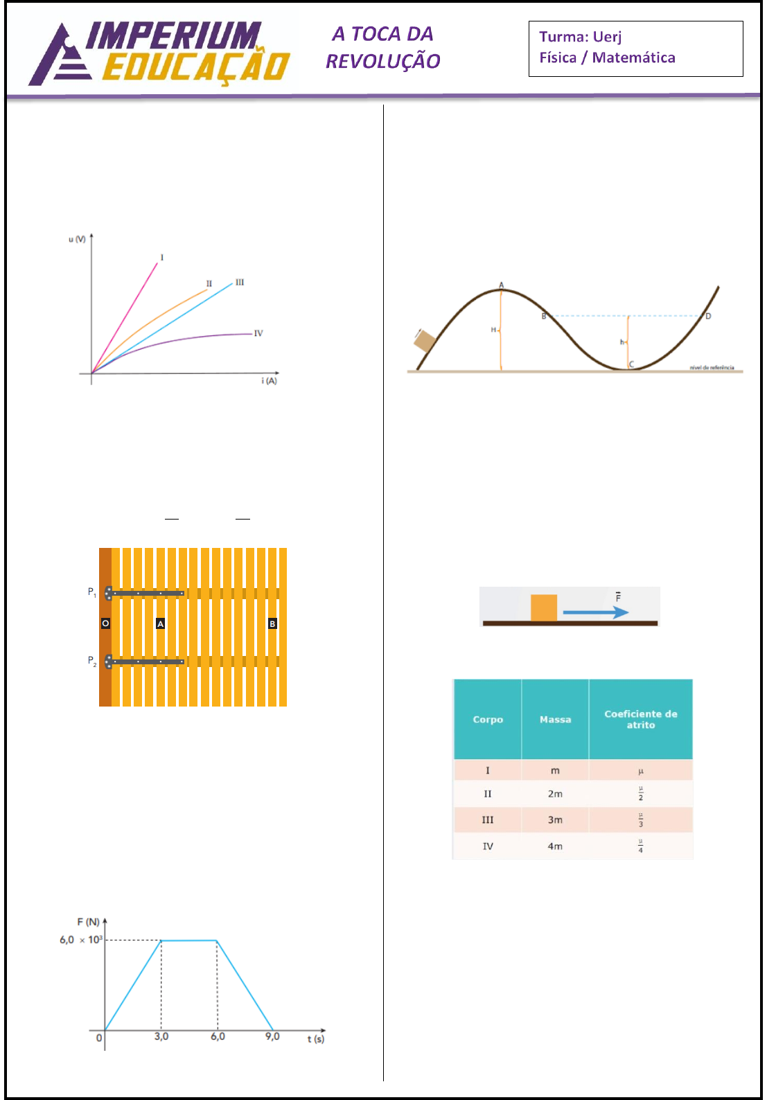 www.imperiumeducacao.com.br Página 1 de 4 AULÃO DE REVISÃO UERJ – FÍSICA. QUESTÃO 01. (UERJ) Em um experimento, quatro condutores, I, II, III e IV, constituídos por metais diferentes e com mesmo comprimento e espessura, estão submetidos à tensão elétrica. O gráfico abaixo apresenta a variação de tensão U em cada resistor em função da corrente elétrica i. O condutor que apresenta a maior resistividade elétrica é: A) I B) II C) III D) IV QUESTÃO 02. (UERJ) Um portão fixado a uma coluna está articulado nos pontos P1 e P2, conforme ilustra a imagem a seguir, que indica também três outros pontos: O, A e B. Sabe-se que =OB 2,4 m e =OA 0,8 m. Para abrir o portão, uma pessoa exerce uma força perpendicular de 20 N no ponto B, produzindo um momento resultante MB. O menor valor da força que deve ser aplicada no ponto A para que o momento resultante seja igual a MB, em newtons, corresponde a: A) 15 B) 30 C) 45 D) 60 QUESTÃO 03. (UERJ) Observe no gráfico a variação, em newtons, da intensidade da força F aplicada pelos motores de um veículo em seus primeiros 9 s de deslocamento. Nesse contexto, a intensidade do impulso da força, em N.s, equivale a: A) 1,8 x 104 B) 2,7 x 104 C) 3,6 x 104 D) 4,5 x 104 QUESTÃO 04. (UERJ) Um bloco de massa m desliza sem atrito sobre uma superfície, passando sucessivamente pelos pontos A, B, C e D, conforme indicado no esquema: Sendo EMA, EMB, EMC e EMD, respectivamente, a energia mecânica nos pontos A, B, C e D, a relação entre elas é: A) =MA MC MC MDE E E E B) MA MC MC MDE E E E C) MA MC MC MDE E E E D) = = =MA MC MC MDE E E E QUESTÃO 05. (UERJ) Uma força F constante atua igualmente em quatro corpos distintos, de acordo com o esquema a seguir: Observe na tabela as massas dos corpos, além dos coeficientes de atrito entre cada um deles e a superfície de apoio. O corpo que apresenta maior aceleração é: A) I B) II C) III D) IV QUESTÃO 06. (UERJ) Em uma mesa de sinuca, as bolas A e B, ambas com massa igual a 140 g, deslocam-se com velocidades VA e VB, na mesma direção e sentido. O gráfico abaixo representa essas velocidades ao longo do tempo. www.imperiumeducacao.com.br Página 2 de 4 Após a colisão entre as bolas, a quantidade de movimento total, em kg.m/s, é igual a: A) 0,56 B) 0,84 C) 1,60 D) 2,24 QUESTÃO 07. (UERJ) Resistores ôhmicos idênticos foram associados em quatro circuitos distintos e submetidos à mesma tensão UAB. Observe os esquemas: Nessas condições, a corrente elétrica de menor intensidade se estabelece no seguinte circuito: A) I B) II C) III D) IV QUESTÃO 08. (UERJ) Analise o gráfico a seguir, que indica a variação da capacidade térmica de um material (C) em função da temperatura ( ). A quantidade de calor absorvida pelo material até a temperatura de 50°C, em calorias, é igual a: A) 500 B) 1500 C) 2000 D) 2200 QUESTÃO 09. (UERJ) Um sistema é constituído por seis moedas idênticas fixadas sobre uma régua de massa desprezível que está apoiada na superfície horizontal de uma mesa, conforme ilustrado abaixo. Observe que, na régua, estão marcados pontos equidistantes, numerados de 0 a 6. Ao se deslocar a régua da esquerda para a direita, o sistema permanecerá em equilíbrio na horizontal até que determinado ponto da régua atinja a extremidade da mesa. De acordo com a ilustração, esse ponto está representado pelo seguinte número: A) 4 B) 3 C) 2 D) 1 QUESTÃO 10. (UERJ) O gráfico abaixo indica o comportamento térmico de 10 g de uma substância que, ao receber calor de uma fonte, passa integralmente da fase sólida para a fase líquida. O calor latente de fusão dessa substância, em cal/g, é igual a: A) 70 B) 80 C) 90 D) 100 QUESTÃO 11. (UERJ) Um mergulhador precisa encher seu tanque de mergulho, cuja capacidade é de 1,42 x 10-2 m3, a uma pressão de 140 atm e sob temperatura constante. O volume de ar, em m3, necessário para a operação, à pressão atmosférica de 1 atm, é aproximadamente igual a: A) 0,25 B) 0,50 C) 2 D) 4 QUESTÃO 12. (UERJ) Considere um corpo sólido de volume V. Ao flutuar em água, o volume de sua parte submersa é igual a V 8 ; quando colocado em óleo, esse volume passa a valer V 6 . Com base nessas informações, conclui- se que a razão entre a densidade do óleo e a da água corresponde a: A) 0,15 B) 0,35 C) 0,55 D) 0,75 AULÃO DE REVISÃO UERJ – MATEMÁTICA. QUESTÃO 01. (UERJ) Em um escritório, há dois porta-lápis: o porta-lápis A com 10 lápis, dentre os quais 3 estão apontados, e o porta-lápis B com 9 lápis, dentre os quais 4 estão apontados. www.imperiumeducacao.com.br Página 3 de 4 Um funcionário retira um lápis qualquer ao acaso do porta-lápis A e o coloca no porta-lápis B. Novamente ao acaso, ele retira um lápis qualquer do porta-lápis B. A probabilidade de que este último lápis retirado não tenha ponta é igual a: A) 0,64 B) 0,57 C) 0,52 D) 0,42 QUESTÃO 02. (UERJ) Admita a realização de um campeonato de futebol no qual as advertências recebidas pelos atletas são representadas apenas por cartões amarelos. Esses cartões são convertidos em multas, de acordo com os seguintes critérios: • os dois primeiros cartões recebidos não geram multas; • o terceiro cartão gera multa de R$ 500,00; • os cartões seguintes geram multas cujos valores são sempre acrescidos de R$ 500,00 em relação ao valor da multa anterior. Na tabela, indicam-se as multas relacionadas aos cinco primeiros cartões aplicados a um atleta. Considere um atleta que tenha recebido 13 cartões amarelos durante o campeonato. O valor total, em reais, das multas geradas por todos esses cartões equivale a: A) 30.000 B) 33.000 C) 36.000 D) 39.000 QUESTÃO 03. (ENEM) Uma metalúrgica recebeu uma encomenda para fabricar, em grande quantidade, uma peça com o formato de um prisma reto com base triangular, cujas dimensões da base são 6 cm, 8 cm e 10 cm e cuja altura é 10 cm. Tal peça deve ser vazada de tal maneira que a perfuração na forma d