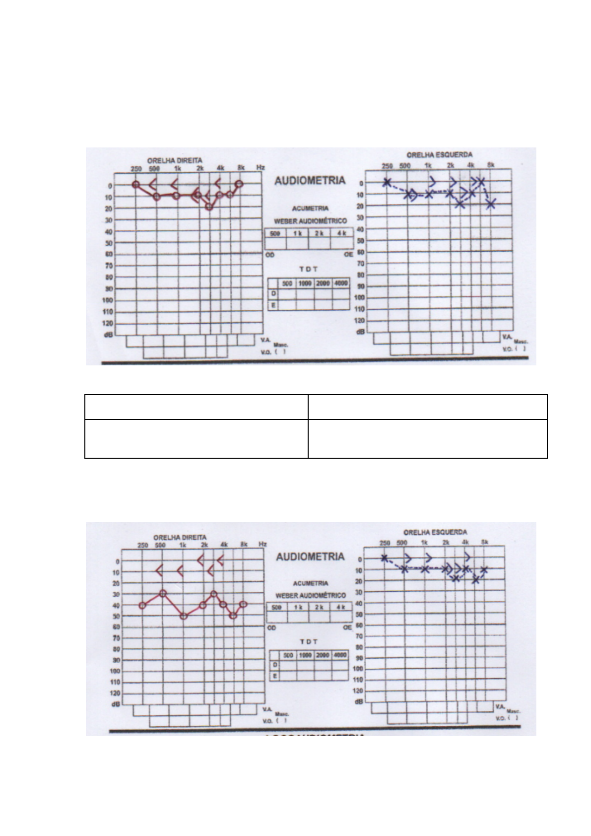 Alexia Menezes - Fonoaudiologia (UFS) - 3/8 Casos Clínicos (fictícios) - Audiologia ● Caso clínico 1 ORELHA DIREITA ORELHA ESQUERDA De acordo com Lloyd e Kaplan: audição normal De acordo com Lloyd e Kaplan: audição normal ● Caso clínico 2 Alexia Menezes - Fonoaudiologia (UFS) - 3/8 ORELHA DIREITA ORELHA ESQUERDA De acordo com Lloyd e Kaplan: perda auditiva condutiva de grau leve De acordo com Lloyd e Kaplan: audição normal ● Caso clínico 3 ORELHA DIREITA ORELHA ESQUERDA De acordo com Lloyd e Kaplan: perda auditiva neurossensorial de grau leve De acordo com Lloyd e Kaplan: perda auditiva neurossensorial de grau moderado