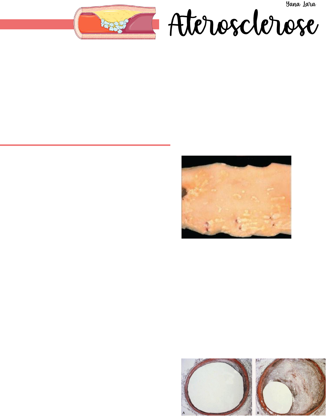 OBJETIVOS • Compreender o processo de formação das placas de ateroma e sua relação com a angina; • Entender a relação do IAM com a angina; • Diferenciar angina estável e instável; • Identificar os sinais macroscópicos e microscópicos do Infarto Agudo do Miocárdio; ATEROSCLEROSE A aterosclerose é caracterizada pela presença das placas ateroscleróticas, também chamadas de ateromas, lesões intimais elevadas compostas por centro mole e grumoso de lipídios, principalmente colesterol e ésteres de colesterol, com restos necróticos. Essas lesões geram redução do lúmen vascular e têm risco de ruptura, evoluindo para trombose catastrófica dos vasos; além disso, enfraquecem a camada média vascular e provocam a formação de aneurismas. As lesões constituem uma resposta inflamatória crônica das artérias, nesse processo complexo, em que participam ativamente células endoteliais, lipoproteínas (eventualmente modificadas), macrófagos (derivados de monócitos), linfócitos T, plaquetas e células musculares lisas, ocorre a seguinte sequência de eventos: ■ Agressão ao endotélio, com sua lesão/disfunção ■ Penetração e acúmulo de lipoproteínas na íntima ■ Adesão de monócitos e plaquetas, com liberação de fatores de crescimento ■ Migração para a íntima de células musculares lisas a partir da camada média, seguida de multiplicação delas ■ Síntese e deposição de matriz extracelular Embora possa ocorrer em qualquer artéria elástica ou muscular, a aterosclerose é mais comum na aorta (sobretudo na região abdominal) e nas artérias coronárias, cerebrais, mesentéricas, renais, ilíacas e femorais. A gravidade e a extensão das lesões variam muito nesses diferentes locais: há indivíduos com lesão grave na aorta, enquanto nos outros locais as alterações são discretas ou ausentes; em outros, as lesões são mais graves nas coronárias ou cerebrais. As combinações dessas sedes são muitas. As lesões acometem prioritariamente a camada íntima, são progressivas e podem ser resumidas nos tipos descritos a seguir: ▶ Estrias lipídicas. Macroscopicamente, aparecem como manchas ou pequenas elevações lineares, amareladas. Microscopicamente, encontram-se na íntima as células espumosas ou xantomatosas, que são macrófagos ou células musculares lisas abarrotadas de lipídeos (células volumosas, arredondadas, com núcleo central e citoplasma claro pela riqueza de gorduras). As estrias lipídicas podem regredir, estacionar ou progredir para ateromas. ▶ Placas ateromatosas (ateromas). São as lesões mais características da doença. Ateromas são lesões intimais, de tamanhos e formas variados, às vezes confluentes, de coloração branco-amarelada e que, tipicamente, fazem saliência na luz arterial. As placas ocupam apenas parte da circunferência do vaso (lesão excêntrica). Ao microscópio, a lesão é constituída por quantidade variada de células (macrófagos, células musculares lisas, leucócitos, fibroblastos), matriz extracelular (fibras colágenas e elásticas e proteoglicanos) e lipídeos, que podem estar dentro (células espumosas) ou fora de células. As gorduras são representadas sobretudo por colesterol, que muitas vezes forma fendas características. Na superfície da lesão, logo abaixo do endotélio, encontra-se a chamada capa fibrosa, formada por fibras colágenas e células musculares lisas. Como a lesão é expansiva, ocorre redução da luz vascular. Na região central do ateroma, existe o núcleo ou centro necrótico, onde predominam lipídeos, células espumosas, leucócitos e restos celulares. Na periferia da lesão, há neoformação de pequenos vasos sanguíneos. ➔ Classificação As placas ateromatosas podem ser de dois tipos: (1) placas “moles” ou instáveis, nas quais predominam o componente lipídico, restos celulares e leucócitos, com pouco tecido conjuntivo; (2) placas “duras” ou estáveis, em que predominam o componente fibroso, havendo pouco componente lipídico. ➔ Complicações Com o passar do tempo, os ateromas podem sofrer várias modificações, podendo originar: ▶ Placas complicadas. As principais complicações nas placas são: (1) erosão ou ulceração, mais comuns em placas moles, que resulta na perda do revestimento endotelial; (2) trombose, oclusiva ou não, quase sempre associada a erosões ou úlceras; (3) hemorragia, em que o sangue penetra na placa a partir de ruptura na sua superfície ou em pequenos vasos neoformados; (4) calcificação, que pode atingir pequenas áreas ou grande parte da placa. Quando extensa, calcificação pode ser reconhecida à radiografia e ajuda no diagnóstico da doença. ➔ Consequências A aterosclerose provoca duas consequências principais: (1) obstrução arterial, com isquemia, aguda ou crônica; (2) dilatação arterial, localizada ou difusa, no primeiro caso resultando em aneurisma. Vários fatores contribuem para a obstrução arterial: ■ Crescimento da placa. Dependendo do calibre do vaso, a expansão da placa leva a redução progressiva e às vezes acentuada da luz. ■ Hemorragia no ateroma. O sangue acumulado no interior da placa aumenta bruscamente o volume dela, podendo até ocluir o vaso ■ Vasoespasmos. Contração anormal e vigorosa do vaso é capaz de agravar a obstrução vascular. Espasmos em ateromas ocorrem por vários motivos: (1) redução de agentes vasodilatadores. O endotélio produz NO e prostaciclina, que são vasodilatadores. Nas placas, o endotélio encontra-se muitas vezes lesado (compressão pelo ateroma) ou destruído (erosões), resultando em menor liberação dessas substâncias; (2) aumento de vasoconstritores. Adesão plaquetária nos ateromas é frequente, o que libera tromboxano A2, um potente vasoconstritor suscetíveis a sofrer ruptura (erosões, úlceras ou fissuras). Ruptura de placas pode ocorrer também após emoções fortes. Com a perda endotelial, ocorrem coagulação sanguíne