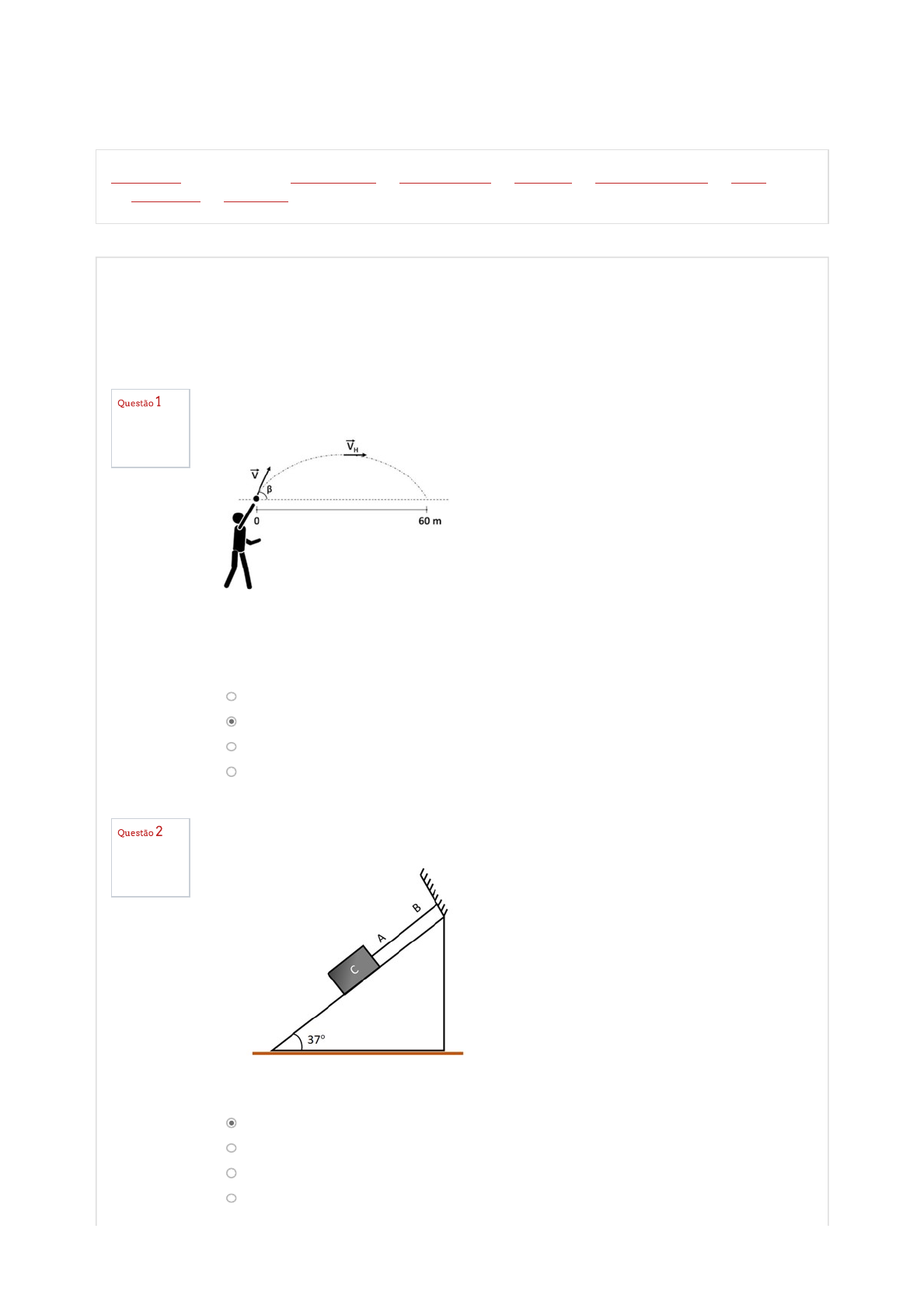 Página inicial / Meus cursos / CURSOS FUNEC / Graduação - EAD / Aluno EAD / JUNÇÕES DE TURMA / Física I / AVALIAÇÕES / AVALIAÇÃO Completo Atingiu 3,00 de 3,00 Completo Atingiu 3,00 de 3,00 Iniciado em Saturday, 28 Aug 2021, 09:54 Estado Finalizada Concluída em Saturday, 28 Aug 2021, 11:08 Tempo empregado 1 hora 14 minutos Avaliar 48,00 de um máximo de 60,00(80%) A figura abaixo representa a reposição de uma bola em uma partida de futebol. A trajetória da bola que vai das mãos do goleiro até a posição de 60 metros, leva o tempo de 4 segundos. Desprezando a resistência do ar, podemos concluir que os módulos da velocidade V, de lançamento, e da velocidade V , na altura máxima, são, em metros por segundos, iguais a, respectivamente: (Dados: senβ = 0,8; cosβ = 0,6.) Escolha uma opção: a. 25 e 25. b. 25 e 15. c. 15 e 50. d. 15 e 25. H Um bloco de massa 5 kg é mantido em repouso por um fio de massa desprezível, como mostra a figura. Considere g = 10 m/s²; sen 37º = cos 53º = 0,6; sen 53º = cos 37º = 0,8. Se o fio se romper a aceleração do bloco será: Escolha uma opção: a. a = 6 m/s² b. a = 8 m/s² c. a = 5m/s² d. a = 4 m/s² Página inicial / Meus cursos / CURSOS FUNEC / Graduação - EAD / Aluno EAD / JUNÇÕES DE TURMA / Física I / AVALIAÇÕES / AVALIAÇÃO Completo Atingiu 3,00 de 3,00 Completo Atingiu 3,00 de 3,00 Iniciado em Saturday, 28 Aug 2021, 09:54 Estado Finalizada Concluída em Saturday, 28 Aug 2021, 11:08 Tempo empregado 1 hora 14 minutos Avaliar 48,00 de um máximo de 60,00(80%) A figura abaixo representa a reposição de uma bola em uma partida de futebol. A trajetória da bola que vai das mãos do goleiro até a posição de 60 metros, leva o tempo de 4 segundos. Desprezando a resistência do ar, podemos concluir que os módulos da velocidade V, de lançamento, e da velocidade V , na altura máxima, são, em metros por segundos, iguais a, respectivamente: (Dados: senβ = 0,8; cosβ = 0,6.) Escolha uma opção: a. 25 e 25. b. 25 e 15. c. 15 e 50. d. 15 e 25. H Um bloco de massa 5 kg é mantido em repouso por um fio de massa desprezível, como mostra a figura. Considere g = 10 m/s²; sen 37º = cos 53º = 0,6; sen 53º = cos 37º = 0,8. Se o fio se romper a aceleração do bloco será: Escolha uma opção: a. a = 6 m/s² b. a = 8 m/s² c. a = 5m/s² d. a = 4 m/s² Completo Atingiu 3,00 de 3,00 Completo Atingiu 0,00 de 3,00 Completo Atingiu 3,00 de 3,00 Completo Atingiu 3,00 de 3,00 Uma força de 15N é aplicada fazendo um ângulo de 40º com a horizontal sobre um bloco de 3,5 kg. O coeficiente de atrito cinético entre o bloco e o piso é 0,25. O módulo da força de atrito que o piso exerce sobre o bloco vale: Escolha uma opção: a. F = 12N b. F = 8,75N c. F = 11N d. F = 10N at at at at Uma força horizontal de intensidade F = 10 N é aplicada no bloco A, de 6 kg, o qual está apoiado em um segundo bloco B, de 4 kg. Os blocos deslizam sobre um plano horizontal sem atrito. Nestas condições podemos afirmar que: Escolha uma opção: a. A força de ação é igual a 6N e a de reação de 4 N b. As forças de ação e reação são iguais a 4 newtons. c. A aceleração do conjunto é 2,5 m/s² d. O sistema permanece estático Se você está dirigindo um carro a 90 km/h, e seus olhos permanecem fechados por 0,50 s por causa de um espirro. A distância percorrida pelo carro até você abrir novamente os olhos é: Escolha uma opção: a. X = 45 km b. X = 12,5 m c. X = 1,25 m d. X = 45 m Um corpo parte do repouso em movimento retilíneo e acelera com aceleração escalar constante e igual a 2,0 m/s . Pode-se dizer que sua velocidade escalar e a distância percorrida após 3,0 segundos, valem, respectivamente: Escolha uma opção: a. 3,0 m/s e 12 m; b. 12 m/s e 35 m; c. 6,0 m/s e 9,0 m d. 6,0 m/s e 18 m; 2 Completo Atingiu 3,00 de 3,00 Completo Atingiu 3,00 de 3,00 Completo Atingiu 3,00 de 3,00 O maior novelo de lã do mundo possui um diâmetro de 4 metros. Supondo que a área de secção transversal do fio seja quadrada e com 4 milímetros de comprimento cada lado, e considerando, , podemos afirmar que o comprimento total do fio aproximando para a ordem de grandeza é: Escolha uma opção: a. 10³ m b. 10² m c. 10³ km d. 10 km π = 3 6 Você tem que dirigir em uma via expressa para se candidatar a um emprego em outra cidade, que fica a 300 km de distância. A entrevista foi marcada para as 11 h 15 min. Você planeja dirigir a 100 km/h e parte às 8 h para ter algum tempo de sobra. Você dirige à velocidade planejada durante os primeiros 100 km, mas, em seguida, um trecho em obras o obriga a reduzir a velocidade para 40 km/h por 40 km. A menor velocidade que você deve manter no resto da viagem para chegar a tempo é: Escolha uma opção: a. V = 128 km/h b. V = 70 km/h c. V = 20 m/s d. V = 12,8 m/s Dois blocos A e B de massas m = 3 kg e m = 2 kg, formam o sistema mostrado na figura. O cabo que une os dois blocos possui massa desprezível. O sistema se mantem estático devido ao atrito entre as superfícies do bloco A e o solo. Nestas condições é correto afirmar que o coeficiente de atrito entre as superfícies é: Escolha uma opção: a. b. c. d. A B μ = 23 μ = 0, 5 μ = 1 μ = 32 Completo Atingiu 3,00 de 3,00 Completo Atingiu 0,00 de 3,00 Completo Atingiu 3,00 de 3,00 Completo Atingiu 3,00 de 3,00 O gráfico abaixo representa o movimento de um automóvel que se desloca em linha reta, partindo de uma posição inicial zero. A função que indica o deslocamento do carro em relação ao tempo t é: Escolha uma opção: a. X = 5t + 0,625t b. X = 20t −1,25t c. X = 20t + 2,5t d. X = 5t − 0,55t 2 2 2 2 O projetil de um canhão de defesa de massa de 10 kg, é lançada com velocidade de 1080 km/h. se o ângulo de lançamento for de 15º o alcance máximo será: (use g = 10 m/s²) Escolha uma opção: a. 2,5 km b. 5,5 km c. 4,5 km d. 3,5 km Um corpo de massa igual a 20 kg experimenta a ação de duas forças que atuam na mesma direção e s