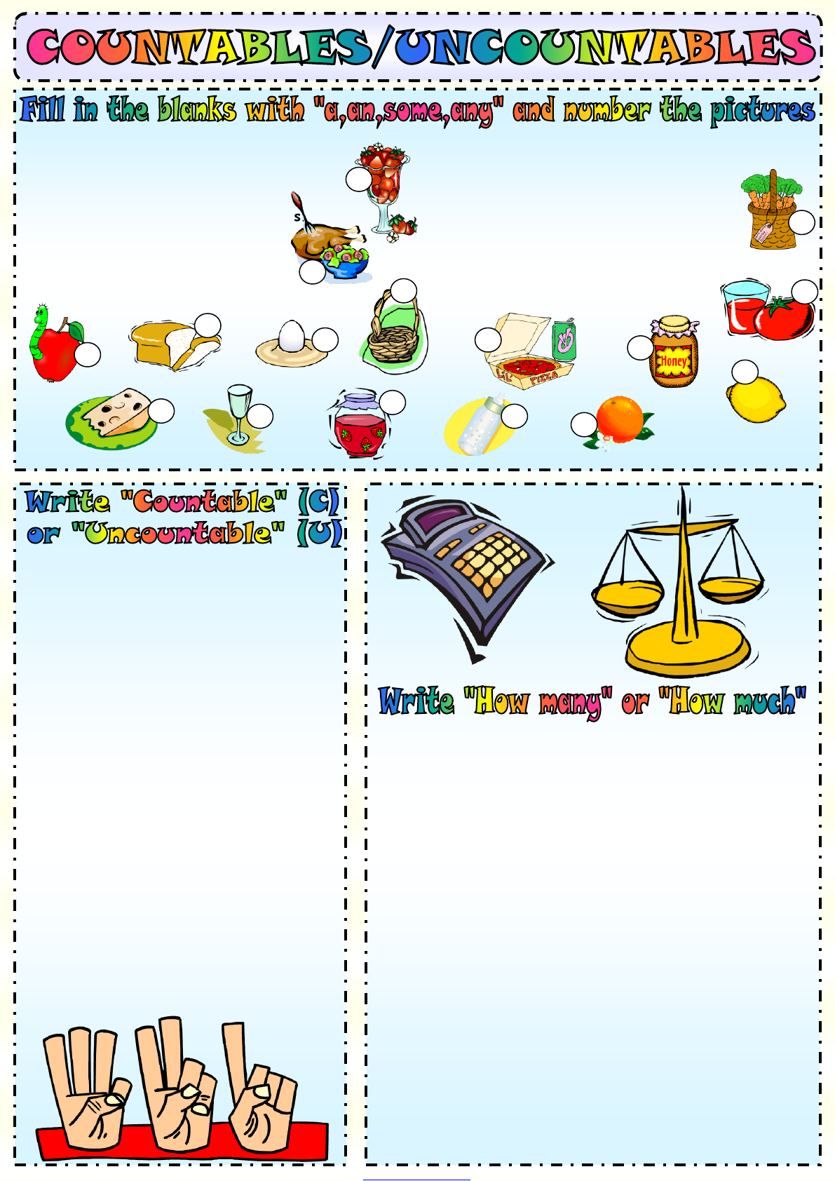 1.milk _____ 2.cucumber _____ 3.potato _____ 4.cherry _____ 5.olives _____ 6.yoghurt _____ 7.carrot _____ 8.peach _____ 9.money _____ 10.water _____ 11.egg _____ 12.fries _____ 13.time _____ 14.oil _____ 15.sugar _____ 16.onion _____ 17.banana _____ 18.bread _____ 19.cheese _____ 20.lemonade _____ 21.hamburger _____ 22.orange _____ 23.coffee _____ 24.salt _____ 25.rice _____ 26.pencil _____ 27.chicken _____ 28.tea _____ 29.book _____ 30.love _____ 31.meat _____ 32.umbrella _____ 33.woman _____ 34.butter _____ 9.There are _____ strawberries in the cup 10.Do you want to eat _____ orange? 11.There is _____ tomato near the glass. 12.There is _____ jam in the big jar. 13.We don't need _____ bread today. 14.I need _____ lemon for the salad. 15.There are _____ carrots in the basket 16.Susan has got _____ apple.It's red. 1.There is _____ honey in the jar. 2.There aren't _____ apples in the basket. 3.There is _____ egg on my plate. 4.There isn't _____ water in the glass. 5.There is _____ chicken and salad. 6.Let's buy _____ cheese from here. 7.There is _____ pizza in the box. 8.There isn't _____ milk in the bottle. 1. ________ cans of coke do you want? 2. ________ orange juice is there in your glass? 3. ________ time have we got to go to school? 4. ________ olive oil do you use for your cake? 5. ________ money do you pay for your house rent? 6. ________ people are there in that pink house? 7. ________ pencils would you like to buy? 8. ________ televisions are there in your house? 9. ________ hamburgers do you eat a week? 10. ________ bread do you eat at breakfast? 11. ________ kilos of meat does she want to buy? 12. ________ sugar would you like for your tea? 13. ________ bananas are there in that basket? 14. ________ jam is there in that big jar? 15. ________ lemonade will you prepare for the party? 16. ________ cars does that rich man have? 17. ________ hours does Steven sleep every night? 18. ________ bars of chocolate would you like? 19. ________ children are playing in the garden now? 20. ________ sleep does an adult need a day? 21. ________ salt do you put in your soup? 22. ________ t-shirts does she have in her wardrobe? Copyright © 2013. englishwsheets.com. All rights reserved. http://www.englishwsheets.com/