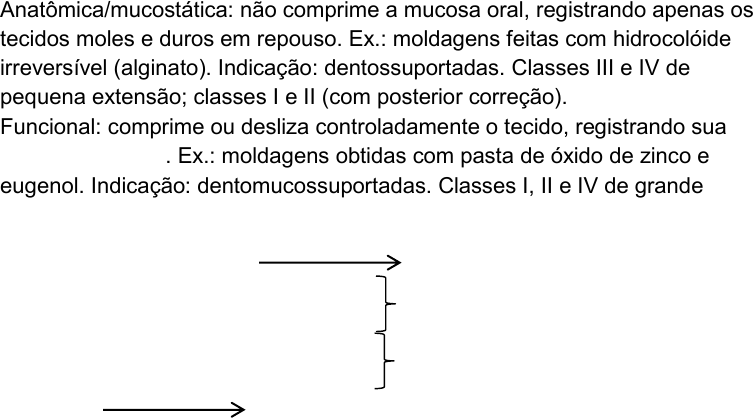 Marília Brito – T58 (2015) Técnicas de Moldagem em PPR (Profª Karina) Tipos de fibromucosa: Dura: muito fina. Se machuca facilmente, necessitando de alívios maiores. Locais: RAF palatina, tórus, crista do rebordo. Compressível: mais espessa. Dissipa melhor as cargas. Flácida: não oferece estabilidade para a prótese. Rebordos estrangulados e em lâmina de faca: requerem alívios maiores. Rebordos altos: excelentes. Modelos: Modelo de estudo: para planejamento. Usado para fazer o plano de tratamento, desenho e alterações dos dentes. Modelo de trabalho/mestre: obtido após o preparo de boca. pode ser anatômico (dentossuportadas) ou funcional (dentomucossuportadas). Modelo refratário: feito em laboratório. Obtido após duplicação do modelo de trabalho; é elaborado com material refratário. Modelo corrigido: obtido substituindo-se as áreas desdentadas do modelo de trabalho por aquelas obtidas por meio de moldagem funcional. Para moldagem de dentes: materiais elásticos. Ex.: hidrocolóide irreversível (alginato). Para moldagem de rebordo: materiais anelásticos (rígidos). Ex.: pasta de óxido de zinco e eugenol. Técnicas de moldagem: Anatômica/mucostática: não comprime a mucosa oral, registrando apenas os tecidos moles e duros em repouso. Ex.: moldagens feitas com hidrocolóide irreversível (alginato). Indicação: dentossuportadas. Classes III e IV de pequena extensão; classes I e II (com posterior correção). Funcional: comprime ou desliza controladamente o tecido, registrando sua forma “funcional”. Ex.: moldagens obtidas com pasta de óxido de zinco e eugenol. Indicação: dentomucossuportadas. Classes I, II e IV de grande extensão. Técnica simples (com 1 material) Mucostática Técnica mista ou composta (com 2 materiais) Funcionais Técnica de rapuano (mista) Modelo alterado Corretivas Moldagem funcional com a boca fechada Reembasamento Técnica de correção, não de moldagem Posição de moldagem: Maxila: à direita e atrás da cadeira. Mandíbula: à direita e à frente do paciente. Marília Brito – T58 (2015) Técnicas funcionais Conceito: registra detalhes anatômicos da área chapeável, inserções musculares e seus movimentos, utilizando material de moldagem adequado em moldeira individual. Molda a forma anatômica dos dentes e a forma “funcional” do rebordo alveolar. O objetivo de qualquer técnica de moldagem funcional é fornecer o máximo de apoio para as bases das PPRs. Isso garante a manutenção do contato oclusal entre dentes naturais e artificiais e, ao mesmo tempo, o movimento mínimo da base, que promoveria movimento de alavanca sobre os dentes pilares. Moldagem funcional x compressão: a compressão causa distorção da área e consequentemente do modelo, acelerando a reabsorção óssea. Assim, a compressão no ato da moldagem deve ser controlada. Moldagem mista ou composta: realiza-se a moldagem do rebordo alveolar com uma moldeira individual que cobre apenas essa área, utilizando pasta de óxido de zinco e eugenol. Então, o molde é reposicionado na boca do paciente. Com uma moldeira de estoque preenchida com alginato, o molde anterior é comprimido contra o rebordo alveolar, ao mesmo tempo em que os dentes remanescentes são moldados. A remoção do conjunto é feita de uma só vez. Essa técnica não é utilizada para a mandíbula, porque não fica precisa. Rapuano: com uma moldeira individual aberta na porção anterior, realiza-se a moldagem do rebordo alveolar utilizando pasta de óxido de zinco e eugenol. Pela porção aberta da moldeira é então colocado o alginato, moldando assim os dentes remanescentes. Técnicas corretivas Diferença entre moldagem funcional e corretiva: a moldagem corretiva corrige a parte do modelo anatômico que deveria ser funcional, mas não é. Modelo alterado: após construída a estrutura metálica da PPR, ela é acoplada a uma moldeira individual de resina acrílica. Antes da moldeira ser confeccionada, a estrutura deve ser provada na boca (na sessão da prova da estrutura metálica). Depois que a estrutura metálica foi ajustada e as moldeiras individuais confeccionadas, é feita a moldagem funcional do paciente, utilizando pasta de óxido de zinco e eugenol. Então, o modelo anatômico tem sua parte correspondente ao rebordo alveolar cortada. Com a estrutura metálica ajustada sobre os dentes, é vazado o gesso sobre a moldeira individual, “ligando” os 2 modelos. É então confeccionada uma base de prova. Moldagem funcional com a boca fechada: na sessão da prova dos dentes, após o ajuste oclusal, a base de prova é preenchida com material de moldagem e levada em posição. Com a estrutura metálica e a base de prova em posição sobre o modelo anatômico, cuja parte correspondente ao rebordo alveolar já foi cortada, é vazado o gesso sobre a base de prova, “ligando” os 2 modelos. Marília Brito – T58 (2015) Vantagens Desvantagens Modelo alterado Moldagem das bordas Movimentação da moldeira Procedimentos mais complexos Necessidade de técnicos especializados Boca fechada Simplicidade técnica Não permite realização de moldagem de bordas Menor número de sessões Possibilidade de compressão durante o ajuste oclusal. Cuidados com os moldes: Técnicas: imersão; aspersão. Materiais: hipoclorito 1% (não utilizado em técnicas corretivas, porque oxida o metal da estrutura metálica); glutaraldeído 2%.