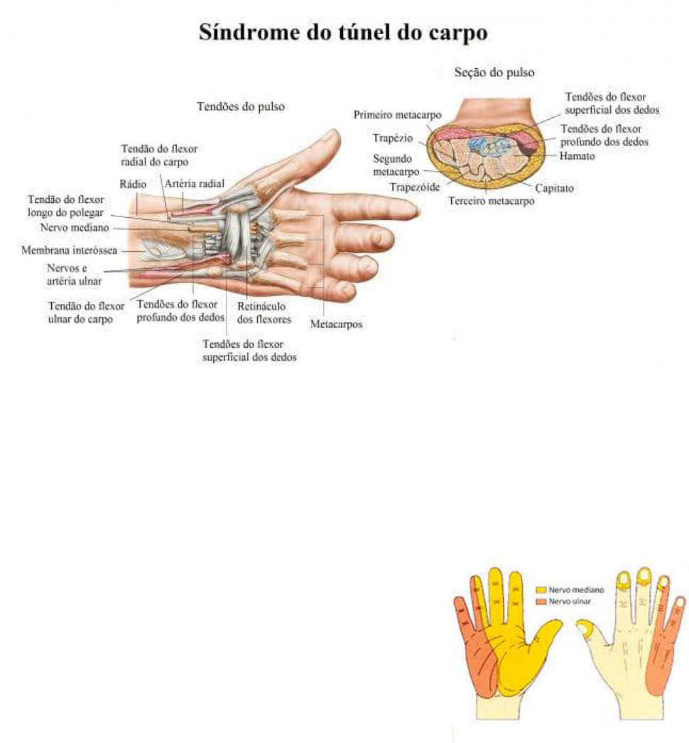 Síndrome do Túnel do Carpo “É definida pela compressão e/ou tração do nervo mediano ao nível do punho”. Anatomia - Limites: O túnel do carpo é um túnel osteofibroso inextensível definido como o espaço situado entre o retináculo dos flexores (RF), que constitui o teto, e a caneleta carpiana, o fundo. Ele é delimitado na borda ulnar pelo hâmulo do hamato, o piramidal e o pisiforme e na borda radial pelo escafoide, o trapézio e o tendão do flexor radial do carpo (FRC). A base é formada pela cápsula e os ligamentos radiocárpicos anteriores recobrem as porções subjacentes do escafoide, do semilunar, do capitato, do hamato, do trapézio e do trapezoide. - Conteúdo: O nervo mediano é acompanhado pelos quatro tendões dos flexores superficiais dos dedos (FSD), os quatro tendões dos flexores profundos dos dedos (FPD) e o tendão flexor longo do polegar (FLP). O FLP é o elemento mais radial. Na entrada do túnel, o nervo mediano está situado dorsalmente em relação ao palmar longo (PL) ou entre o flexor radial do carpo (FRC) e o PL. - Território de inervação do nervo mediano nas mãos: O território sensitivo do nervo mediano ocupa a face palmar de três dedos radiais e a metade radial do dedo anular. Na face dorsal, ele compreende as duas últimas falanges dos três primeiros dedos e a metade radial do quarto. Sobre o plano motor, o nervo mediano inerva classicamente os músculos de oposicão (abdutor curto do polegar, oponente do polegar e feixe superficial do flexor curto do polegar) e os dois primeiros músculos lumbricais. Fisiopatologia - Anomalias nervosas ultra estruturais e correlações clínicas Do ponto de vista fisiopatológico, uma síndrome compressiva combina fenômenos de compressão e tensão. Anatomicamente, existem dois locais de compressão do nervo mediano: um no nível do limite proximal do túnel do carpo, ocasionado pela flexão do punho por causa da alteração na espessura, na rigidez da fáscia antebraquial e na porção proximal do RF; e o segundo, no nível da porção mais estreita, próximo do hâmulo do hamato. Compressão e tração nervosa podem criar, de maneira sequencial, problemas na microcirculação sanguínea intra-neural, lesões no nível da bainha de mielina e no nível axonal e alterações no tecido conjuntivo de suporte. Classifica-se em estágios: Estágio precoce – Inicial, caracterizado por sintomatologia intermitente unicamente noturna. Na STC idiopática, múltiplos fatores são a origem do aumento de pressão intra-túnel noturna: • Redistribuição, em posição supina, dos fluidos às membranas superiores; • Falta de um mecanismo de bomba muscular que contribua para drenagem dos fluidos intersticiais no túnel do carpo; • Tendência a posicionar o punho em flexão e aumentar a pressão intratúnel; • Aumento da pressão arterial na segunda metade da noite. Se a pressão ultrapassar 40-50mmHg, irá interferir no retorno venoso da microcirculação intraneural e causar uma diminuição do aporte de oxigênio intraneural e estase venosa com problemas de permeabilidade originada de edema endoneural. O aumento da pressão de 30mmHg durante 2 horas leva ao abrandamento progressivo do transporte axonal lento e rápido. Isso se corrige quando o paciente reposiciona seu punho, faz movimentos dos dedos e permite a drenagem do edema. Após o alívio da compressão, uma melhoria rápida dos sintomas ocorre. Estágio intermediário – Os sintomas são noturnos e diurnos. As anomalias da microcirculação são permanentes, com edema intersticial epineural e intrafascicular, que causa um aumento de pressão dos fluidos endoneurais. Esse edema intersticial provoca um afluxo celular e causa um espessamento do envelope conjuntivo, notadamente do epineuro. Há também uma destruição da bainha de mielina e dos nodos de Ranvier, na base de condução saltatória de influxo para superfície de fibras nervosas mielinizadas. Após alívio da compressão, uma melhoria rápida dos sintomas ocorre por causa do restabelecimento da microcirculação intraneural. Ao contrário da reparação, a bainha de mielina demanda de semanas a meses e causa sintomas intermitentes e anomalias eletrofisiológicas persistentes. Estágio avançado – Há sintomas permanentes e, sobretudo, sinais de déficit sensitivo ou motor traduzidos pela interrupção de um número de axônios (axoniotmeses). A degeneração walleriana existe no nível dos axônios interrompidos. Os envelopes conjuntivos são a sede de um espessamento fibroso reacional. Após a liberação nervosa, a recuperação depende da regeneração nervosa, demanda vários meses e pode ser incompleta. A importância da recuperação dependerá do potencial de regeneração axonal do paciente, principalmente por causa da idade, da existência de uma polineuropatia e da severidade de uma compressão. Na realidade, mesmo com a compressão de todas as fibras nervosas no interior de um mesmo nervo, elas não estarão no mesmo estágio de lesão. Foi demonstrado que as fibras nervosas periféricas na região do tronco nervoso são afetadas antes que as fibras mais centrais e, da mesma forma, as mielinizadas em relação às menores e as sensitivas em relação às motoras. Na STC crônica, a pioria pode acontecer em meses ou anos. Etiologia Na grande maioria dos casos, a STC é dita idiopática. As STCs secundárias podem ser relacionadas a anomalias do continente ou do conteúdo. Além disso, as STCs dinâmicas são frequentemente encontradas em patologias laborais. - Síndrome do túnel do carpo idiopática: mais frequente no sexo feminino (65% a 80%), entre 40 e 60 anos, 50% a 60% são bilaterais. A característica bilateral aumenta com a duração dos sintomas. Está ligada a uma hipertrofia da sinovial dos tendões flexores por causa de uma degeneração do tecido conjuntivo com esclerose vascular, edema e fragmentação do colágeno. Sexo, idade, fatores genéticos e antropomé