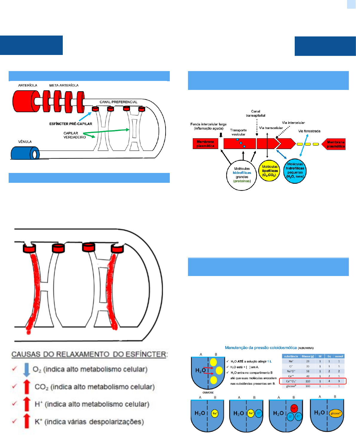 Rúbia Rogovski I Medicina Veterinária UFRGS Fisiologia Veterinária - Cardiologia Microcirculação ESQUEMA BÁSICO VASOMOÇÃO • No mesmo leito capilar, num dado momento, alguns capilares tem sangue no seu interior e outros não, conforme a necessidade metabólica. VIAS DE TRANSPORTE DE MOLÉCULAS PELO ENDOTÉLIO • Moléculas hidrofílicas grandes não passam. • Citocinas pró inflamatórias fazem contração das células e isso abre espaço entre elas para passar as células de defesa. • Sinusal = vaso MANUTENÇÃO DA P COLOIDOSMÓTICA/ONCÓTICA • É dada pela albumina. • Solução coloidal é aquela em que a fase (limite entre os compostos da mistura) só são observadas através de microscopia. A fase entre proteínas e o líquido intracelular é somente vita com ME. • Oncos = massa, tumor Rúbia Rogovski I Medicina Veterinária UFRGS Fisiologia Veterinária - Cardiologia OSMOLALIDADE X OSMOLARIDADE • Osmolalidade = 1 osmol de soluto dissolvido em cada kg de água. • Osmolaridade = 1 osmol de soluto dissolvido em cada L de água. PRESSÃO EFETIVA DO CAPILAR EXTREMIDADE ARTERIAL • Qualquer líquido intersticial é negativa, ou seja, puxa água do capilar. • No cálculo somamos toda que puxam água do capilar e tiramos a diferença da que puxa água pro capilar. • 13 mmHg a favor da retirada de água. EXTREMIDADE VENOSA • 7 mmHg a favor da entrada de água. • Sai com 10 pois perdeu água ao longo do capilar. SISTEMA LINFÁTICO • Cava cranial – pega a linfa de volta pra circulação. Rúbia Rogovski I Medicina Veterinária UFRGS Fisiologia Veterinária - Cardiologia