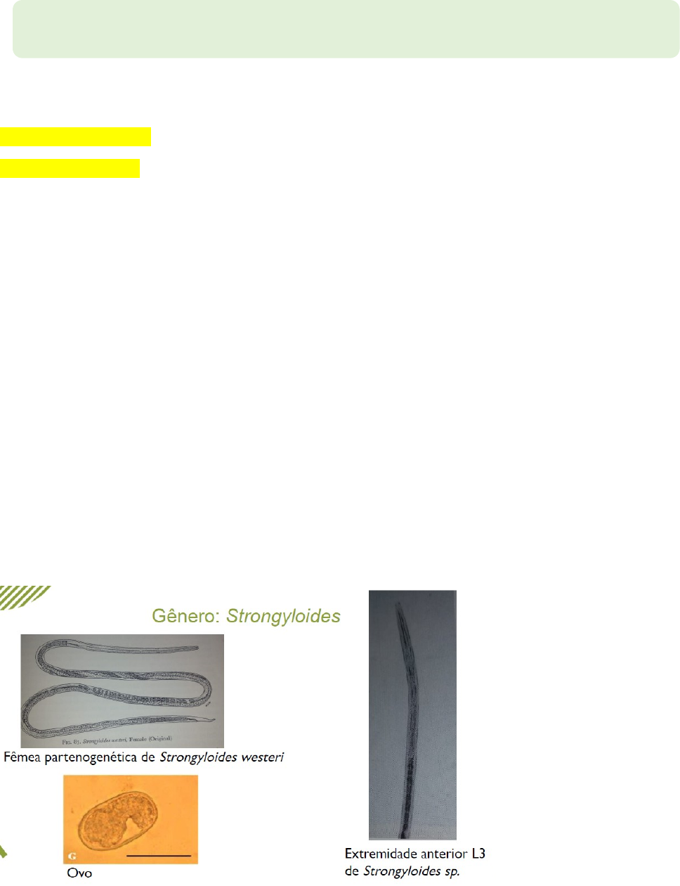 Família: Strongyloididae Classe: Nematoda Superfamília: Rhabditoidea Família: Strongyloididae Gênero: Strongyloides - Medem menos de 1 cm - Formas de vida livre ♀ e ♂, possuem esôfago com um bulbo posterior - Formas parasitárias apenas ♀ (que são partenogenéticas), possuem esôfago cilíndrico e longo Espécies: S. papillosus (ruminantes e coelhos), S. westeri (equinos), S. ransomi (Suínos), S. stercoralis (carnívoros e homem), S. avium (aves), S. ratti (roedores). Os ovos são pequenos de casca fina, elípticos e embrionados. Os ovos dão origem a macho de vida livre quando haploides, fêmeas de vida livre quando diplóide e fêmeas partenogenéticas quando triplóide. Apenas a fêmea partenogenética pões ovos dos 3 títulos. As fêmeas partenogenéticas habitam as criptas do Intestino delgado, as fêmeas partenogenéticas se inserem nas criptas da primeira porção do duodeno; vivendo e se alimentando neste local. Nas fezes de herbívoros o que vão sair são os ovos embrionados e em carnívoros, suínos e humanos o que sai nas fezes são mais larvas de primeiro estágio (L1). Biologia - As fêmeas parasitas partenogenéticas põem ovos pequenos, elípticos e larvados ou embrionados com casca fina. - Ovovivíparas (põem ovos embrionados) - Habitam as criptas do ID, as fêmeas partenogenéticas se inserem nas criptas da primeira porção do duodeno; vivendo e se alimentando neste local. Ciclo biológico Ciclo direto (fêmeas partenogenéticas) e indireto (com machos e fêmeas de vida livre) Infecção por ingestão de ovos ou penetração de filarioide infectante na pele L1 é liberada pelas fezes no solo → L1 rabditóide (esôfago rabditoide do esôfago) → L2 → L3 filarióide infectante (esôfago cilíndrico ou filarióide longo e não possui cauda do bainha) → pele → circulação → pulmão → L4 → faringe deglutidas → ID fêmeas partenogenéticas : ciclo direto - Os ovos embrionados das espécies parasitas de herbívoros são eliminados com as fezes. - Nos carnívoros, suínos e homem, os ovos eclodem na mucosa intestinal, as L1 são liberadas para o exterior no animal junto com as fezes. - Esse desenvolvimento no meio ambiente é dependente de temperatura, umidade e oxigenação, é fomentado muito bem em climas tropicais e em temperaturas acima de 25°C. A L3 penetra no animal através da pele (infecção ativa), chega na circulação, vai para os pulmões, passa pela faringe e são ou expelidos ou deglutidas, se forem deglutidas vão para o intestino delgado e originam as fêmeas partenogenéticas. - Pode ocorrer do ovo eclodir, ter a larva 1, 2, 3 e 4 e dar origem a fêmea e macho de vida livre (ficam no meio ambiente), a fêmea de vida livre tem esôfago rabditóide como os machos, diferente das partenogenéticas de esôfago filarióide. - O ovo pode ser de 3 tipos, geneticamente determinados (por isso ocorre esse tipo de evolução) · Triploide - fêmeas partenogenéticas -> ovovivíparas (põem ovos embrionados) · Diploide - fêmeas de vida livre · Haploide - machos de vida livre 1. Forma partenogenética no lume do intestino delgado 2. Ovo – eliminado nas fezes 3. Larva rabditóide 4. Macho de vida livre (n) 5. Fêmea de vida livre (2n) 6. Ovo – de geração livre 7. Larva filarioide 8. Larva filarioide penetrando na pele 9. Larva atinge a circulação 10. Larva nos pulmões 11. Larva, pela traquéia, atinge o tubo digestivo e se desenvolve para fêmea partenogenética 12. Larva filarioide penetrando na mucosa oral. 13. Larva se desenvolve pra forma partenogenética, diretamente. Em sala: Ciclo com migração Ocorre primeiramente a ingestão ou penetração da L3 na pele que chega a corrente sanguínea e migra para o pulmão. Lá a L3 muda para L4 e ela vai para laringe ou faringe, subindo as vias aéreas inferiores, e pode ser deglutida ou expectorada. Se deglutida, segue pelo trato gastrointestinal, no duodeno a L5 ou fêmeas partenogenética onde vai se fixar e vai colocar ovos. Penetração por mucosa oral? Acho q sim. Por L3 N +2n = 3n (paternogenéticas) e as 3n nem sempre dão origem a L3 Se está no duodeno, é paternogenética. Epidemiologia O período pré-patente (PPP) é o período desde a penetração até comprovação de que o parasita está no hospedeiro. O PPP dos estrongiloides é de 10-17 dias, ou seja, 3 semanas. Caracterizado como curto. Strongyloides stercoralis é comum em cães e no homem, porém, esse gênero apresenta variações geográficas e de espécie, patológicas ou não. É comum em aves e roedores além do homem, suínos e cão - Animais jovens - Condições ambientais (L3 e ovos pouco resistentes, pois não retém a cutícula do estágio anterior) - Condições de manejo - Reservatório de larvas são as mães Usa-se corticoides como tratamento *Hormônios estimulam o desenvolvimento das larvas nas espécies prenhes podem passar para o filhote pelo colostro durante a amamentação. Diagnóstico (laboratorial/parasitológico) - Pelo exame de fezes onde são encontrados os ovos (através de sua característica: pequenos embrionados e de casca fina) - Método de Wyllis- Molay (método de flutuação, pois os ovos são leves e flutuam) usado em ruminantes, equinos, suínos, aves e roedores. - Método de Gordon (utiliza a câmara) usado em herbívoros - Método de McMaster (método de flutuação), quantitativo - Método de Baermann- Morais, identifica-se a L1, usado em carnívoros e onívoros. Nesse caso são encontrados as larvas de primeiro estágio (esôfago rabditiforme) e não ovos nas fezes. Família: Trichostrongylidae Superfamília: Trychostrongyloidea Família: Trychostrongylidae Gêneros: Trichostrongylus Haemonchus Ostertagia Cooperia Nematodirus Hyostrongylus Características: - São nematódeos gastrointestinais (estômago e intestino delgado) de ruminantes e no estômago de equinos, suínos e coelhos; - São nematódeos pequenos e dióicos; - Os machos possuem uma bolsa copuladora cujas ca
