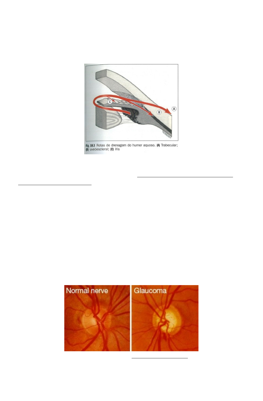 Glaucoma → Observação: · A drenagem trabecular pode ser aumentada por meio de medicamentos (mióticos, simpaticomiméticos), trabeculoplastia a laser e cirurgia de drenagem. · A drenagem uveoescaleral é reduzida com mióticos e aumentado com atropina, simpaticomiméticos e análogos da prostaglandina. Essa drenagem ocorre pela circulação venosa no corpo ciliar, coróide e esclera. - Doença grave ocular por gerar cegueira irreversível. · Doença ocular costumeiramente ligada aos níveis de pressão intraocular (PIO) que leva a dano direto ao nervo óptico e consequente dano irreversível à visão. - Toda vez que lesa um nervo perde-se a função daquele nervo. - A pressão intraocular é quase sempre elevada, mas não obrigatoriamente; a pressão intraocular começa a fazer uma pressão no n. óptico, e por ser um nervo sensível, começa a morrer. Vai lesando cada vez mais e a pessoa vai ficando cega (de fora para dentro). → A PIO é determinada pelo balanço entre a taxa de secreção e a taxa de drenagem do humor aquoso, que, por sua vez, está relacionado a resistência encontrada nos canais de drenagem e ao nível da pressão venosa episcleral. → A PIO normal varia de acordo com a hora do dia, com os batimentos cardíacos, o nível de pressão arterial e a respiração. Tem uma tendência de ser maior pela manhã e menor à tarde e à noite. Olhos hipertensos ou glaucomatosos, demonstram maior flutuação. · Maior causa de cegueira irreversível no mundo. - Essa parte “branquinha” no meio é chamada de escavação fisiológica (até 0,3 de medida). - Na imagem do glaucoma, percebe-se que essa área de escavação fisiológica aumentou de tamanho, é uma área de necrose do n. óptico. - Área bem branca, “brilhante” de tão branco → paciente com glaucoma. Dano do Glaucoma → Cegueira Irreversível - Aquilo que o paciente vai perdendo de visão, não volta mais. · Evolução do dano ao nervo óptico vai levando a perda progressiva do campo visual “de fora para dentro” → doença silenciosa. · Fase avançada: campo visual tubular (pré cegueira completa) - No estágio 4, o paciente já está batendo nas coisas. Mas, não fica assim, a visão se perde completamente. Fatores de Risco . · Pressão ocular elevada - Não quer dizer que sempre que o paciente tiver pressão ocular elevada, ele terá glaucoma. · Idade acima de 40 anos → Idosos: PIO média elevada, especialmente em mulheres. → Indivíduos do sexo masculino apresentam maior probabilidade de conversão. · Afrodescendentes · História familiar de glaucoma · Miopia · Uso de Topiramato (enxaquecas/anticonvulsivante) → risco de glaucoma agudo · Trauma ocular · Diabetes (glaucoma neovascular) · Uso prolongado de corticosteróides tópicos/sistêmicos: pacientes que usam cortisona (colírio/oral) - Paciente que tem lúpus ou que tem outras doenças em que o sistema imune tem que ser combatido através do uso de corticoide sistêmico ou tópico. - Doença é silenciosa, é de fora para dentro; não consegue-se perceber que tem até que chegue em um estágio mais avançado. Tipos de Glaucoma . · Glaucoma Crônico de Ângulo Aberto (cerca de 80% dos casos) · Glaucoma Agudo de Ângulo Fechado · Glaucoma Congênito · Glaucoma de Pressão Normal · Glaucoma Secundário (traumas, diabetes, tumores, uso de medicamentos oculares/sistêmicos [ex. Topiramato → uso em enxaquecas], casos avançados de catarata [“empurra” ângulo iridocorneano → diminui drenagem humor aquoso → aumento da PIO]). GLAUCOMA AGUDO (ÂNGULO FECHADO) · Tipo de glaucoma normalmente gerador de dor. · Níveis pressóricos elevados (acima de 30 mmHg) · O tratamento deve ser imediato com drogas que visam abrir o ângulo iridocorneano e permitir a drenagem do humor aquoso. - O tratamento é desentupir o “ralo”. - Deixa a malha trabecular drenar o humor aquoso, com o uso dessas drogas (ex. manitol, diamox ou acetazolamida, pilocarpina). · Drogas como Topiramato (anticonvulsivante/ antienxaqueca) podem levar ao glaucoma agudo. - Antes de passar, fazer uma consulta para verificar se o ângulo já não é pequeno e vai ocluir. - Humor aquoso (câmara anterior) produzido no corpo ciliar. A mesma proporção que é produzido tem que ser drenado. - O nosso “ralinho” (malha trabecular) para ser drenado esse humor aquoso está entupido. Com isso, começa-se a aumentar a pressão do olho, e esse aumento de pressão gera muita dor. Lembrar… · O humor aquoso é produzido no corpo ciliar e preenche a câmara anterior. · A PIO (pressão intraocular) decorre de um equilíbrio na sua produção e sua drenagem (escoamento). · Excesso na produção ou dificuldade no escoamento = aumento da PIO. - Imagem Esquerda: mostrar que tem uma interface entre a córnea e a íris; mostrar que existe a câmera anterior (preenchida pelo humor aquoso- produzido no corpo ciliar). - Na mesma proporção que é produzido tem que ser drenado. - Ou o humor aquoso está sendo produzido em excesso (corpo ciliar produzindo muito humor aquoso) ou ângulo iridocorneano/ malha trabecular é muito estreita e não consegue drenar. Ou existe um excesso de produção ou dificuldade de escoamento. A resultante será o aumento da pressão, pois o olho não tem aonde transbordar, então, ele vai como se fosse “encher como uma bexiga”, a pressão será disseminada; e a estrutura mais sensível é o nervo óptico. - Esse glaucoma de ângulo fechado costuma gerar muita dor. Glaucoma Agudo → não usar midriático (não dilatar a pupila) - O paciente pode já ter fatores anatômicos, uma câmara anterior rasa (ângulo diminuído) e quando dilata essa pupila termina de ocluir, o que aumenta a pressão. - Não dilate a pupila sem saber como é esse ângulo iridocorneano. GLAUCOMA CRÔNICO DE ÂNGULO ABERTO · 80% dos casos · É o mais comum · Assintomático (dificulta o diagnóstico precoce) · Tratamento feito em geral com colírios antiglaucomat