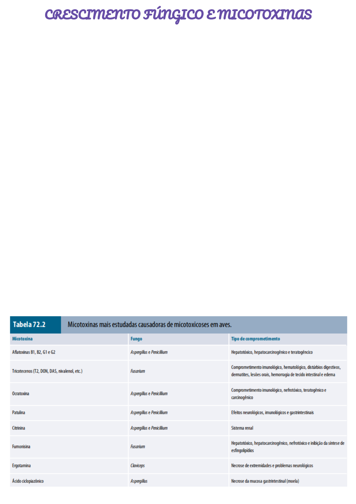 CRESCIMENTO FÚNGICO E MICOTOXINAS ● Substâncias tóxicas produzidas pôr fungos. ● Presentes em mais de 30% dos grãos produzidos no mundo. ● Efeitos: imunossupressão, alterações metabólicas e carcinogênese. ● Ocorre interação de espécies fúngicas no mesmo alimento. ● A contaminação pode ocorrer em qualquer fase da produção de grãos e em frutas e cereais que crescem naturalmente, sem cultivo. ● Produção aumenta com umidade e temperatura. ● Antes do fungo iniciar a produção de micotoxinas, provoca danos físicos e perdas na qualidade nutricional do alimento. ○ Atividade metabólica dos fungos está associada com respiração aeróbica, a deterioração do alimento é uma reação de oxidação de gorduras e carboidratos na presença de oxigênio, resultando em ácido carbônico, água, calor e estrutura fúngica. ■ Diminui o teor de gordura dos alimentos e a energia. ● Principais fungos toxicogênicos: ○ Aspergillus. ○ Penicillium. ○ Fusarium. ● Alteram estrutura e sabor, porém aves tem poucas papilas gustativas. ● Intoxicação aguda: diarreia, hemorragia e morte. ● Intoxicação crônica: mais comum, alterações no metabolismo que resultam em síndromes entéricas e podem causar neoplasias. EFEITOS NO TGI E GLÂNDULAS ANEXAS ● Ingestão exposição do epitélio digestivo a elevada concentração de metabólitos. ● Tricotecenos: efeito tópico sobre as células, pode causar necrose. ● Fumonisinas: podem afetar a resistência elétrica entre as camadas de células intestinais, afetando a barreira intestinal contra patógenos e a regulação do equilíbrio osmótico. ● Clínica: enterite - agravada se tiver interação bacteriana. ● Lesões intestinais microscópicas: redução na altura do vilo ou na profundidade da cripta. ○ Aflatoxina e ocratoxina: ME varredura - extrusão celular sobre o topo do vilo. ● Ácido ciclopiazônico: produzido pelo Aspergillus - necrose das mucosas do TGI e tecido hepático, lesões na moela. ● Maior parte das toxinas é lipossolúvel rapidamente absorvidas pelas células intestinais circulação sistêmica através do sistema porta-hepático fígado. ● Lesões microscópicas crônicas: ○ Megalocitose (macrocitose) . ○ Vacuolização de hepatócitos com proliferação de ductos biliares. Necrose da mucosa oral em galinhas alimentadas experimentalmente com ração contaminada com tricotecenos. Esteatose hepática em galinhas alimentadas com milho naturalmente contaminado com aflatoxina e fumonisina. Aumento de volume dos órgãos e o aspecto pálido. EFEITOS NO SISTEMA RENAL ● Ocratoxina, patulina, oosporina, citrinina e aflatoxina: lesão grave nos rins. ● Ocratoxina: nefrotoxina, teratogênica (dano ao feto) e carcinogênica. ● Patulina: afeta sistema neurológico, imunológico e gastrintestinal. ● Ocratoxina, citrina e oosporina: ○ Macro: rins pálidos, edemaciados e aumentados de tamanho. ○ Micro: degeneração dos túbulos contorcidos proximais e espessamento da membrana glomerular, com acúmulo de material proteico no lúmen glomerular. EFEITOS NO SISTEMA REPRODUTIVO ● Zearalenona: produzida pelo Fusarium. Toxina estrogênica: ○ Induz sinais de estro em porcas. ○ Vulvovaginite e anormalidade reprodutivas em ratos jovens e porcas. ○ Efeito em aves não está claro. ■ É a micotoxina de menor toxicidade para aves, pois pode ser degradada em dois metabólitos e produz mais o que tem menor potencial estrogênico, precisaria de níveis muito altos de zearalenona para ter algum prejuízo como suínos. ● Alcalóides de ergot: produzidos pelo Claviceps sp. ○ Gangrena, aborto, convulsões, supressão de lactação, hipersensibilidade e ataxia. ○ Encontrados no sorgo e trigo. ○ Em aves causam necrose de crista e barbela em galos e galinhas reprodutoras. ○ A metabolização pelo fígado pode provocar formação de radicais livres que podem afetar a viabilidade de espermatozóides e óvulos. ● Aurofusarina: produzida pelo Fusarium graminearum. ○ Raramente descrita. ○ Diminui a fertilidade e eclodibilidade de ovos de galinhas e codornas. EFEITOS NA IMUNIDADE ● Atrofia e esgotamento células em órgãos linfóides. ● Aflatoxinas e ocratoxinas: interferem na síntese protéica causando supressão imunológica. ● Podem comprometer a imunidade local no sistema linfóide associado ao TGI (GALT). ● Baixa regulação da resposta imune. ● Fumonisinas: ○ Estudos em frangos de corte sugerem que podem reduzir a eficiência vacinal. ○ Potentes inibidoras da enzima esfinganina N-aciltransferase: podem comprometer a membrana celular de células imunes e interferir na capacidade fagocítica de macrófagos. ● Deoxinivalenol e outros tricotecenos: ○ Mecanismo de imunomodulação celular e molecular. ○ Exposição a baixas doses: aumento das reações de transcrição e pós-transcrição de genes inflamatórios que promovem a regulação da expressão das citocinas com concomitante estimulação imune. ○ Exposição a altas doses: apoptose dos leucócitos com concomitante supressão imune. DIAGNÓSTICO ● Clínica: ○ Quadro multissistêmico com síndromes inespecíficas: diarreias, imunossupressão, infecções secundárias… ○ Alterações de comportamento sem causa aparente: apatia, tendência a buscar abrigo, sensibilidade a luz… ○ Qualidade da ração. ● ELISA ou HPLC: ○ Detecção de micotoxinas no alimento, mas nem sempre é possível detectar, pôr isso não serve de base. ● Estudos retrospectivos de metabólitos tóxicos em fígado de animais que morreram naturalmente: ○ Para gerar dados sobre essa enfermidade em aves silvestres. TRATAMENTO ● Não tem. ● Paliativo e retirada do alimento contaminado. PREVENÇÃO ● Qualidade da matéria prima e produção dos alimentos: ○ Ingredientes armazenados pôr muito tempo fazer tratamento antifúngico com fungistáticos a base de ácidos orgânicos. ○ Limpeza nos locais de ar