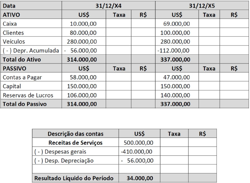 EXERCÍCIOS DE CONVERSÃO A Empresa Canadense é uma controlada da Empresa Brasileira S.A. e atua na prestação de serviços, tendo sua sede em Montreal. A empresa possui corpo gerencial próprio com total autonomia administrativa e operacional, atuando de forma independente da matriz brasileira. A moeda funcional da empresa é o dólar americano, tendo em vista que a maioria de seus contratos é feita com empresas americanas e os preços de seus serviços e seus custos são fortemente influenciados por esta moeda. Os Balanços Patrimoniais da Empresa Canadense, em 31/12/X4 e 31/12/X5, e a Demonstração do Resultado do ano de X5, em dólares, são os seguintes: Balanços Patrimoniais – Empresa Canadense Demonstração do Resultado X5 Informações Adicionais O Capital Social foi integralizado em 11/01/X2 As Reservas de Lucros em 31/12/X4 eram de R$ 130.000,00 As receitas e despesas ocorridas em X5, bem como a cotação do US$ (em reais) nas diversas datas são apresentadas na tabela a seguir: Pede-se: 1. Elaborar a conversão das demonstrações contábeis apresentadas para Reais, de acordo com as normas do CPC 02. 2. Demonstre o cálculo da variação da conta “Ajustes Acumulados de Conversão”. Resolução: ( 1 ) Cálculo do Capital em reais Capital = 150.000 x 2,00 = R$ 300.000 Empresa Canadense - Balanços Patrimoniais 31/12/X4 31/01/X5 Ativo U$ Cotação R$ U$ Cotação R$ Caixa 10.000 2,20 22.000 69.000 2,50 172.500 Clientes 80.000 2,20 176.000 100.000 2,50 250.000 Veículos 280.000 2,20 616.000 280.000 2,50 700.000 (-) Deprec. Acumulada (56.000) 2,20 (123.200) (112.000) 2,50 (280.000) Total do Ativo 314.000 690.000 337.000 842.500 Contas a Pagar 58.000 2,20 127.600 47.000 2,50 117.500 Capital 150.000 (1) 300.000 150.000 (1) 300.000 Reservas de Lucros 106.000 (2) 130.000 140.000 (3) 220.400 Ajuste Acum. Conversão 133.200 204.600 Total do Passivo 314.000 690.000 337.000 842.500 ( 2 ) Valor informado. ( 3 ) Reservas de Lucros (X5) = Reservas de Lucros (X4) + Resultado Líquido (X5) Reservas de Lucros (X5) = 130.000 + 90.400 = 220.400 Empresa Canadense Demonstração de Resultados - 01/01/X5 a 31/01/X5 U$ R$ Receitas de Serviços (4) 500.000 1.212.000 ( - ) Despesas diversas (4) 410.000 (990.000) ( - ) Despesa Depreciação (5) (56.000) (131.600) ( = ) Resultado Líquido 34.000 90.400 (4) Cálculo das Receitas de Serviços e Despesas Gerais em R$ Data U$ Receita de Vendas Despesas gerais U$ R$ U$ R$ 11/02/X5 2,30 100.000 230.000 90.000 207.000 14/07/X5 2,40 180.000 432.000 170.000 408.000 31/12/X5 2,50 220.000 550.000 150.000 375.000 Totais 500.000 1.212.000 410.000 990.000 (5) Cálculo da Despesa de Depreciação em R$ (pela cotação média) Despesa de Depreciação = 56.000 x 2,35 = R$131.600 Análise da variação no “Ajuste acumulado de conversão” Ajuste acumulado de conversão em X4 = 133.200 = 690.800 - 127.600 – 300.000 – 130.000 Ajuste acumulado de conversão em X5 = 204.600 = 842.500 - 117.500 – 300.000 – 220.400 Diferença no Ajuste acumulado de conversão = 204.600 – 133.200 = 71.400 Movimentação nas contas do Patrimônio Líquido Conciliação da C.T.A. Valores em U$ R$ Histórico Valores em R$ R$ Final Valores em R$ (Perda) ou Ganho PL em 31/12/X4 256.000 2,20 563.200 2,50 640.000 76.800 Lucro de X5 34.000 DRE 90.400 85.000 (5.400) Ganho na conversão 290.000 653.600 725.000 71.400
